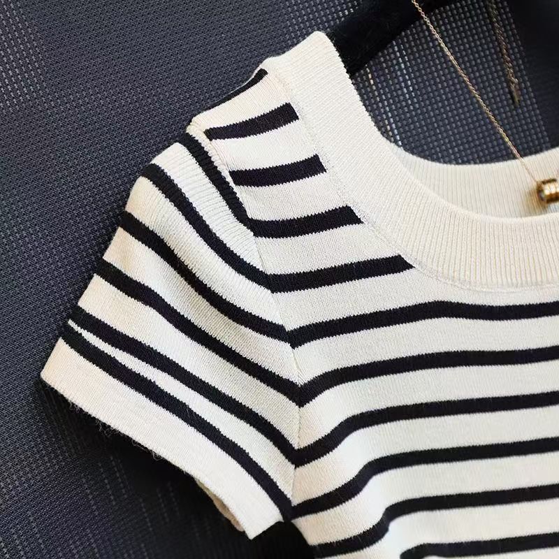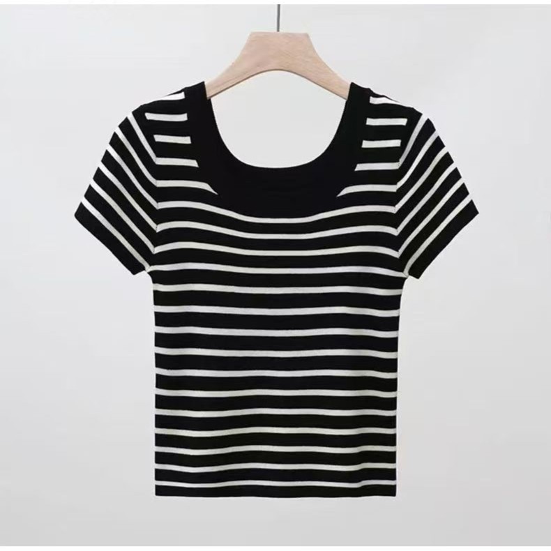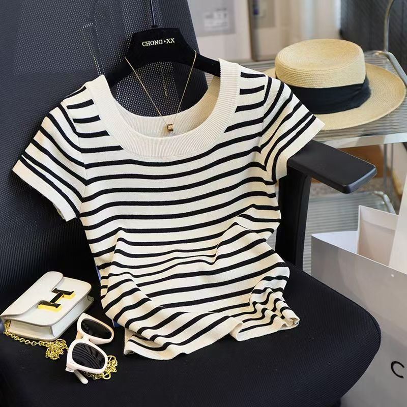여름 니트 스트라이프 프렌치 U넥 블랙 패턴 아이스 실크 티셔츠 슬림핏 샤넬 스타일 빅사이즈 반팔 여성 의류 플라잉 슬리브스토어 가기