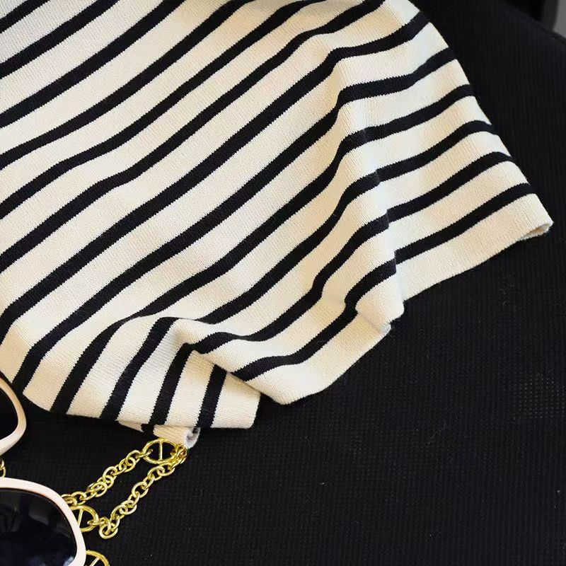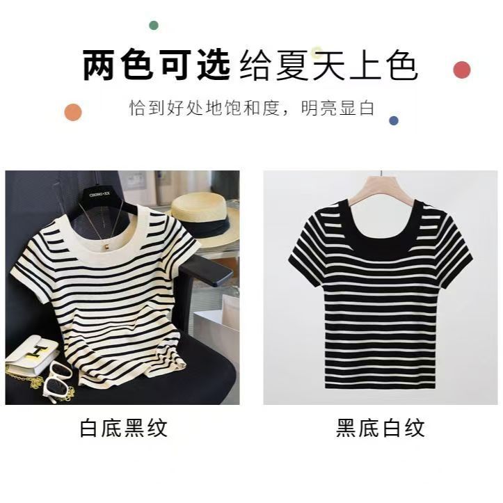 여름 니트 스트라이프 프렌치 U넥 블랙 패턴 아이스 실크 티셔츠 슬림핏 샤넬 스타일 빅사이즈 반팔 여성 의류 플라잉 슬리브