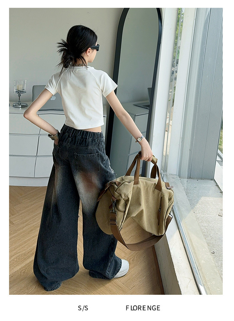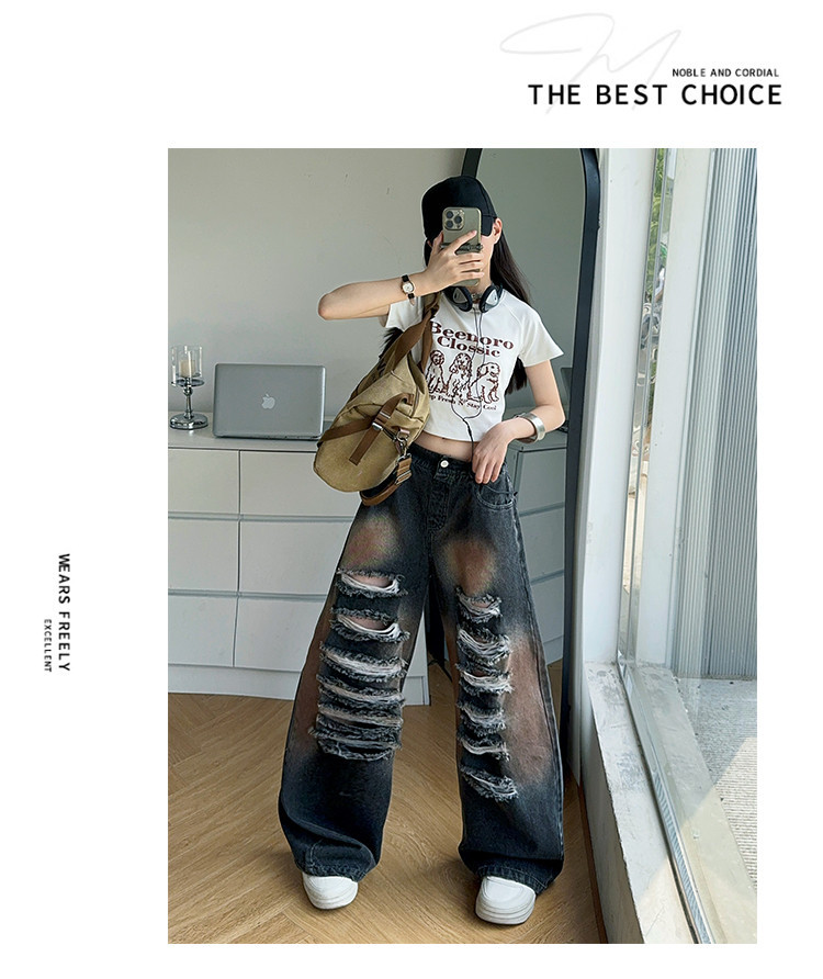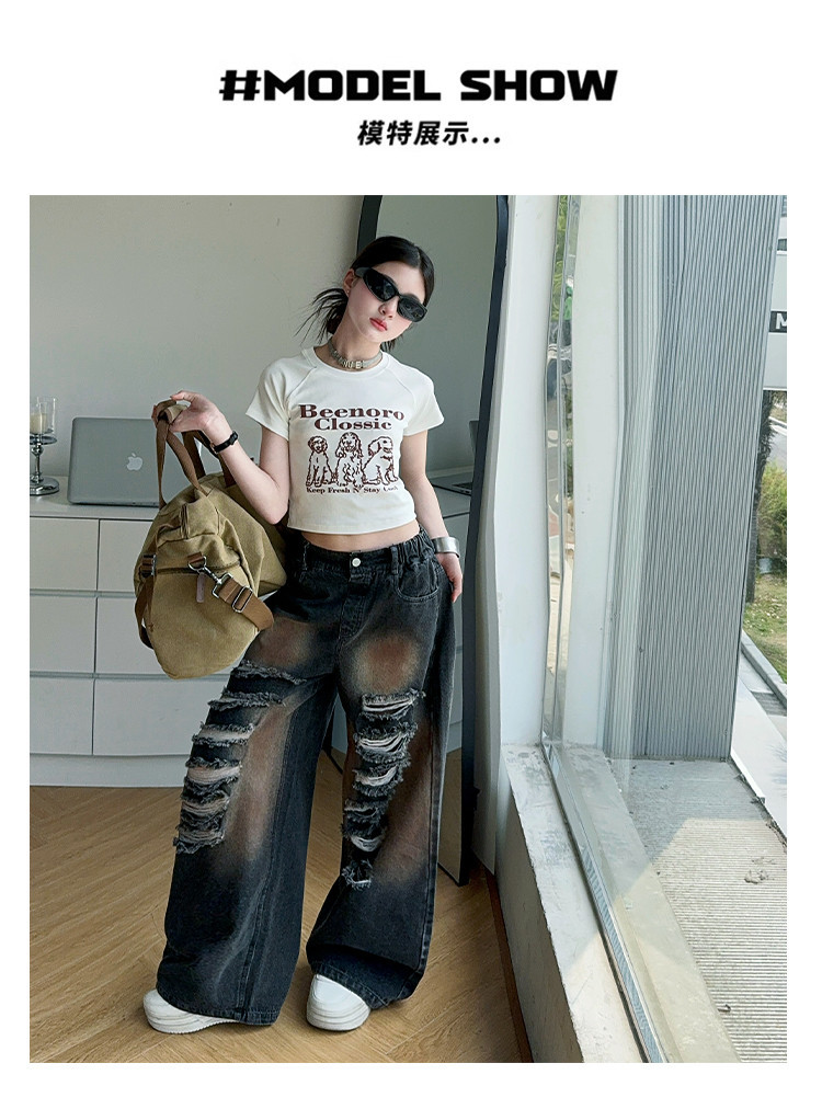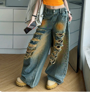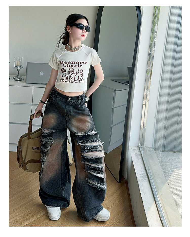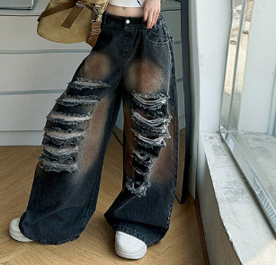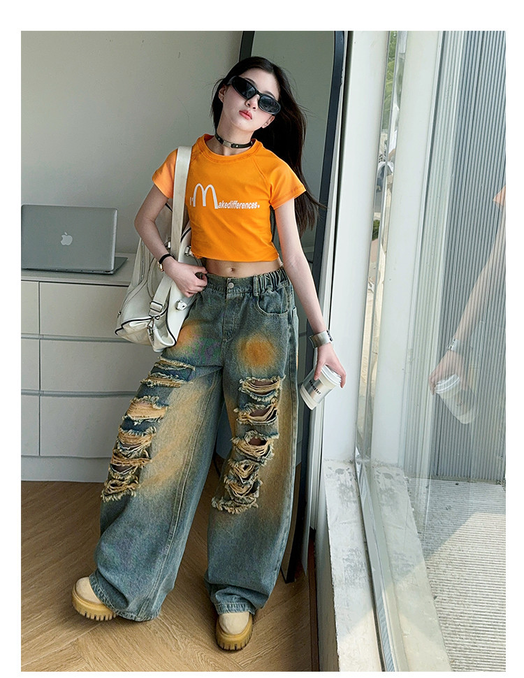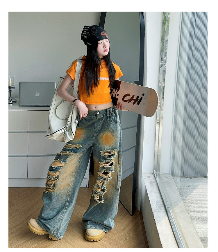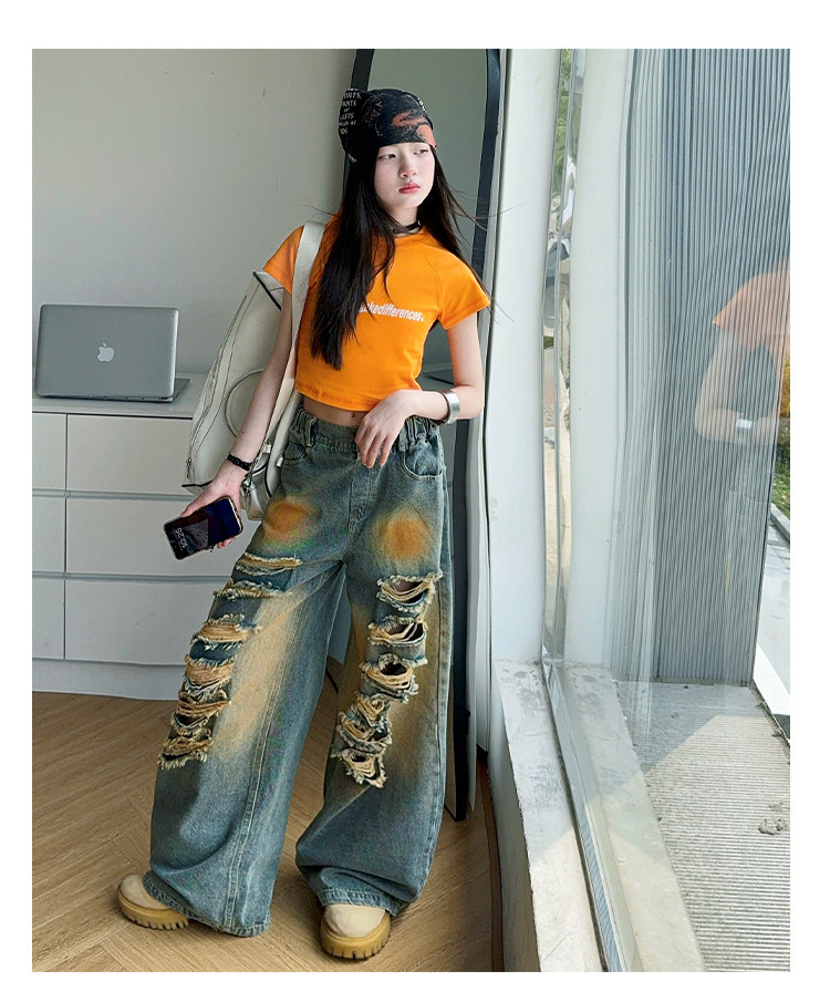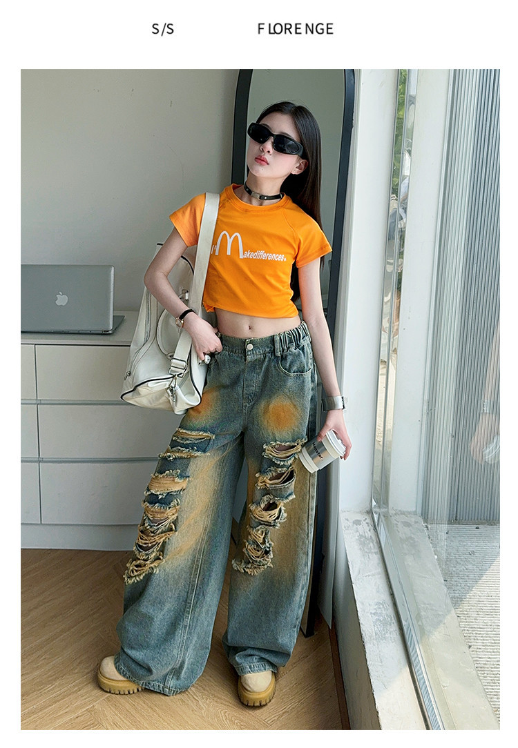 소녀 여름 바지 2025 새로운 어린이 여름 찢어진 청바지 소녀 큰 어린이 서양식 스트레이트 다리 넓은 다리 바지스토어 가기