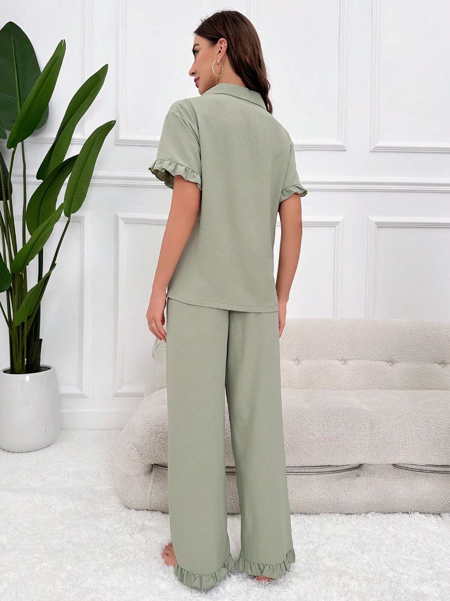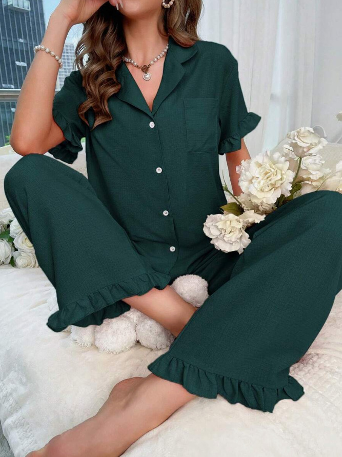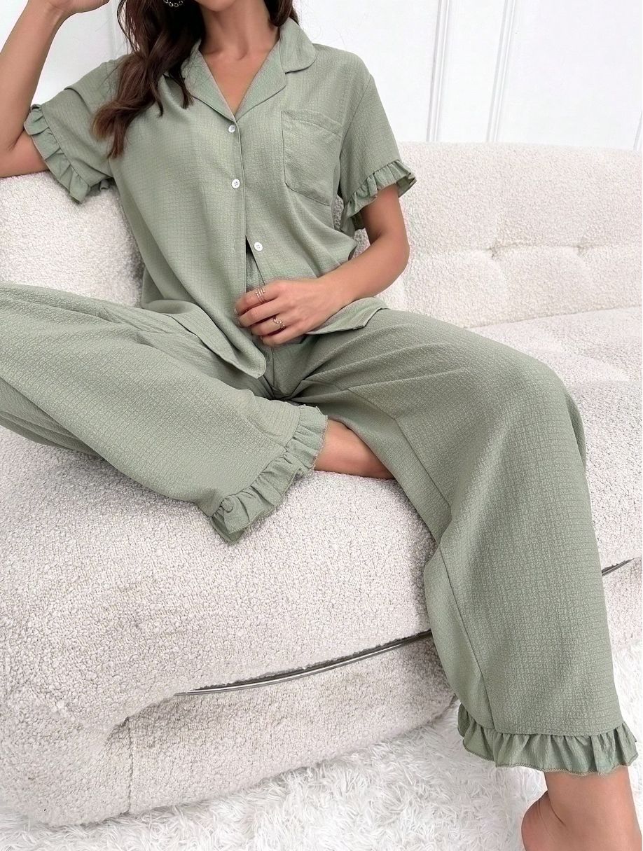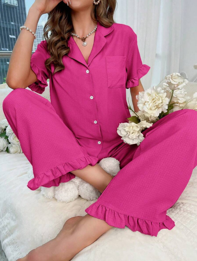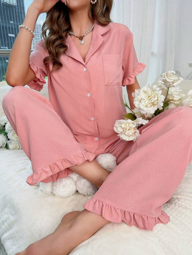 여성을 위한 크로스보더 달콤한 라펠 레이스 잠옷, 봄 여름 새로운 스타일의 고급 유럽과 미국 스타일의 반팔 바지 홈웨어