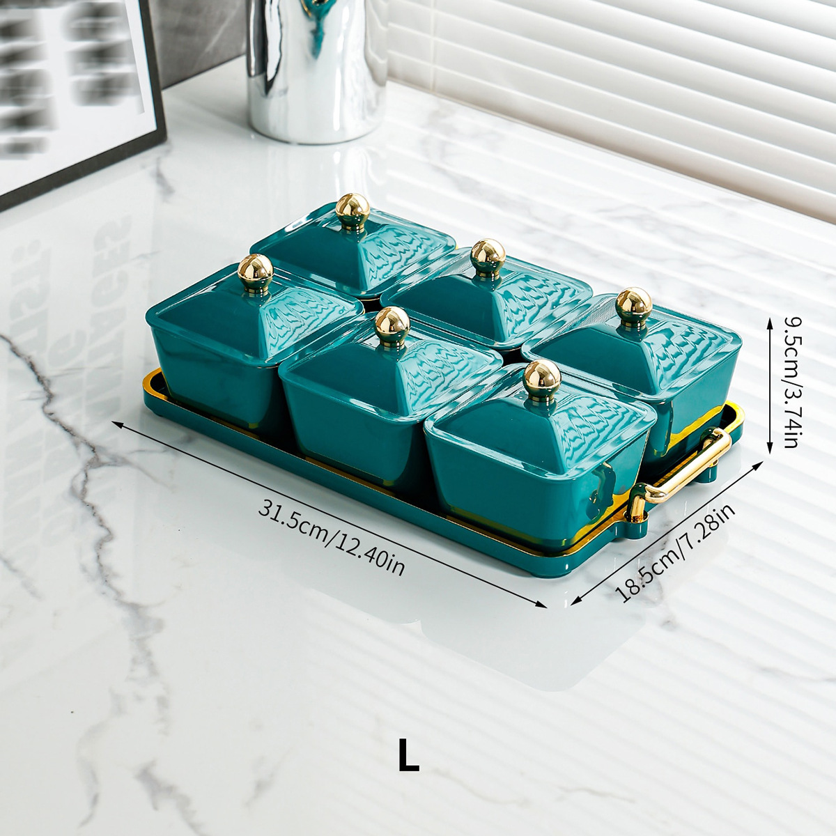 • 에메랄드 작은 귀 6칸 금테 트레이 + 금구슬이 달린 스낵 접시 6개