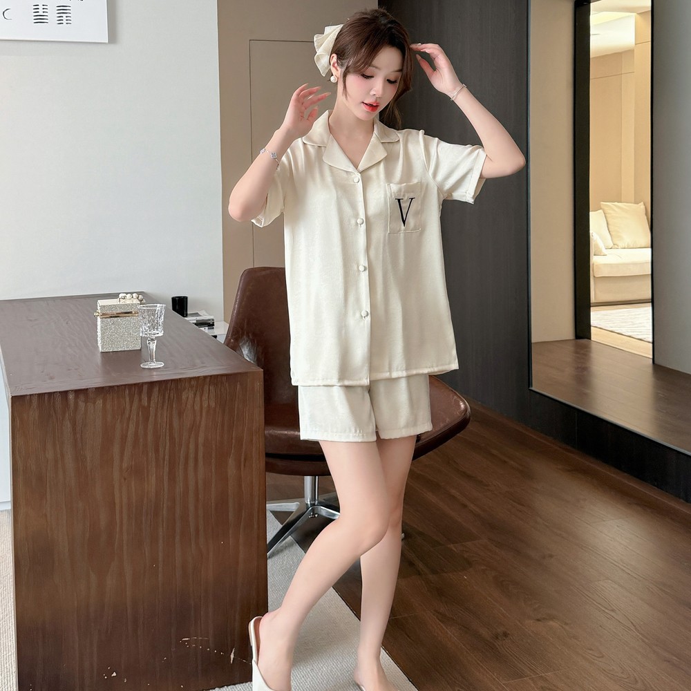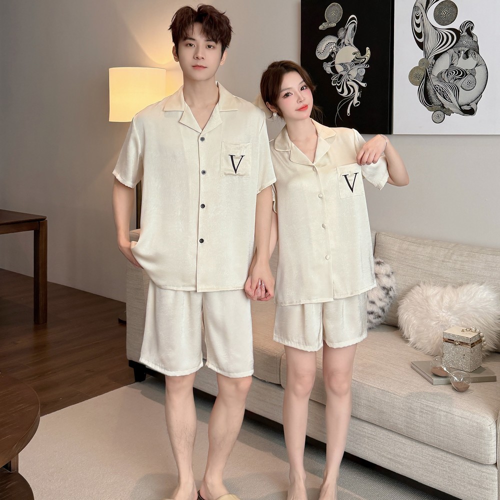 커플 잠옷 2025 봄, 가을 남성의 새로운 얼음 실크 반팔 바지 정장 얇은 여성 가정 의류스토어 가기