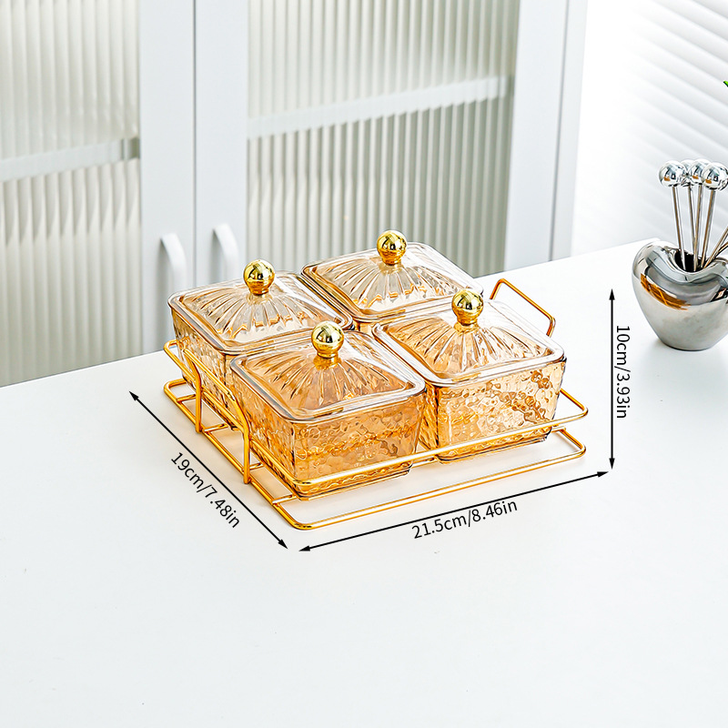 • 골든 랙 [4칸 투명 망치 유리 사각 접시] 뚜껑과 골드 비즈 포함
