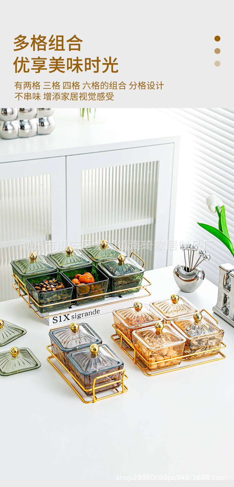 • 골든 랙 [6칸 과일 녹색 망치 유리 사각 접시] 뚜껑과 골드 비즈 포함