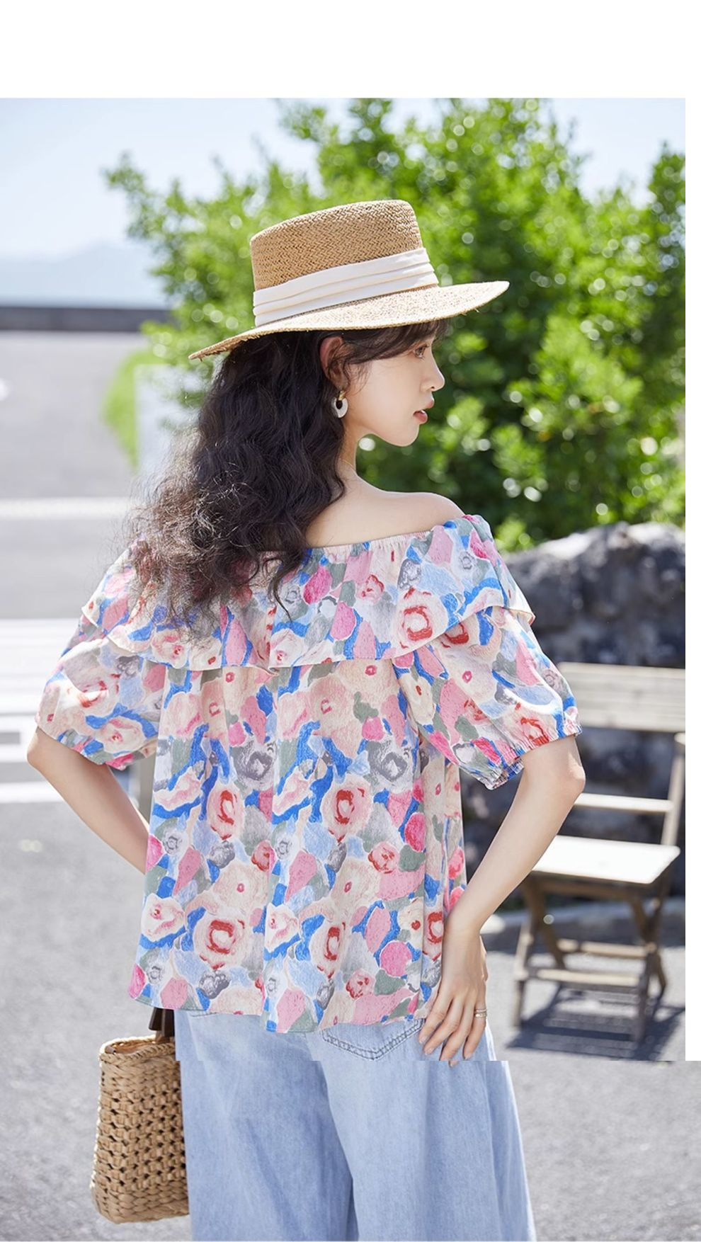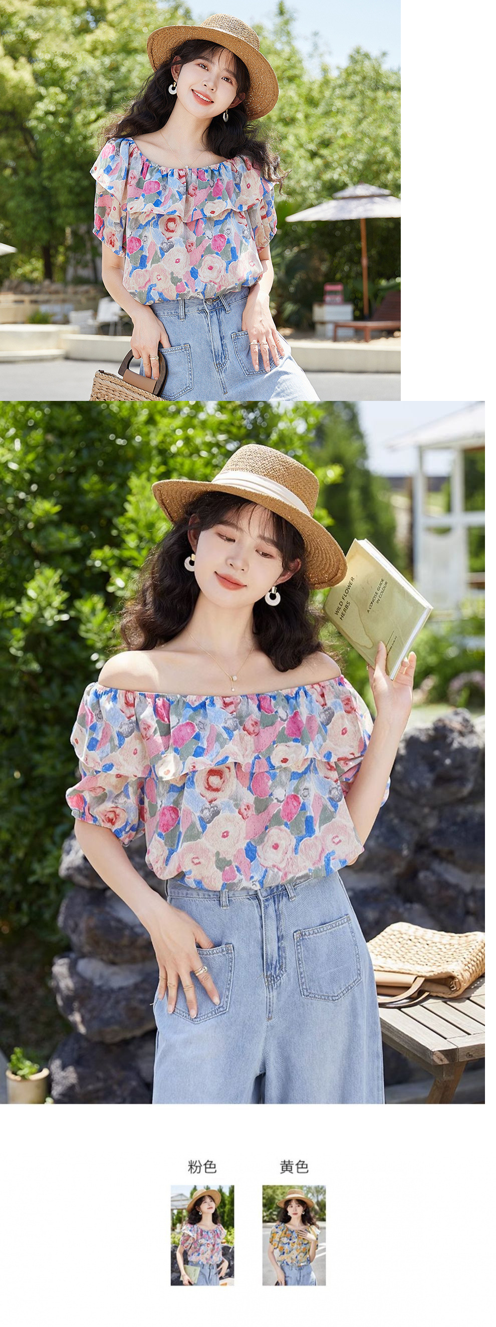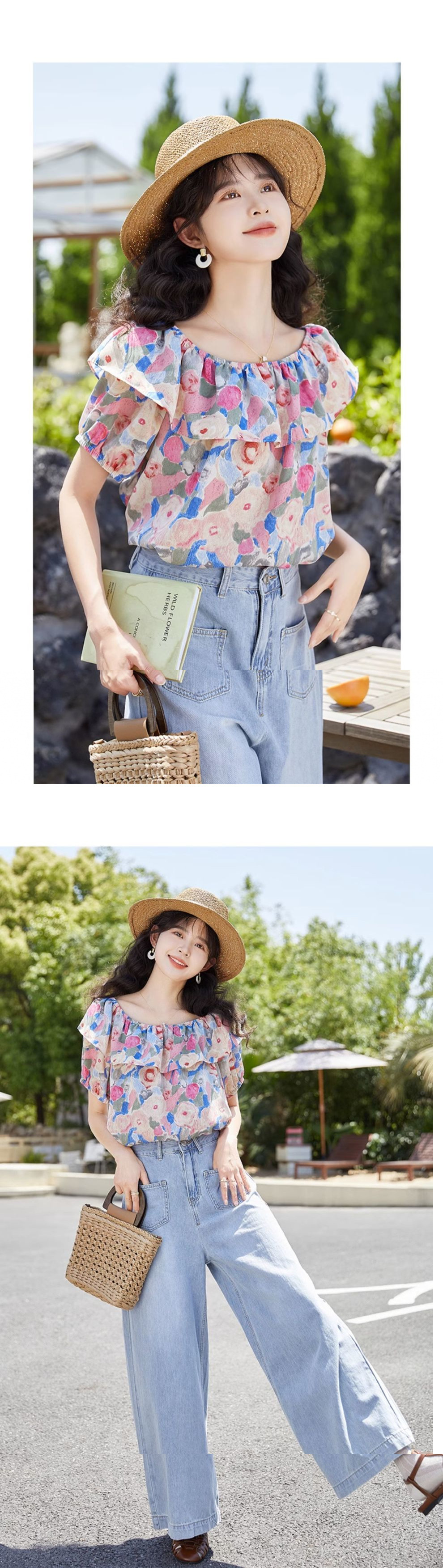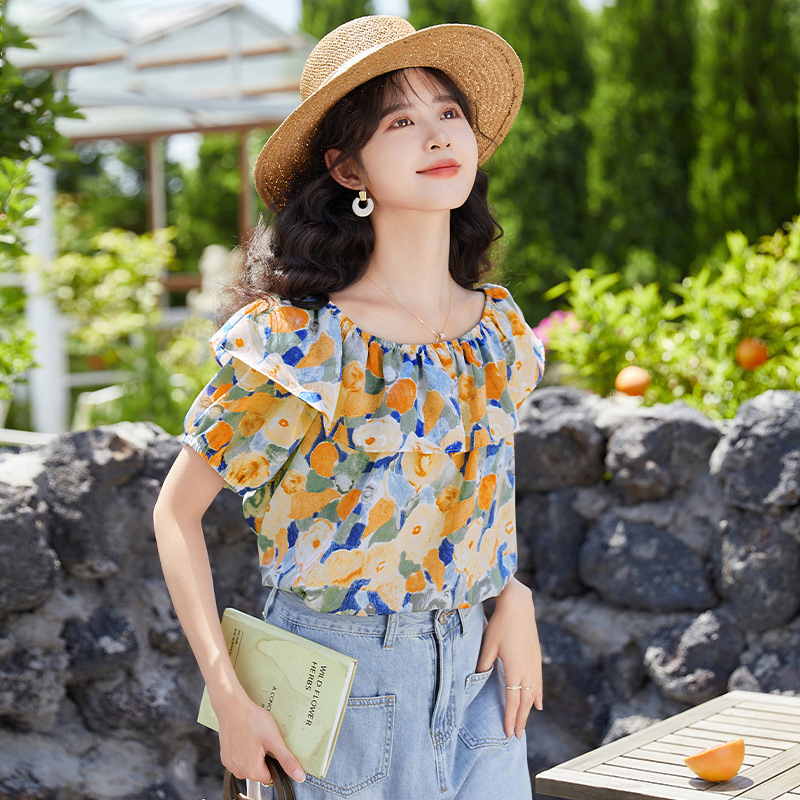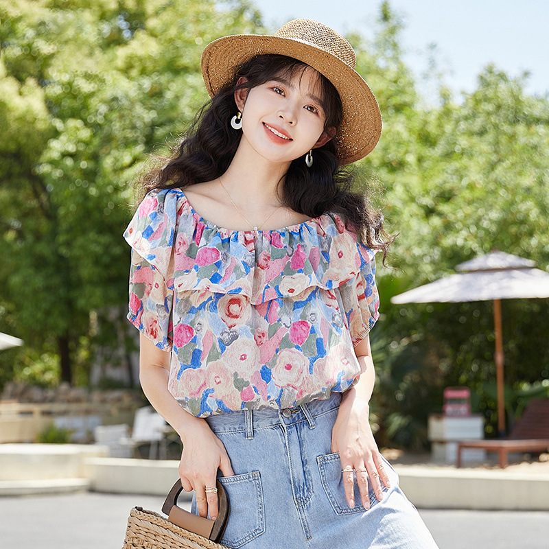 여성을위한 프렌치 원 숄더 퍼프 슬리브 꽃 탑 2025 여름 새로운 디자인 틈새 시장 쉬폰 셔츠스토어 가기