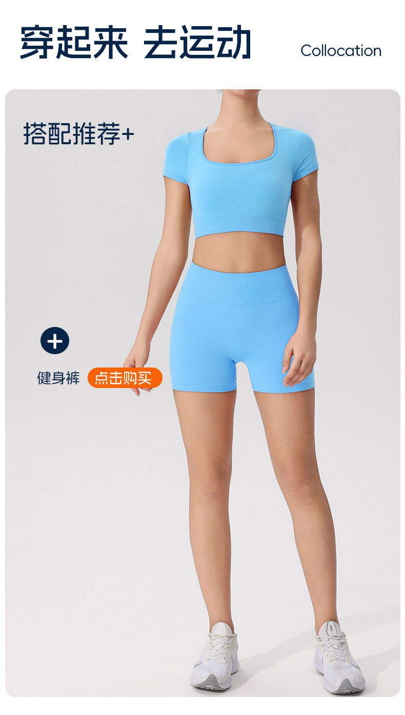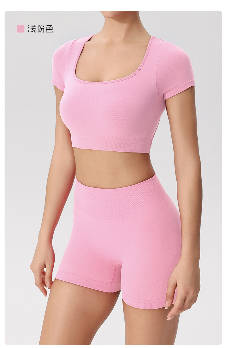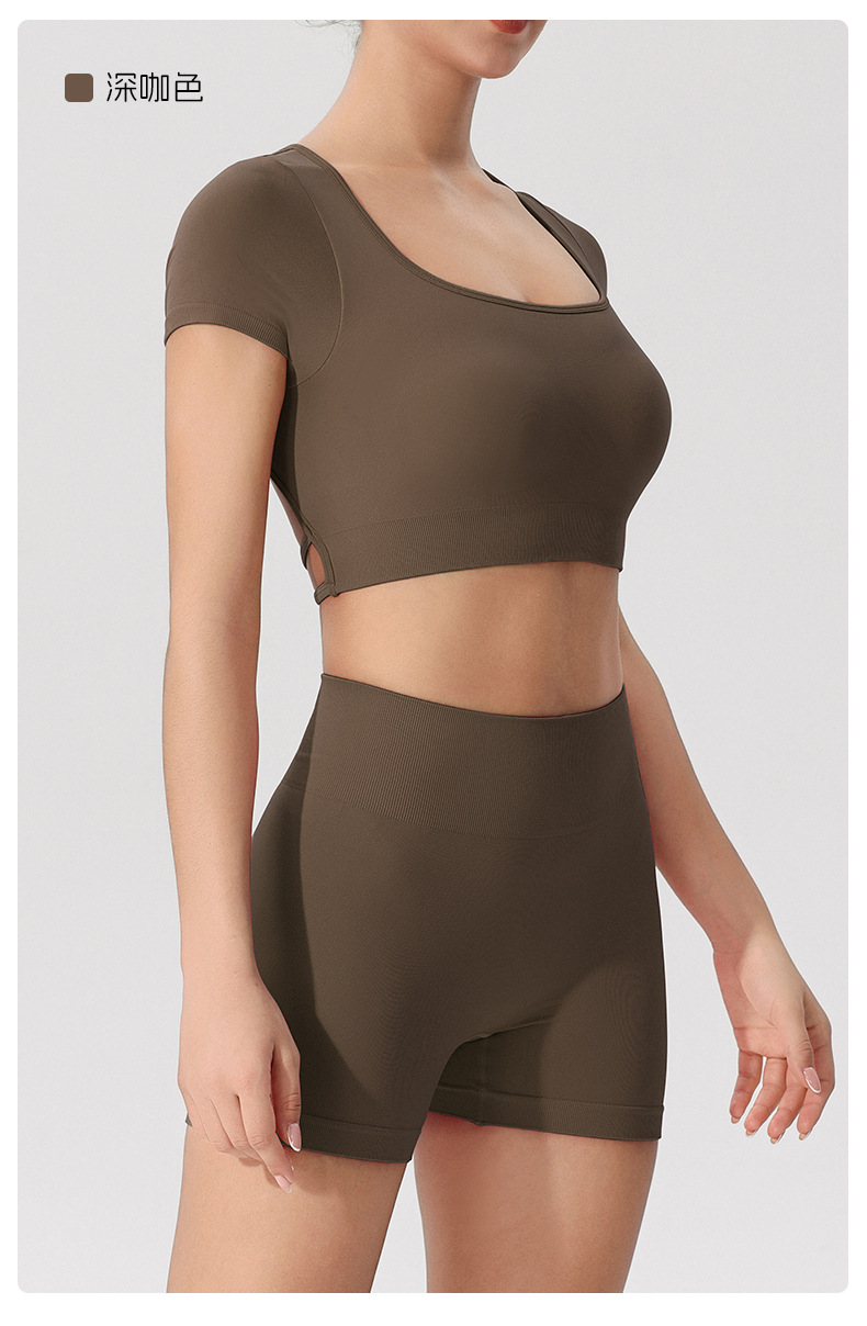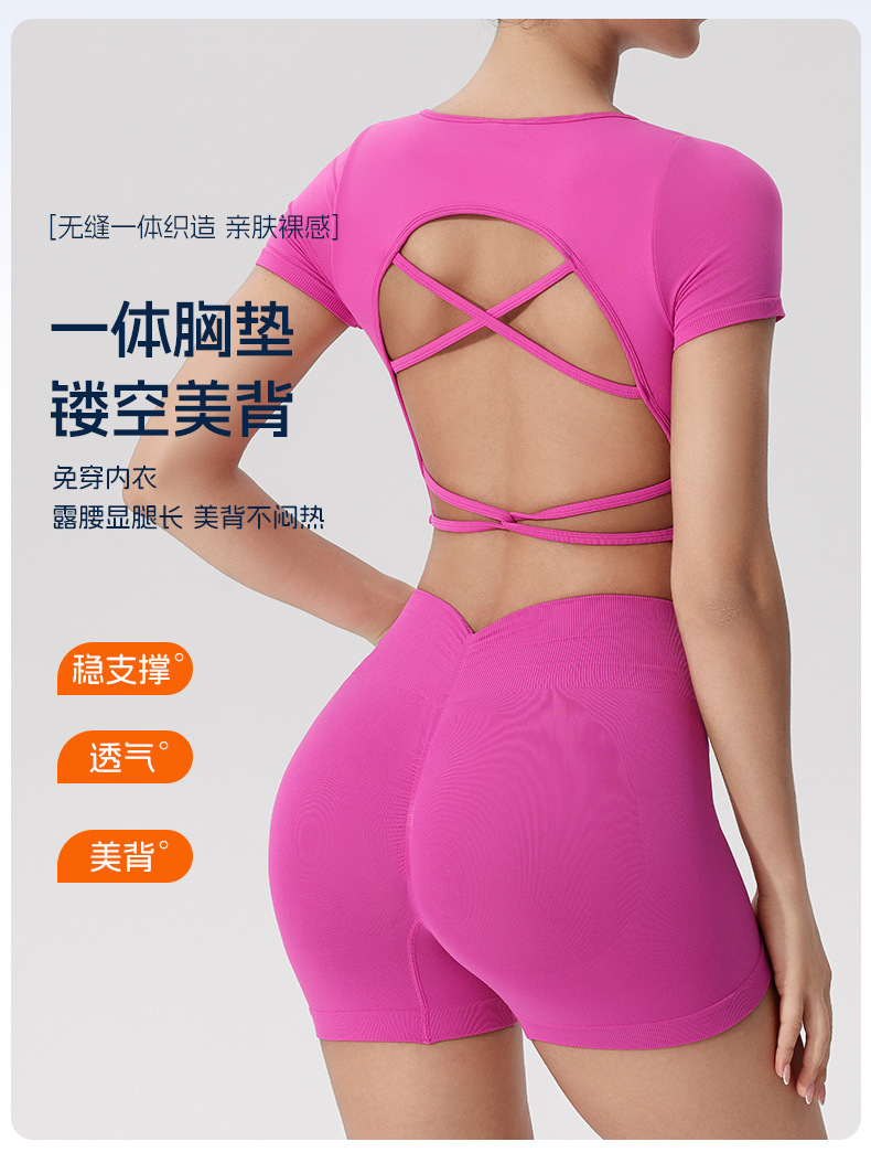 欧美跨境健身短袖t恤女无缝美背运动上衣带一体胸垫固定杯瑜伽服