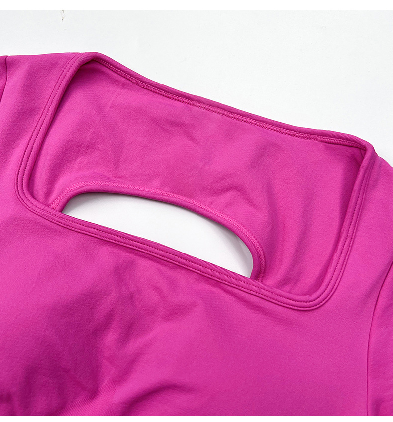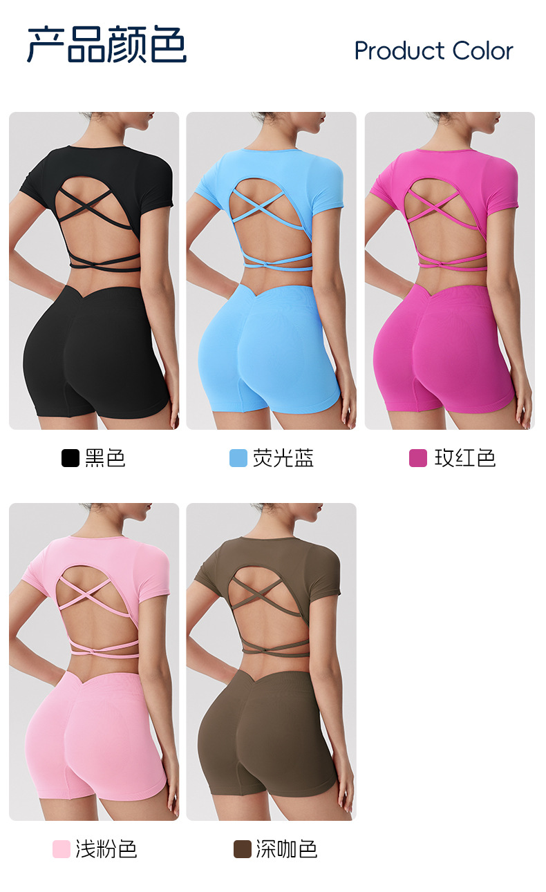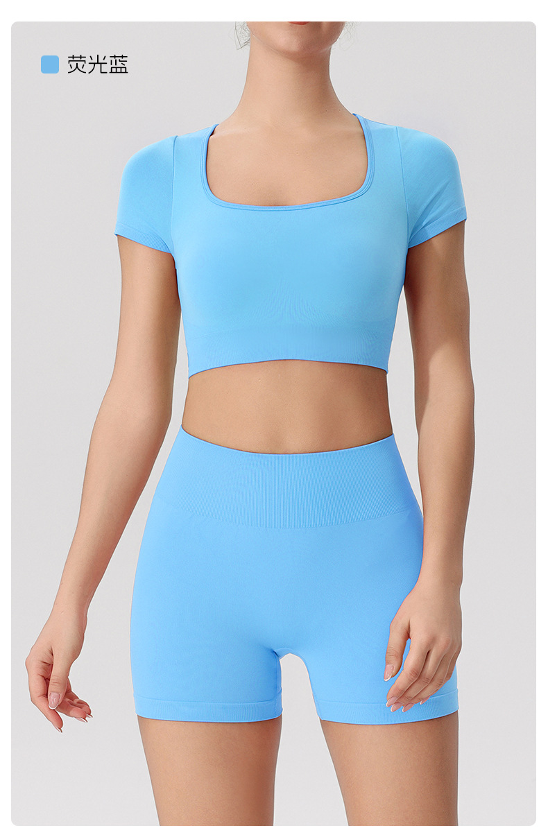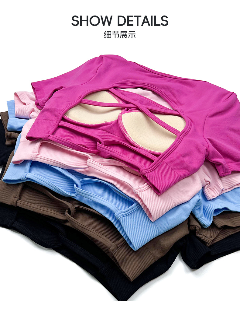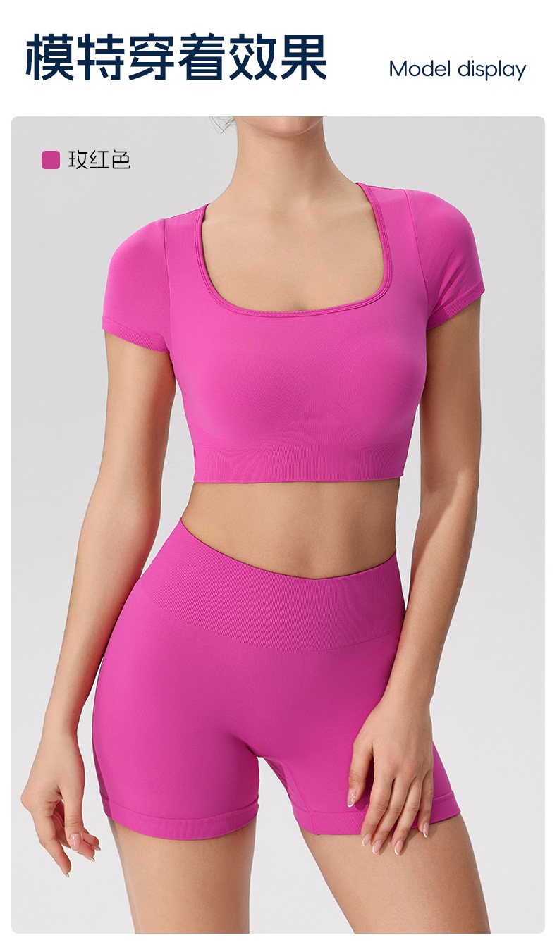 欧美跨境健身短袖t恤女无缝美背运动上衣带一体胸垫固定杯瑜伽服