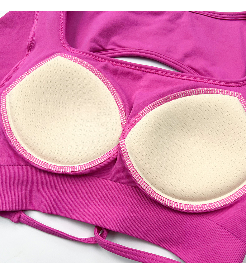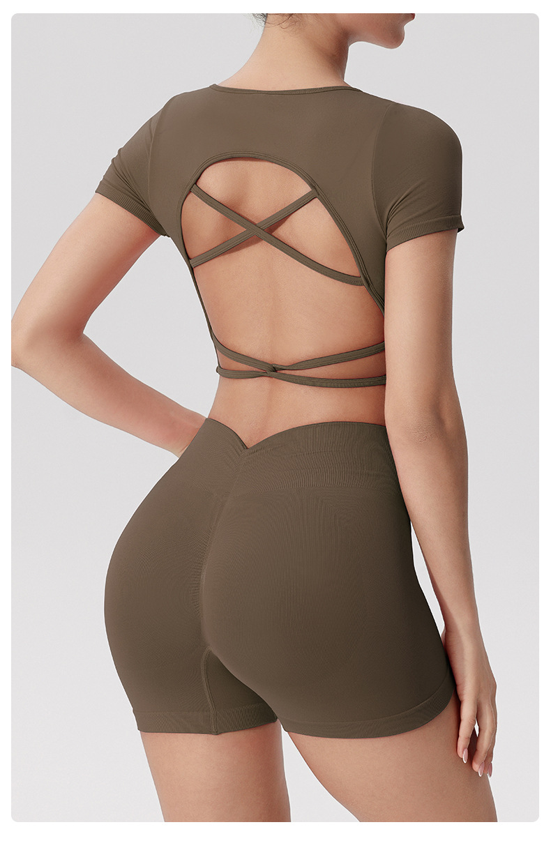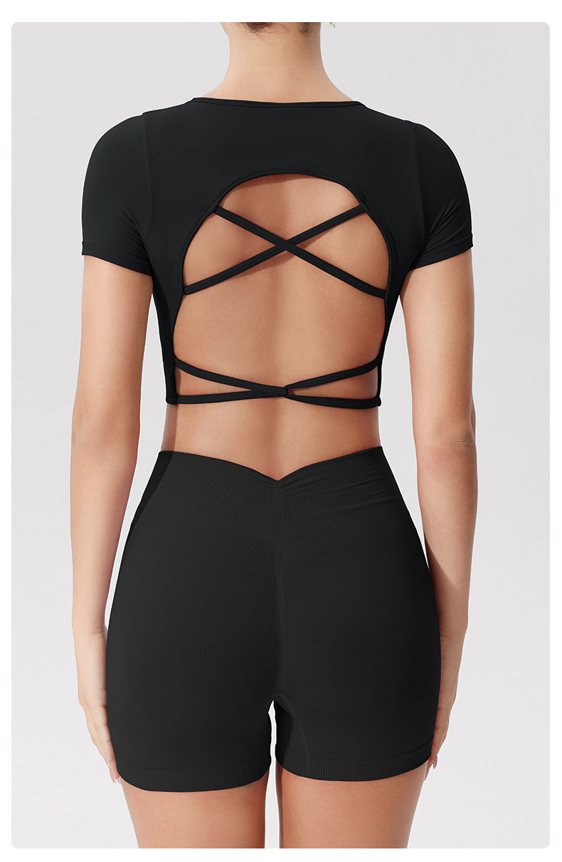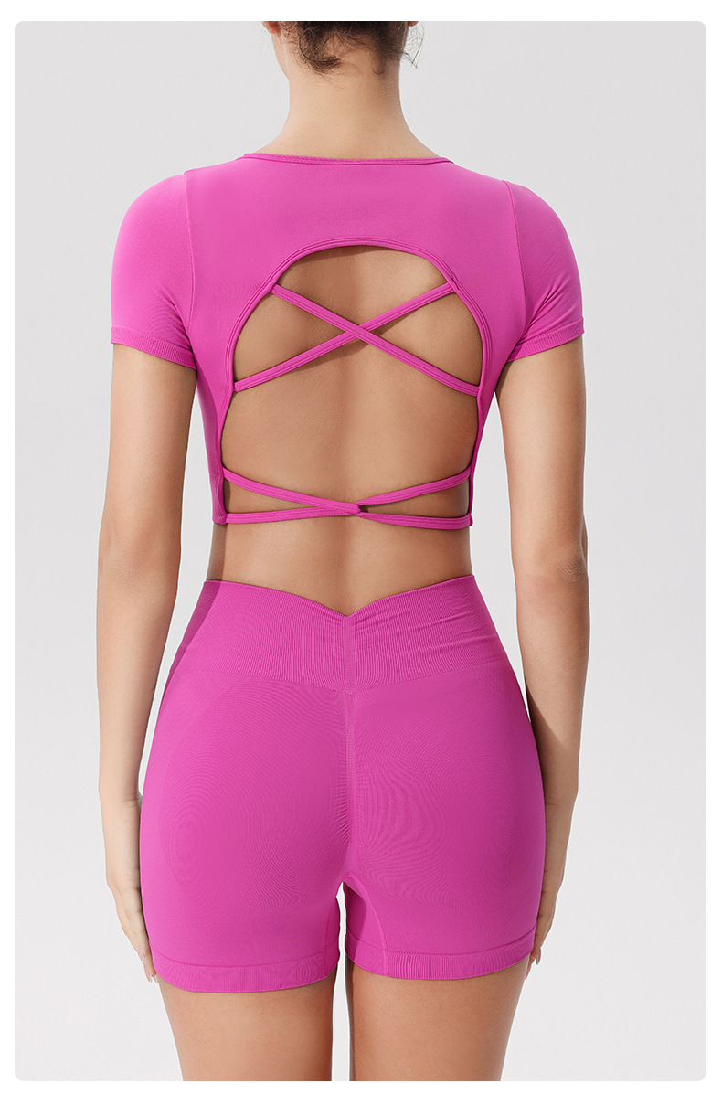 유럽과 미국의 국경 간 피트니스 반팔 티셔츠 여성용 원활한 아름다운 백 스포츠 탑 통합 가슴 패드 고정 컵 요가 옷