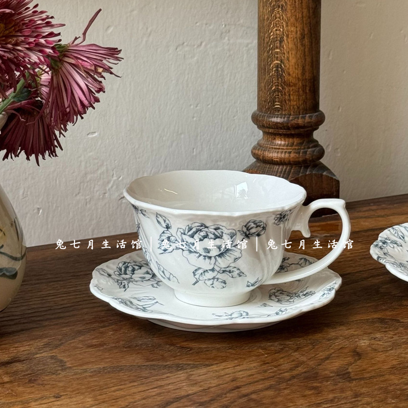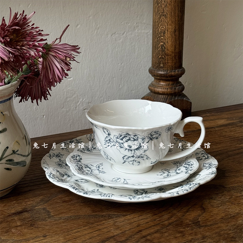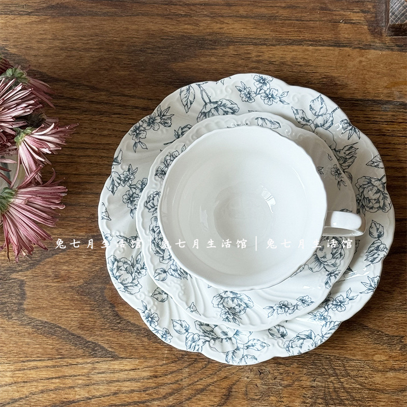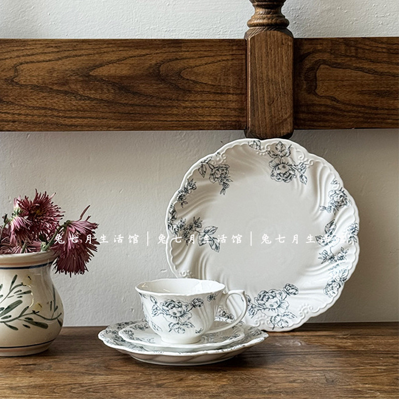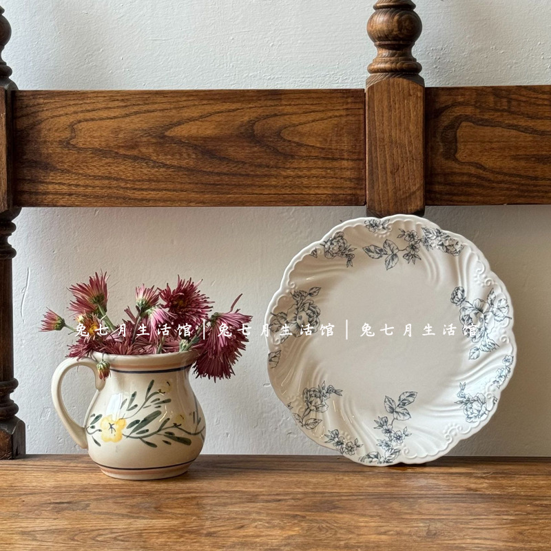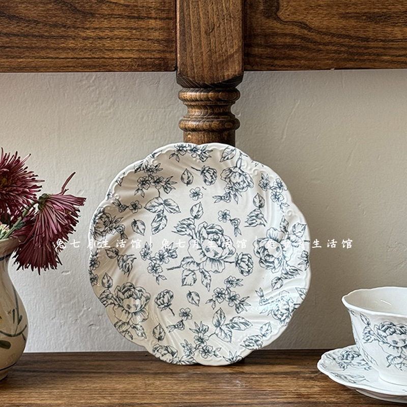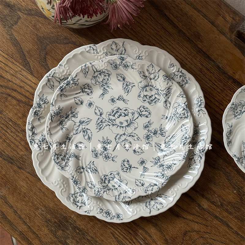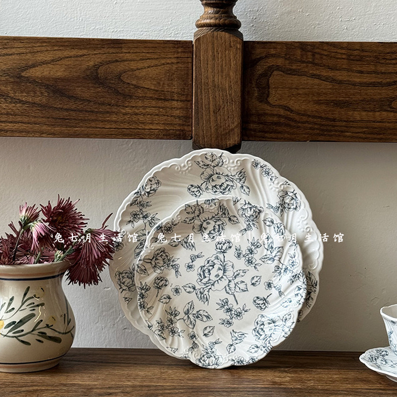 토끼 7월 | 프렌치 미드센츄리 로즈 플로럴 디저트 플레이트 일본식 인 세라믹 파스타 플레이트 플랫 플레이트 레이스 B&