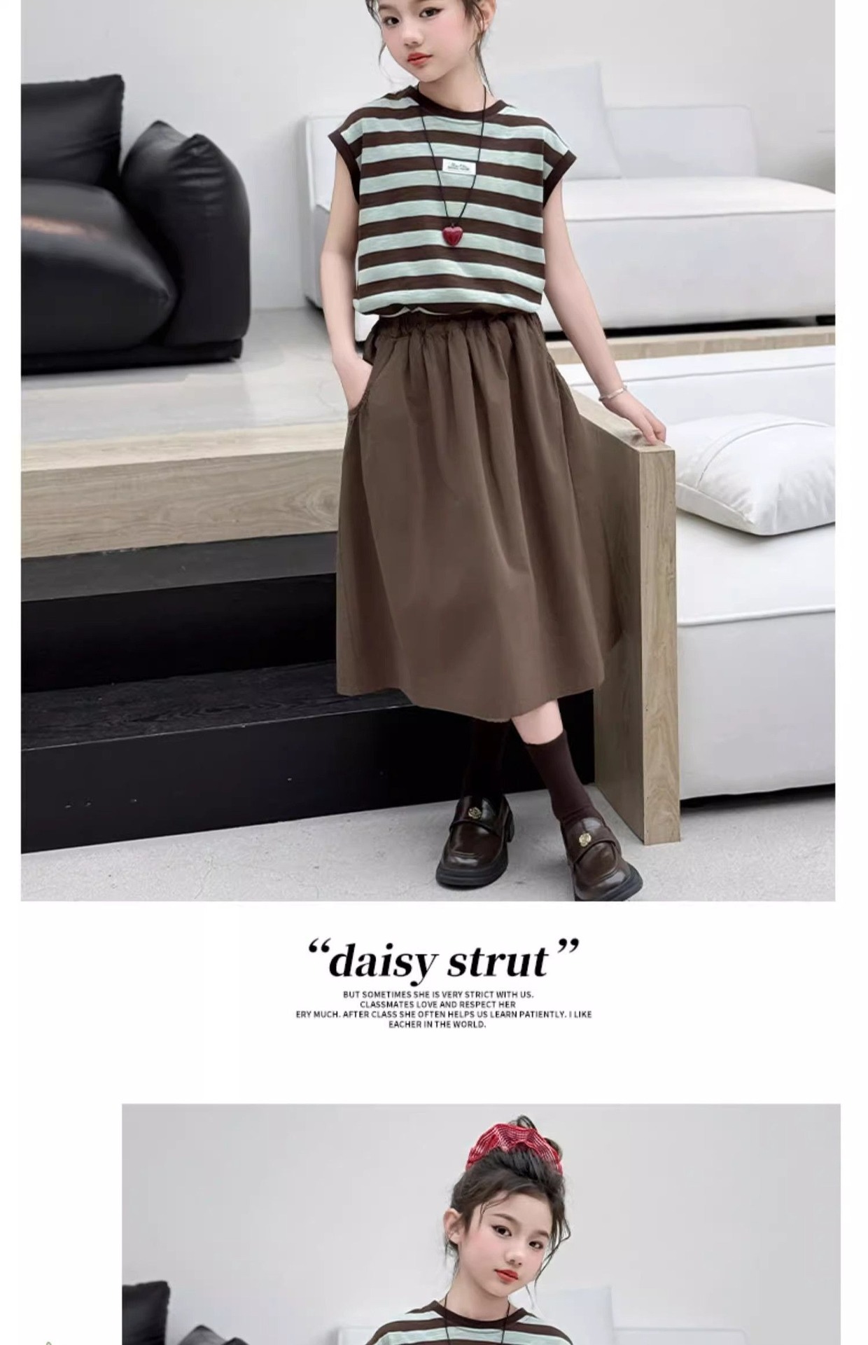 소녀 여름 세트 2025 새로운 어린이 세련 된 유행 줄무늬 반팔 여름 원피스 큰 어린이 여름 스커트 투피스 세트