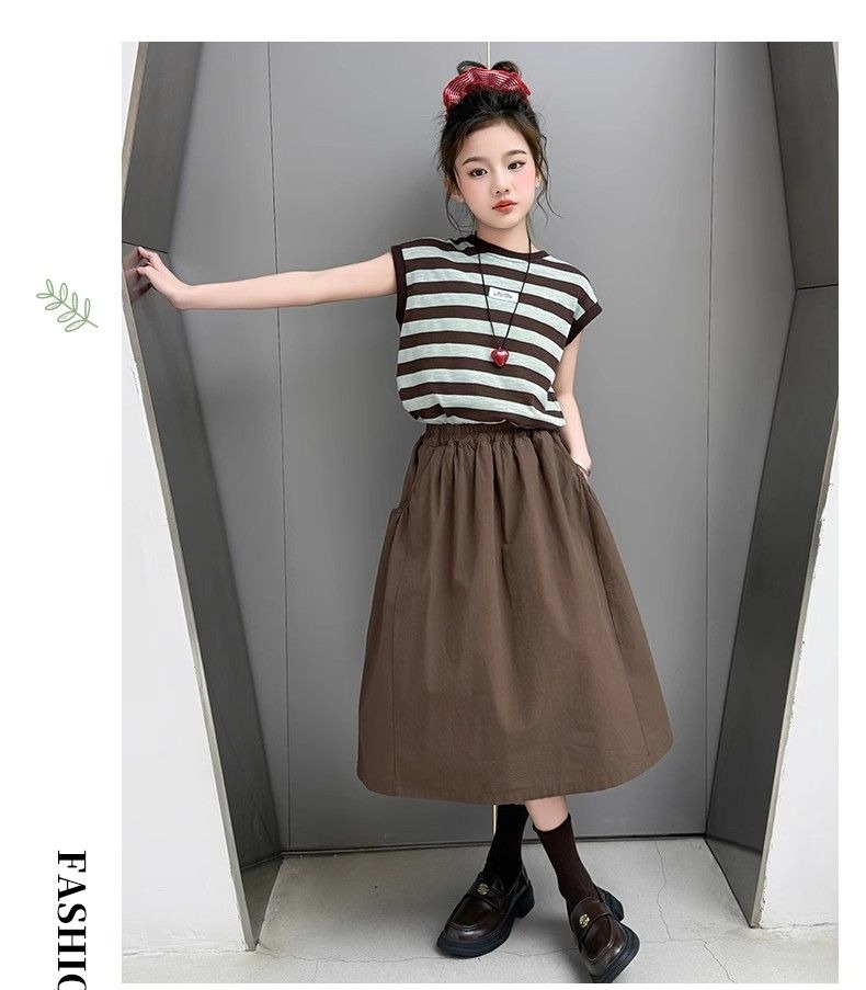 소녀 여름 세트 2025 새로운 어린이 세련 된 유행 줄무늬 반팔 여름 원피스 큰 어린이 여름 스커트 투피스 세트스토어 가기