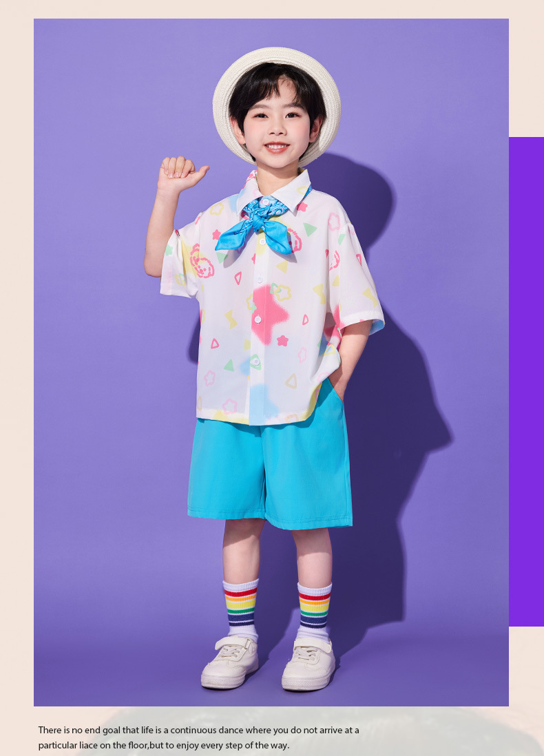 • A527 스타 셔츠 + A512 레이크 블루 반바지 + 레인보우 머리띠 + 스카이블루 스퀘어 스카프 + 레인보우 튜브 양말