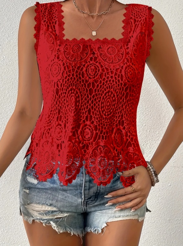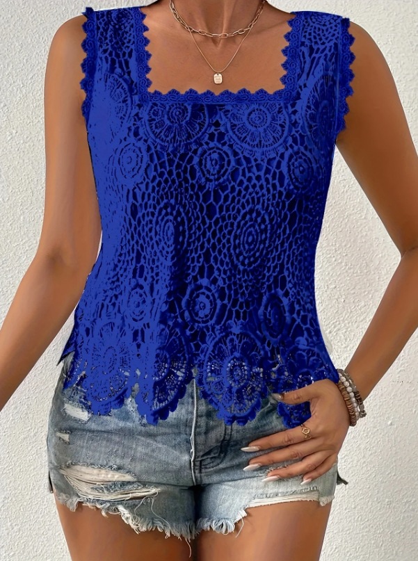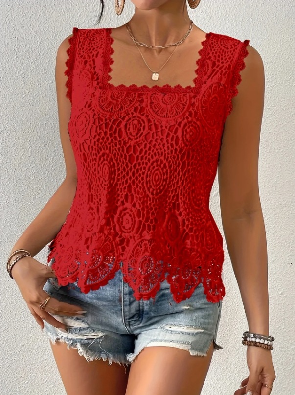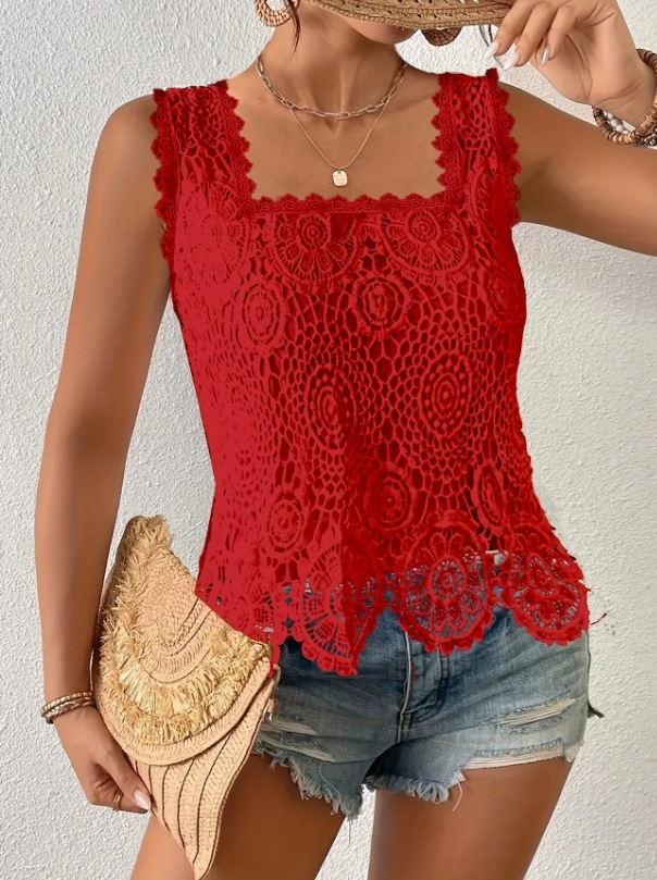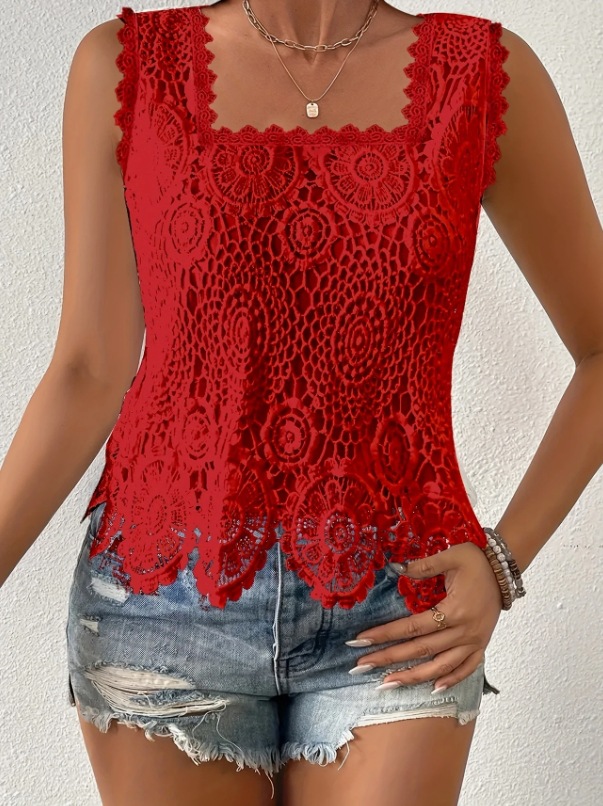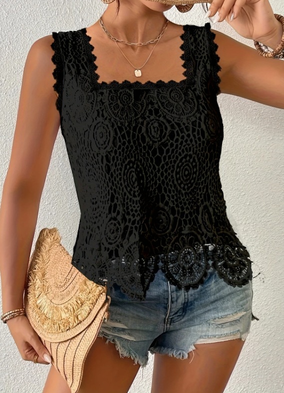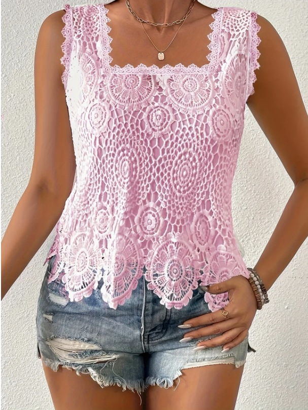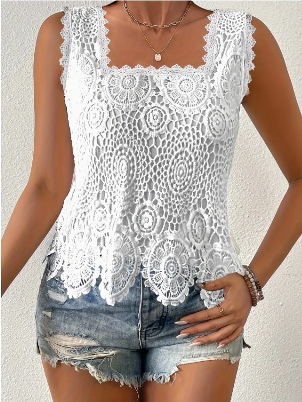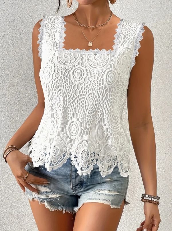 여성용 우아한 스퀘어 넥 레이스 컷아웃 민소매 탑 - 통기성 여름 셔츠 단색 패션 조끼 유럽 및 미국 스타일스토어 가기
