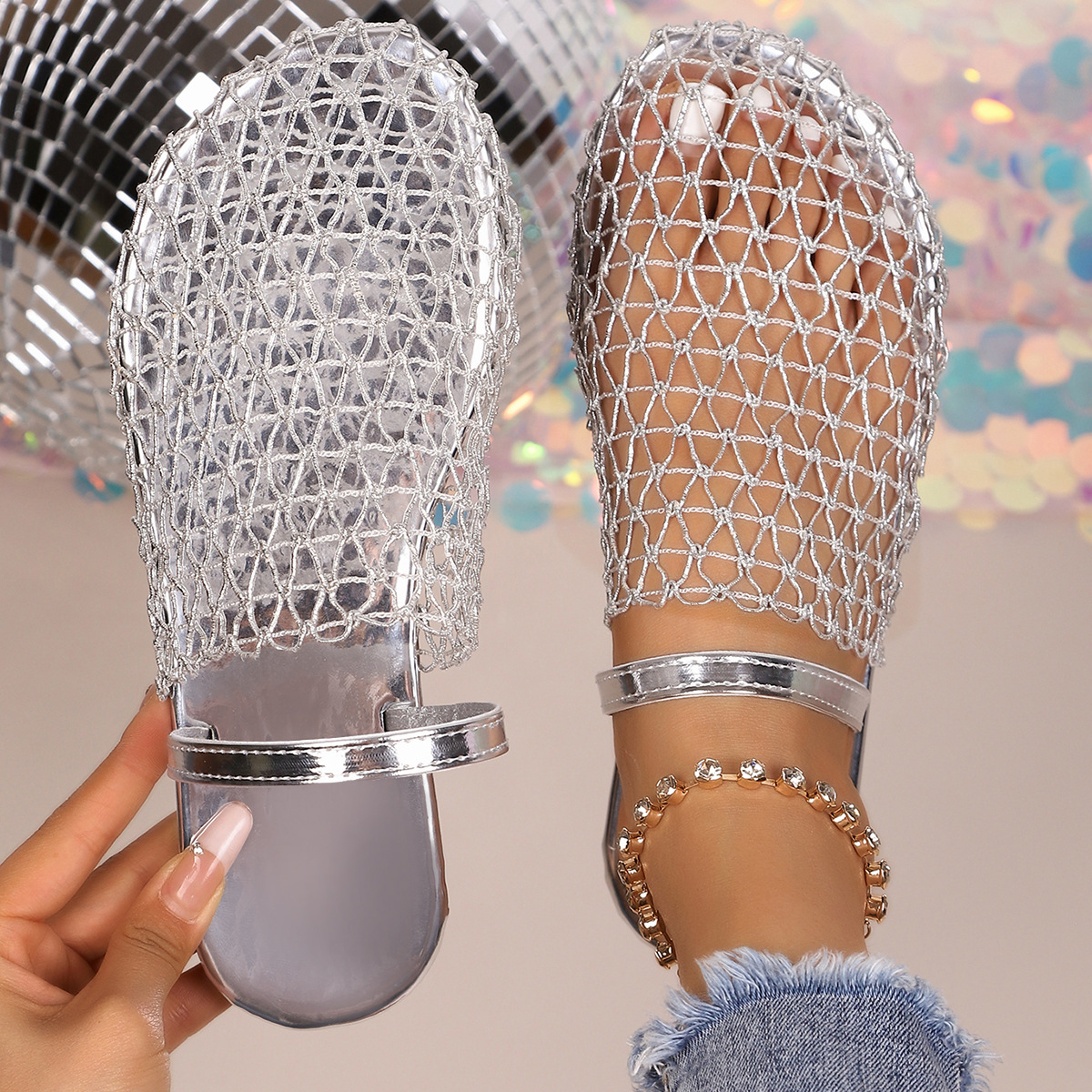 유럽과 미국의 대외 무역 중공 메쉬 표면 Baotou 플랫 슬리퍼 여성 국경 간 착용 플러스 사이즈 라운드 헤드 비치 샌들 소원