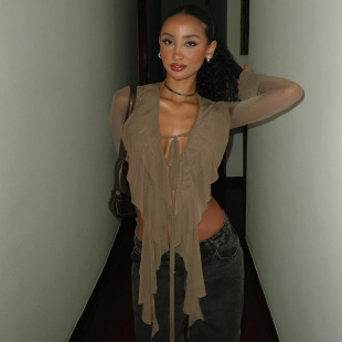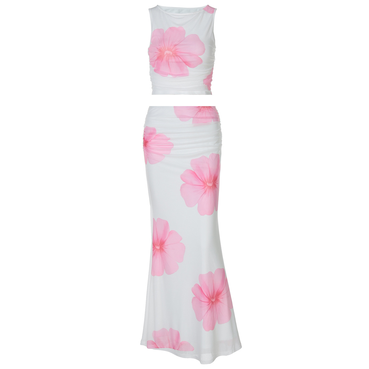 국경 간 유럽과 미국 스타일 2025 여름 여성의 새로운 메쉬 스티칭 패션 프린트 민소매 탑 스커트 세트