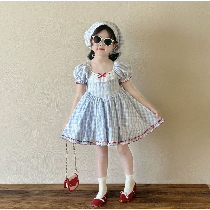 2025 여름 목가적 인 스타일 광장 칼라 격자 원피스 소녀의 프랑스 스타일 달콤하고 서양식 어린 소녀의 공주 원피스