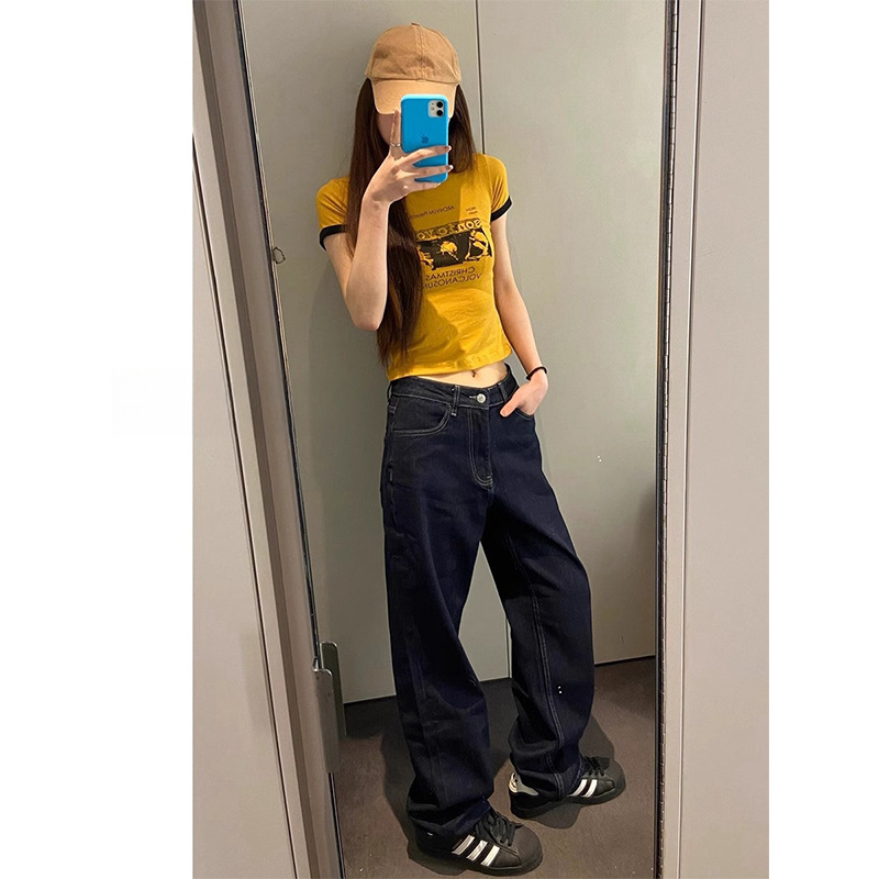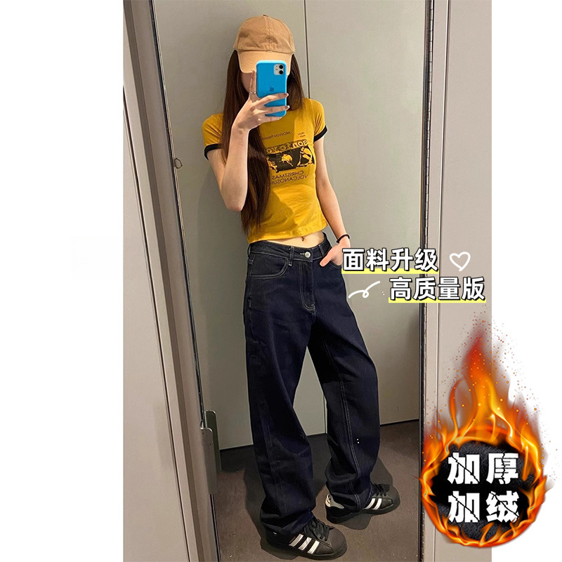 플러스 사이즈 다크 네이비(기모) 청바지 여자 겨울 2024 새로운 통통녀 느슨한 높은 허리 넓은 다리 바지스토어 가기