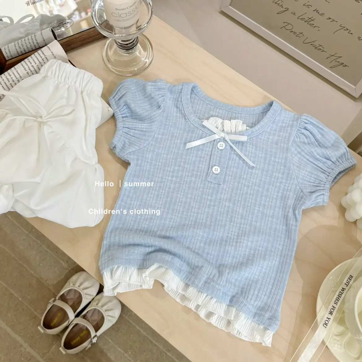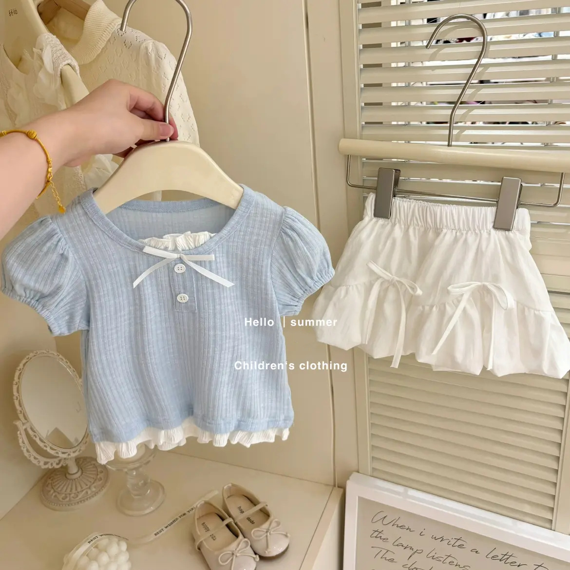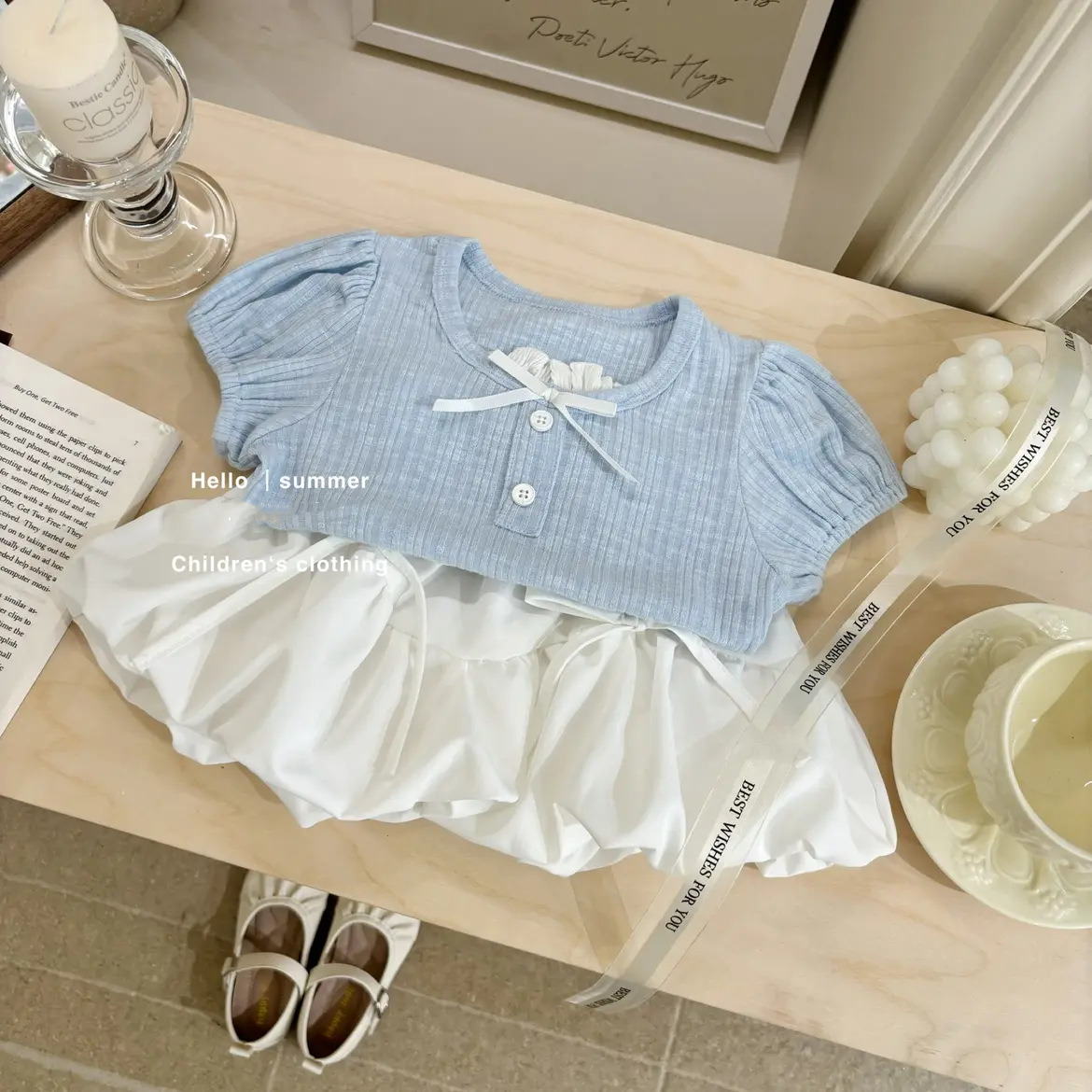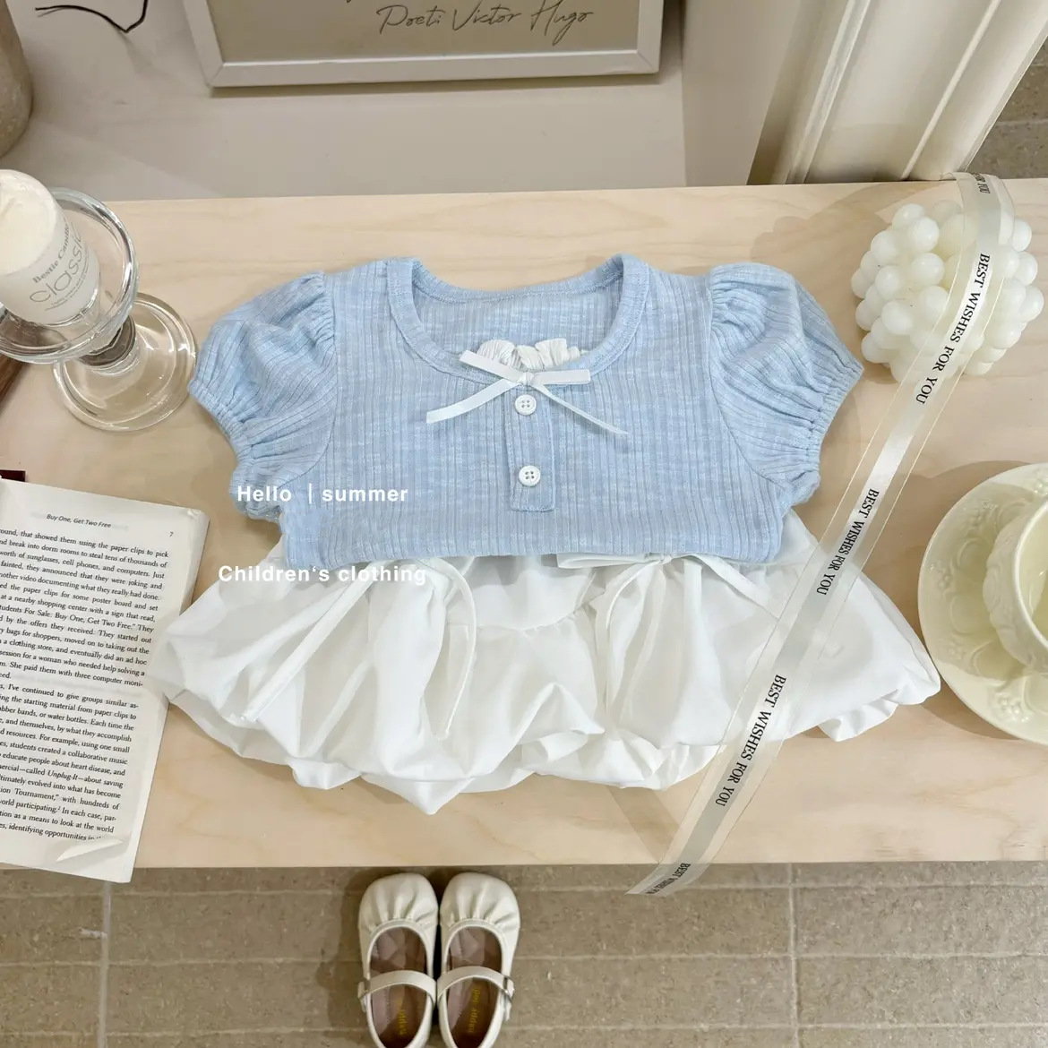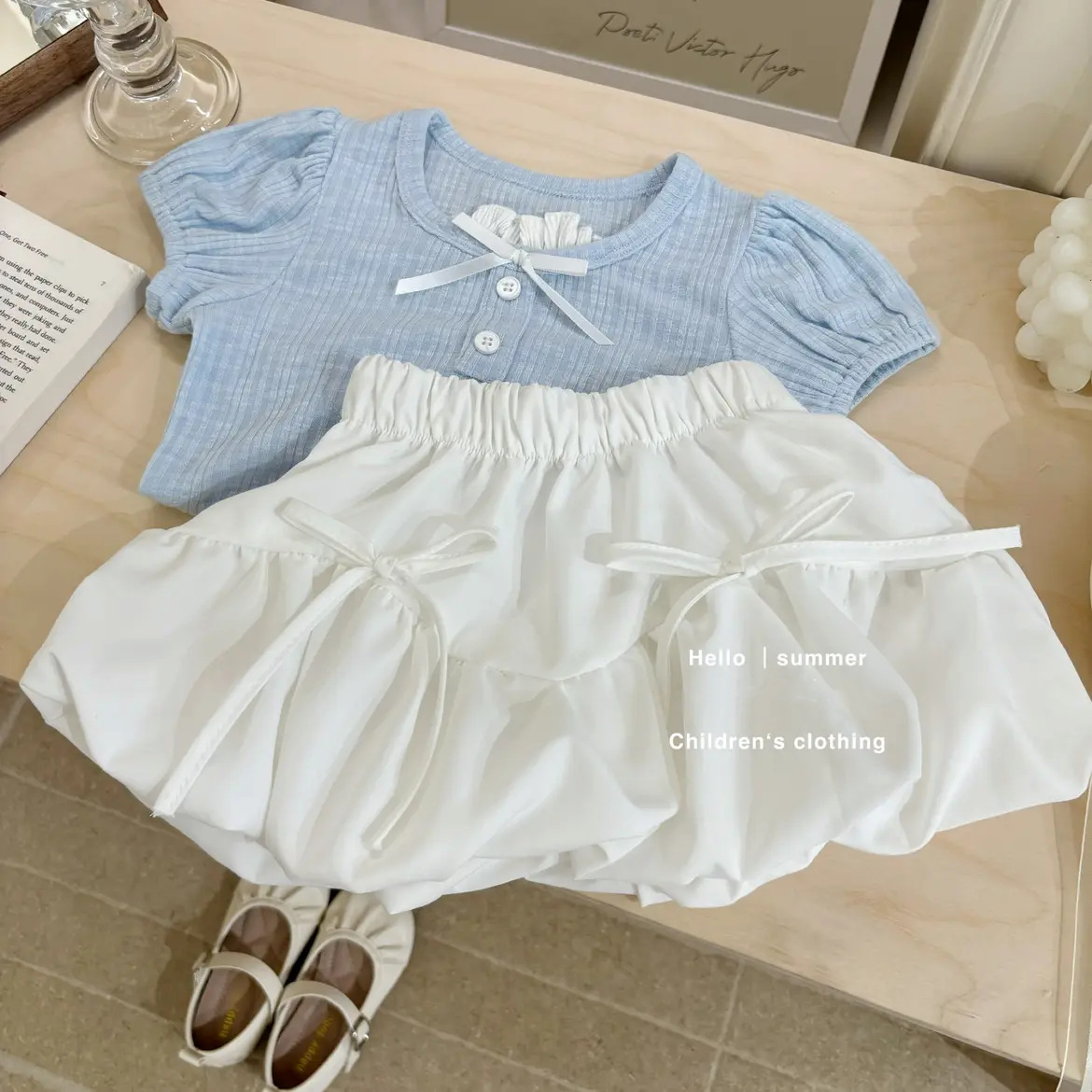 25 새로운 여름 아기 소녀 외국 스타일 한국 아동면 반팔 티셔츠 투피스 세트 스커트 탑스토어 가기