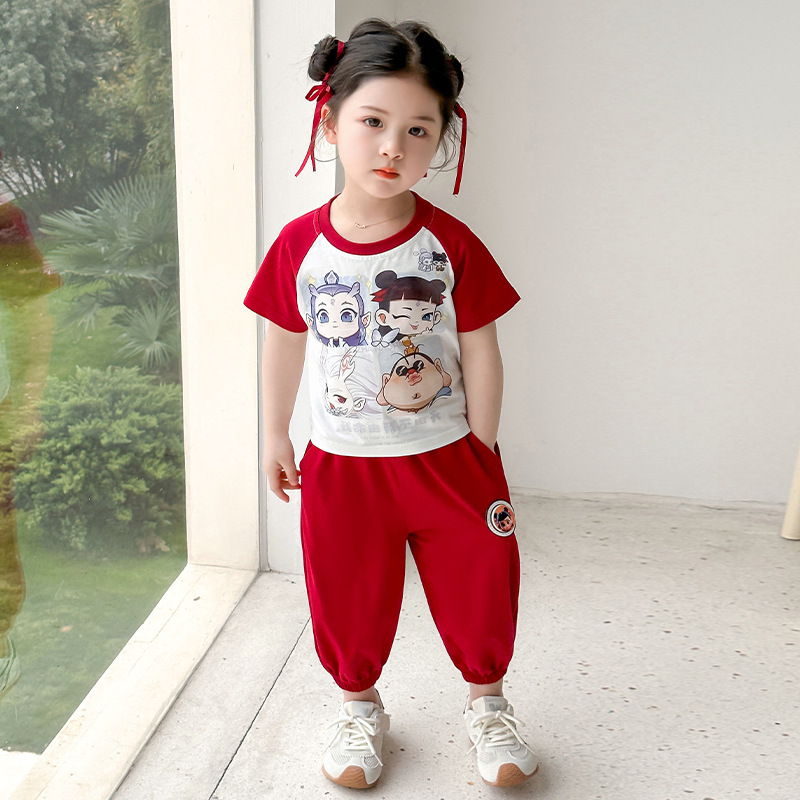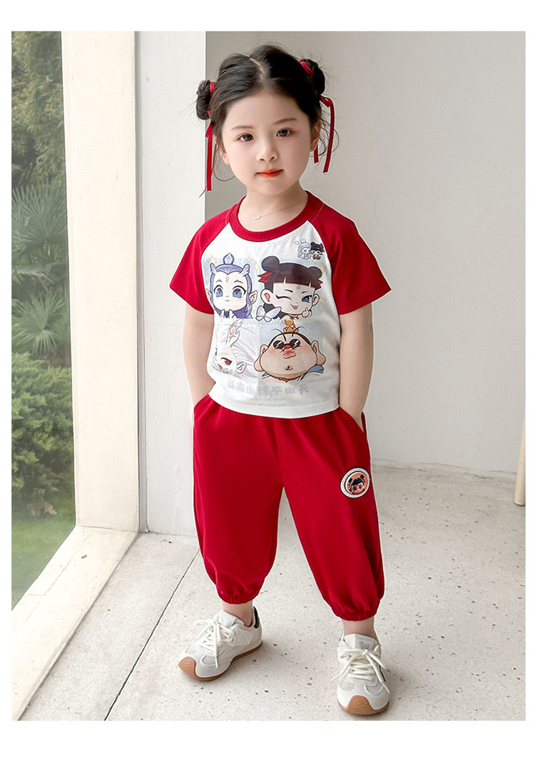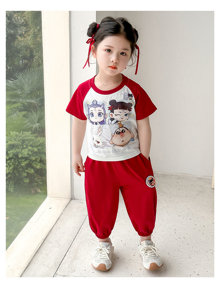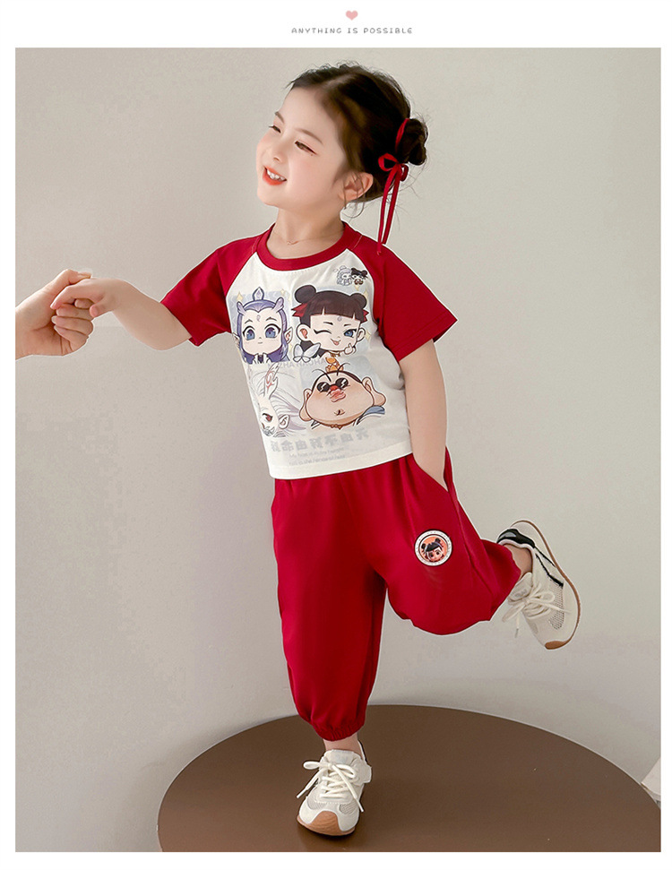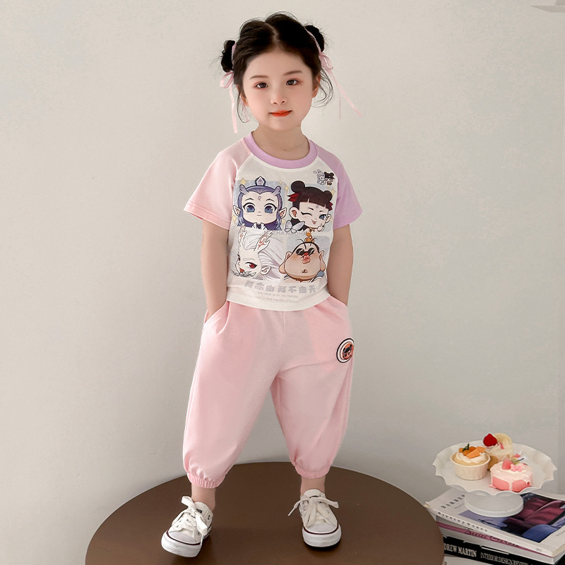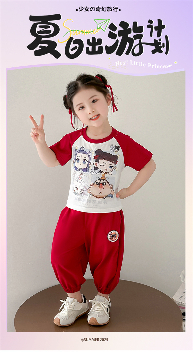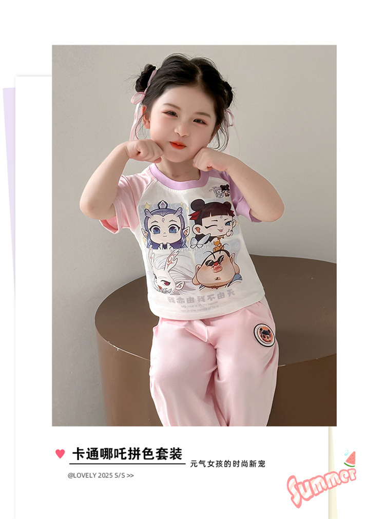 여자 Nezha 정장 여름 2025 새로운 Nezha 어린이 스타일 옷 아기 소녀 반팔 여름 투피스 세트