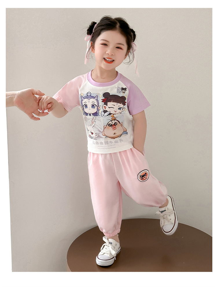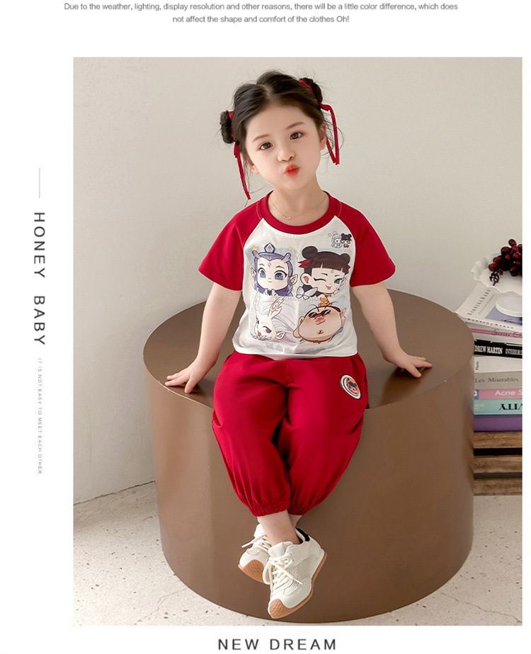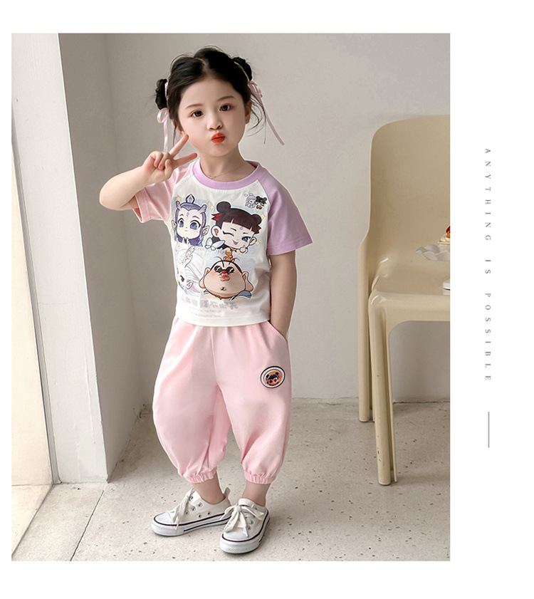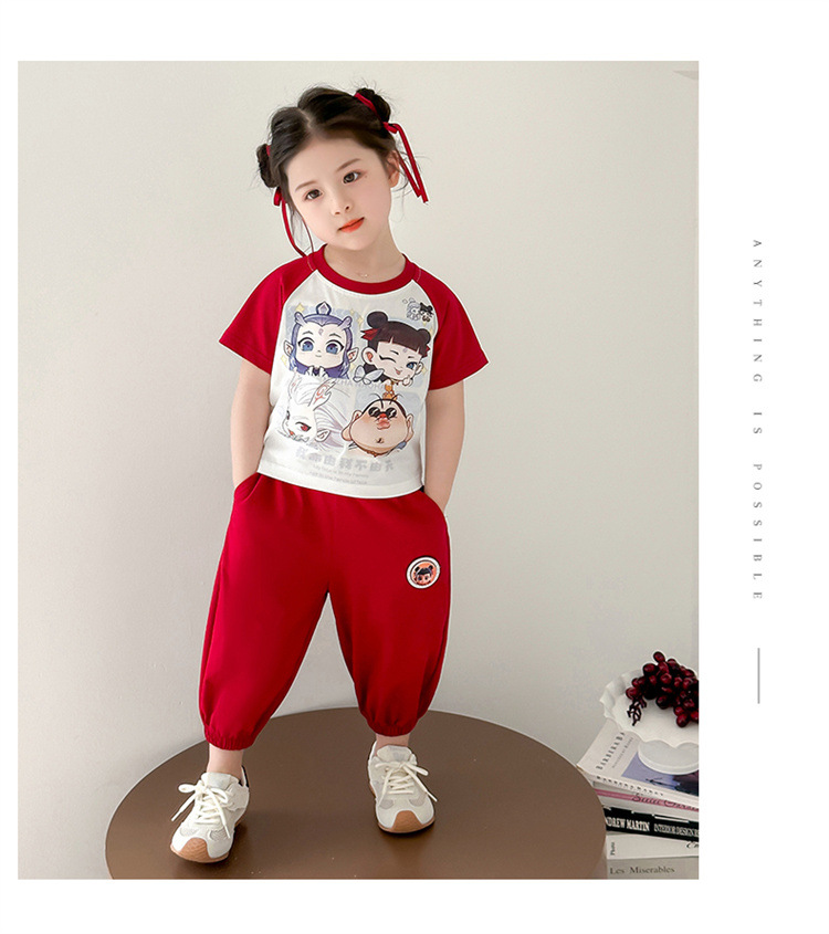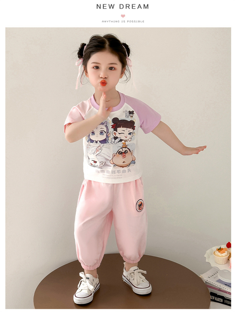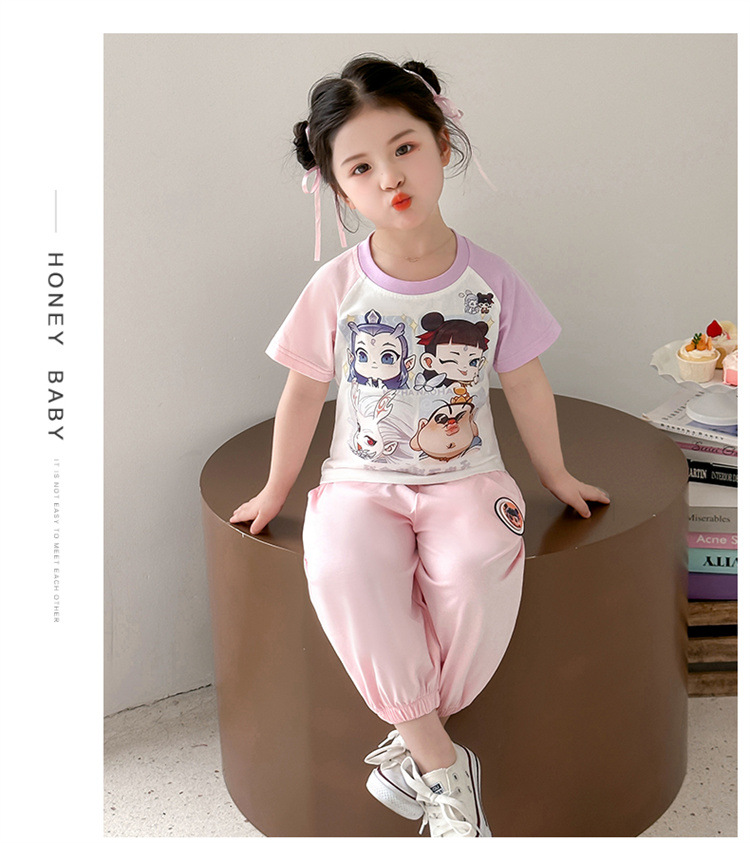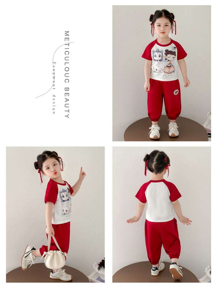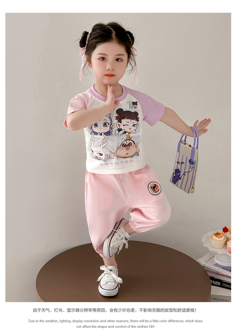 여자 Nezha 정장 여름 2025 새로운 Nezha 어린이 스타일 옷 아기 소녀 반팔 여름 투피스 세트