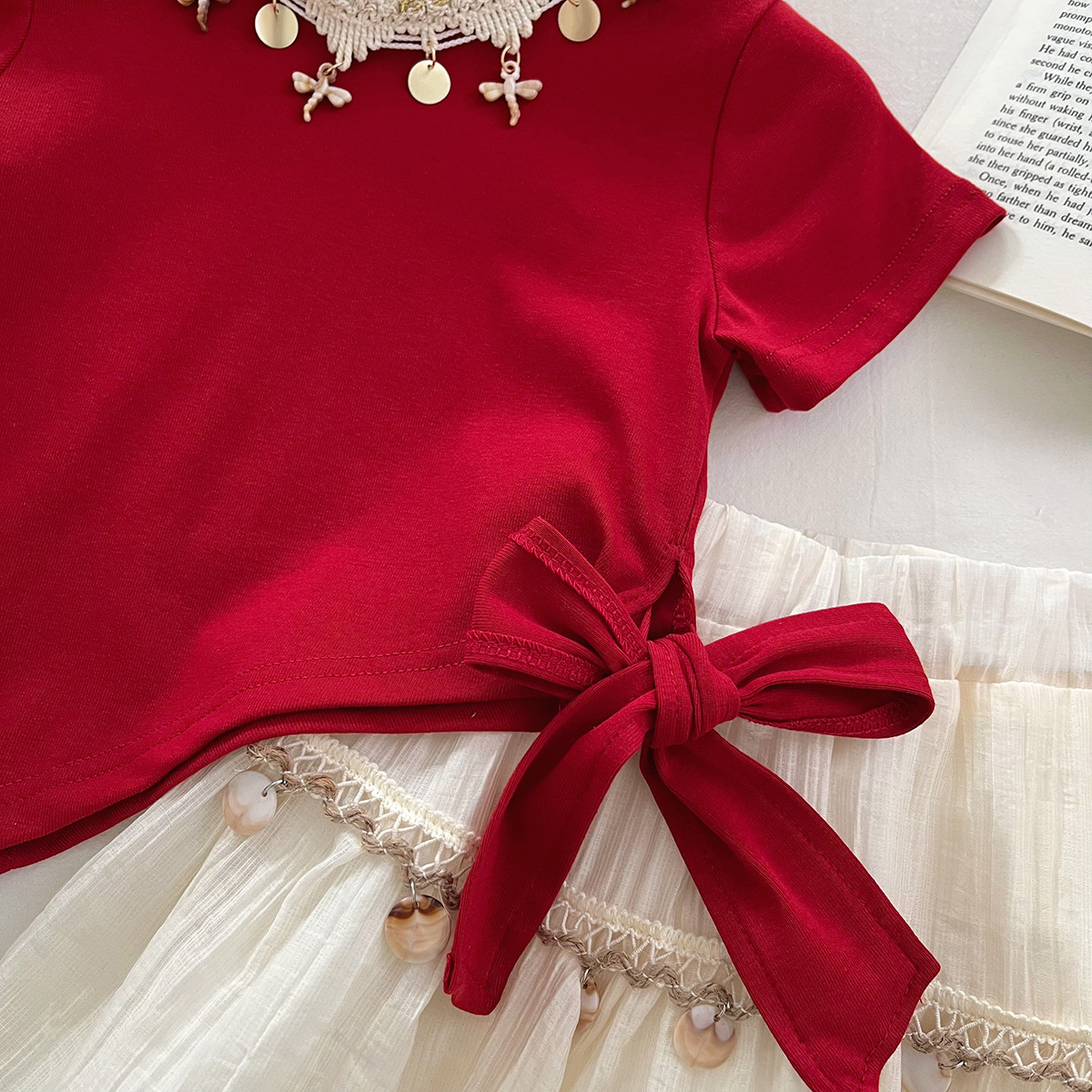 소녀의 치마 세트 2025 년 여름 새로운 도착 소녀의 불규칙한 활 반팔 티셔츠 투피스 유행 세트
