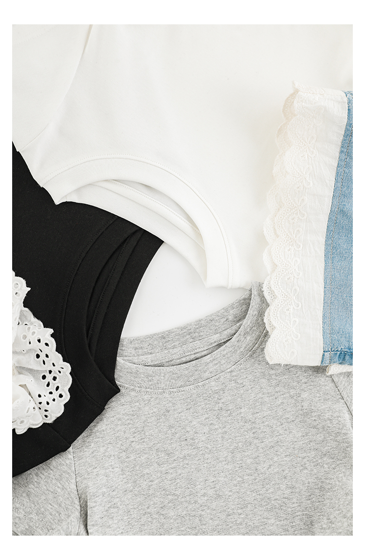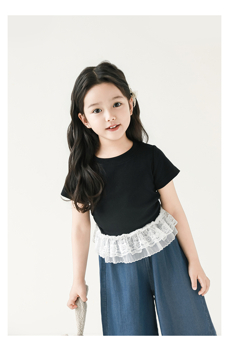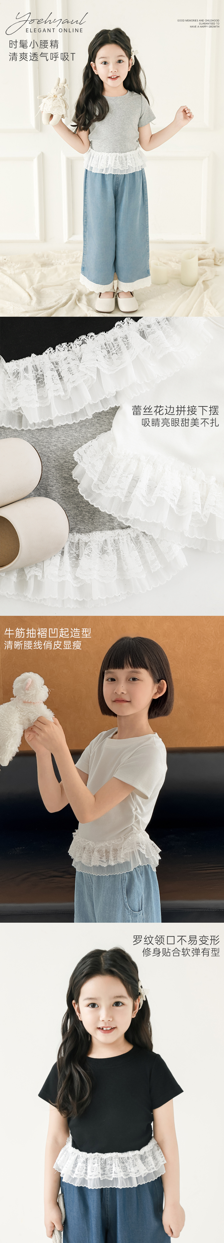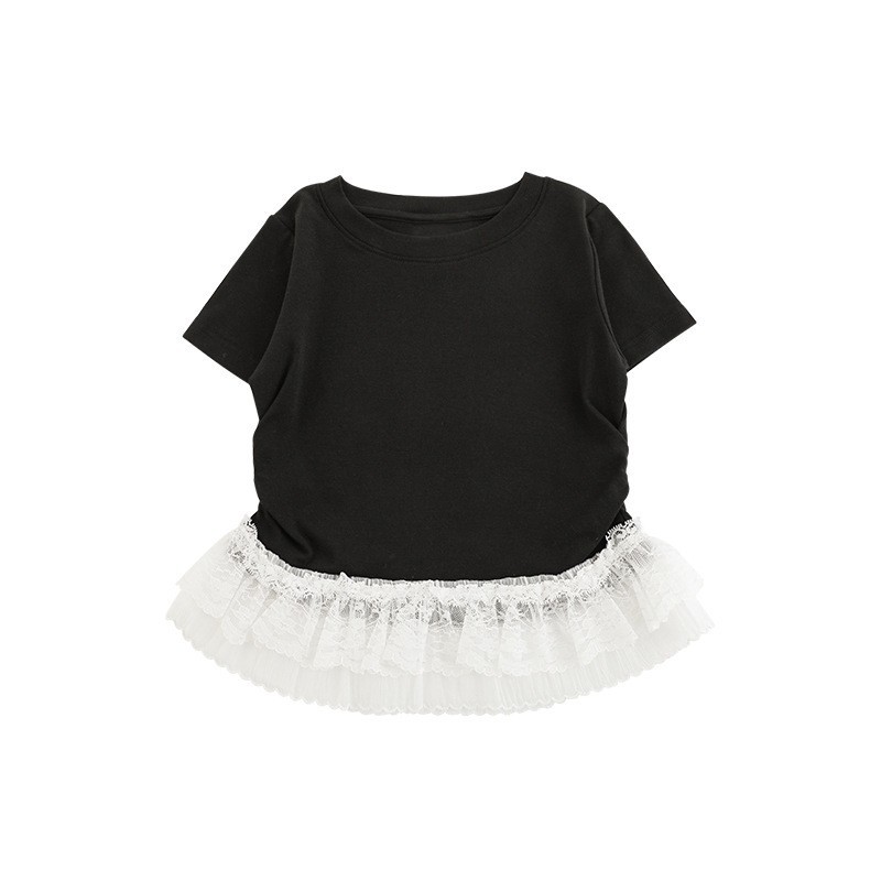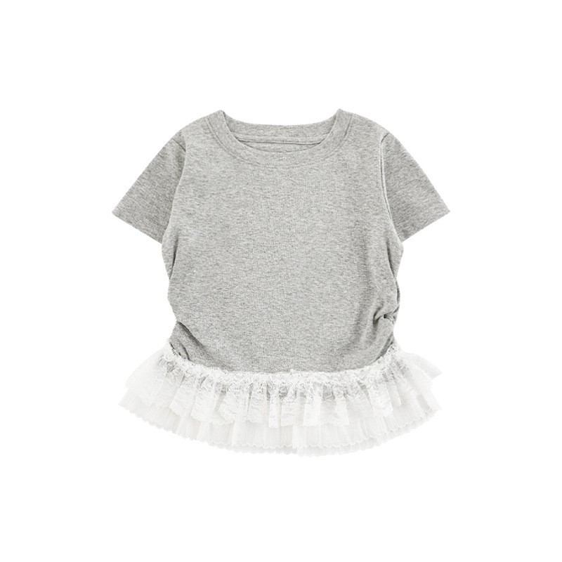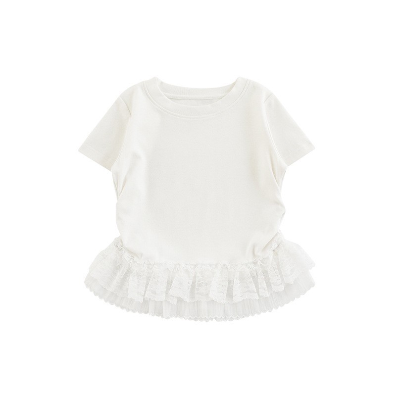 여자의 유행 작은 허리 좋은 레이스 스티칭 반팔 티셔츠 2025 여름 상쾌한 탑 조수스토어 가기