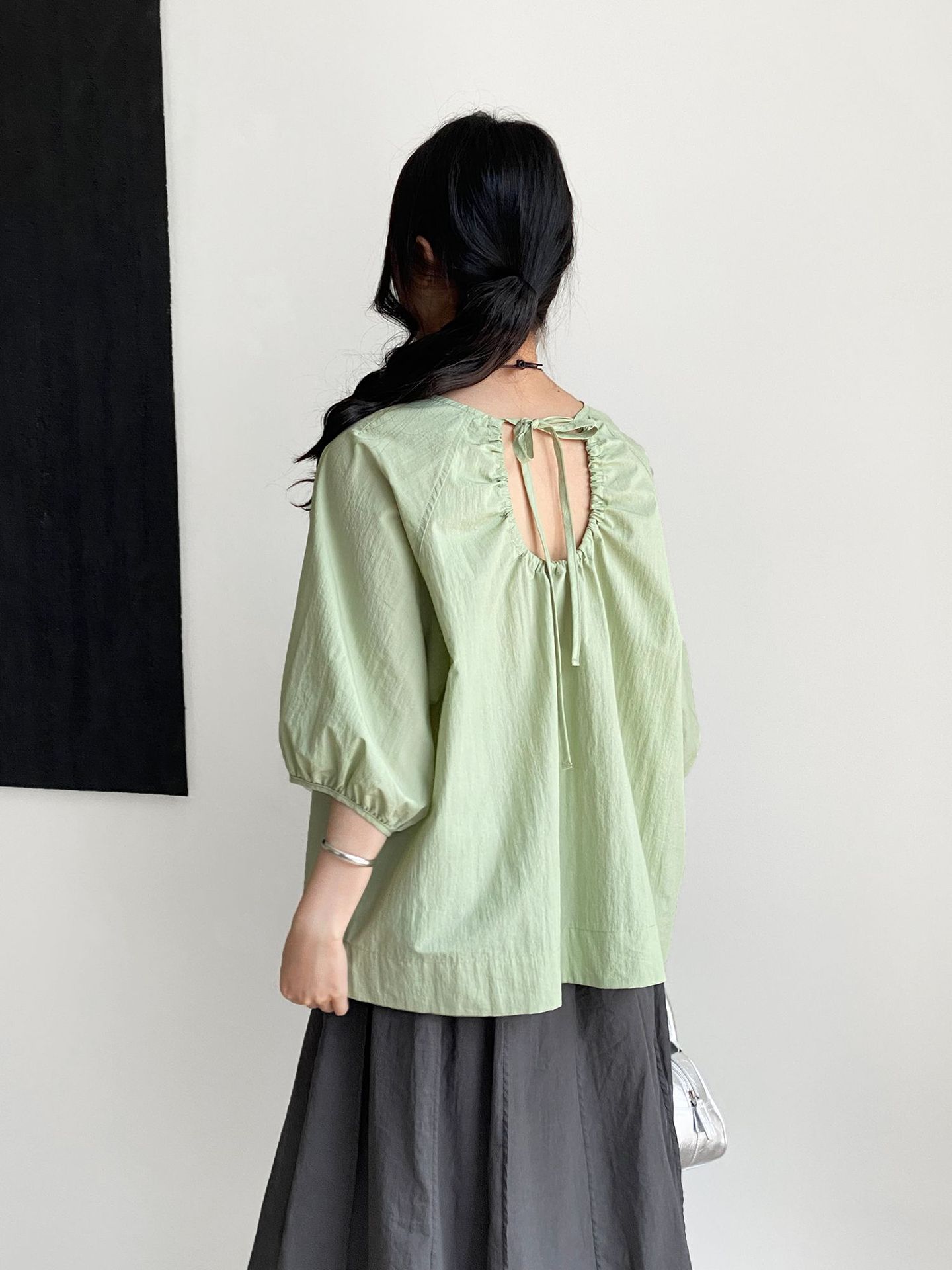 백 할로우 아웃 디자인 센스 레이스 업 느슨한 인형 셔츠 여성용 틈새 크루 넥 우아한 백리스 셔츠 6092