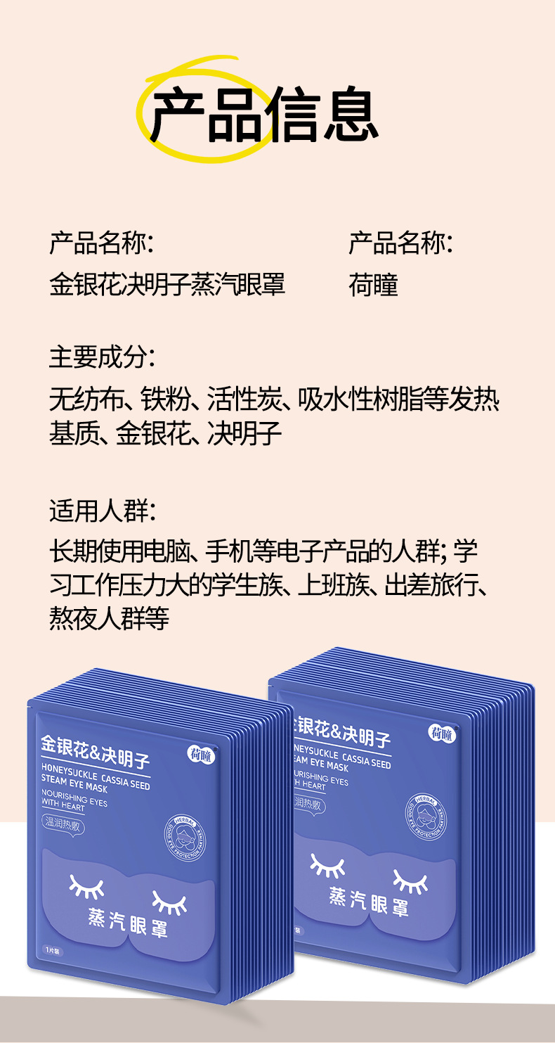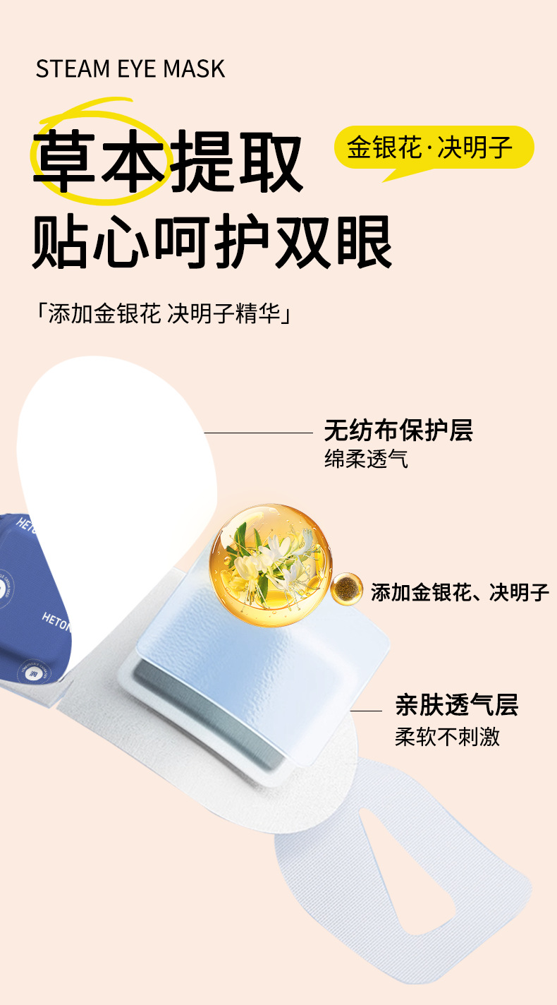 허통 금은화 결명자 스팀 아이 마스크는 눈의 피로와 건조함을 완화하고 눈가 피부에 수분을 공급하며 건조한 눈을 보호하고 온열을 주어 진정시킵니다.