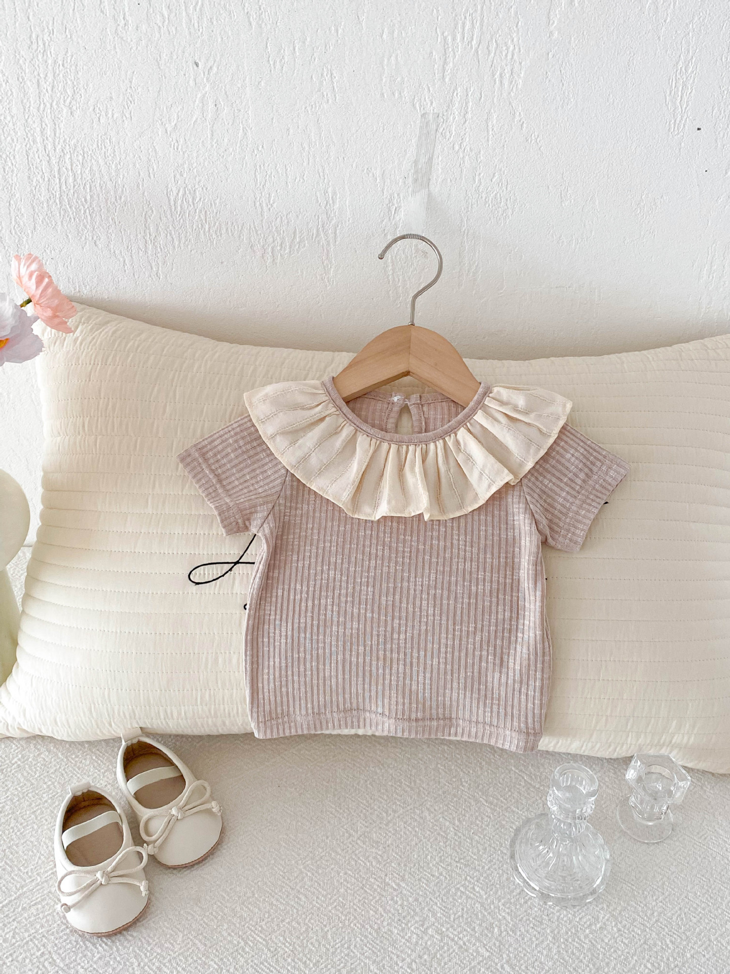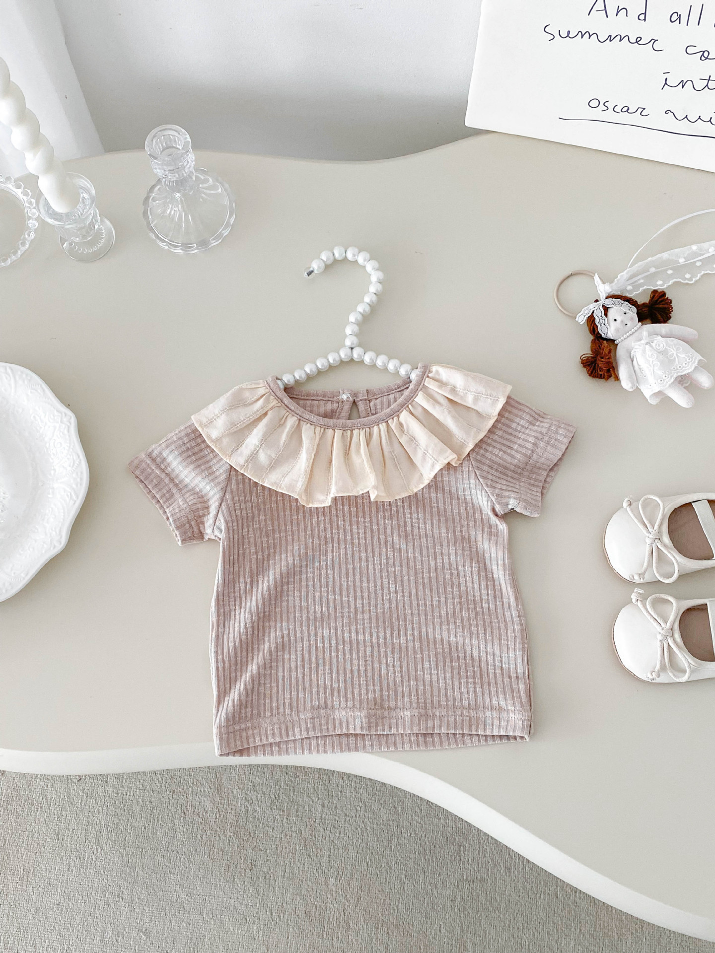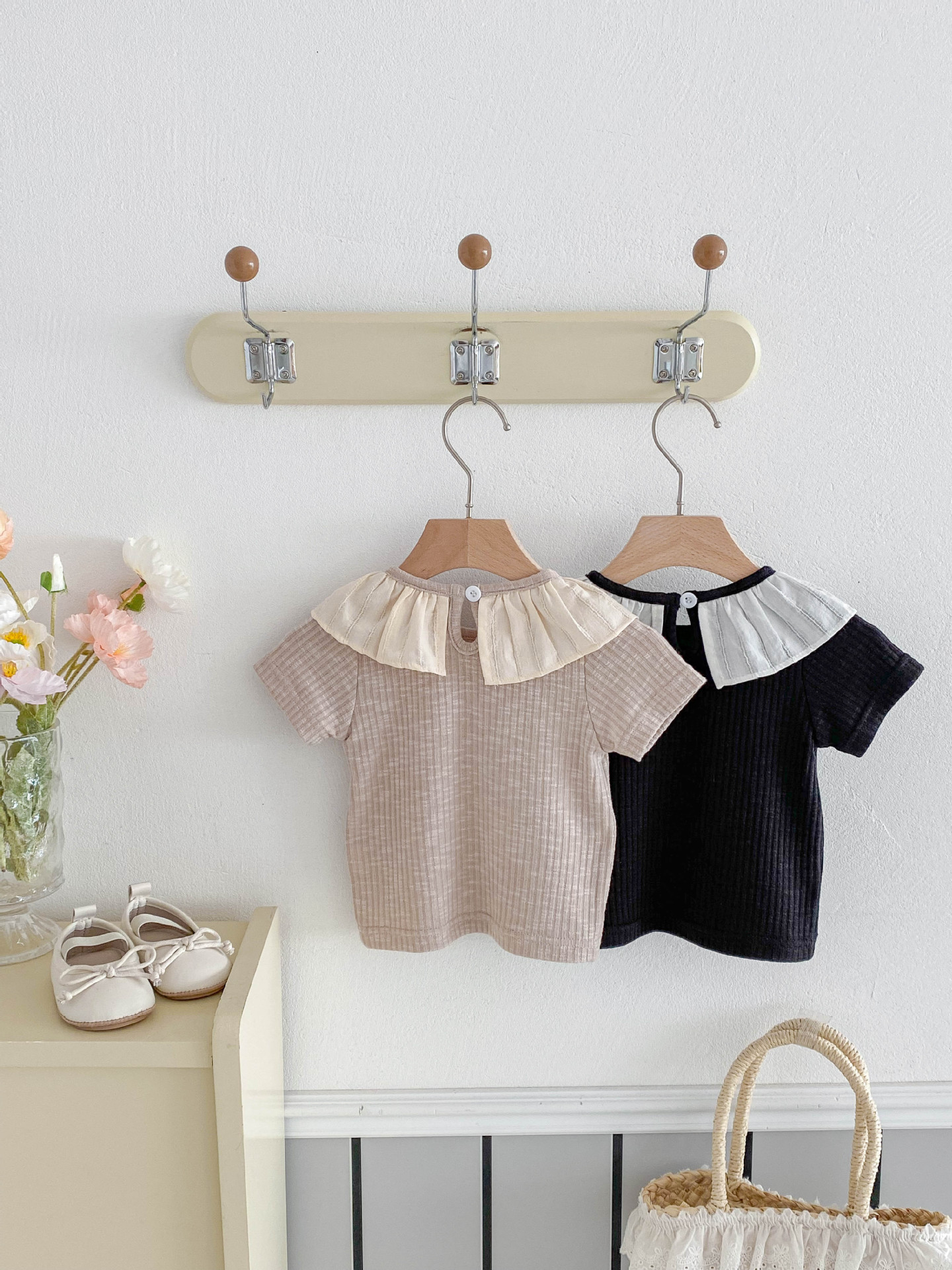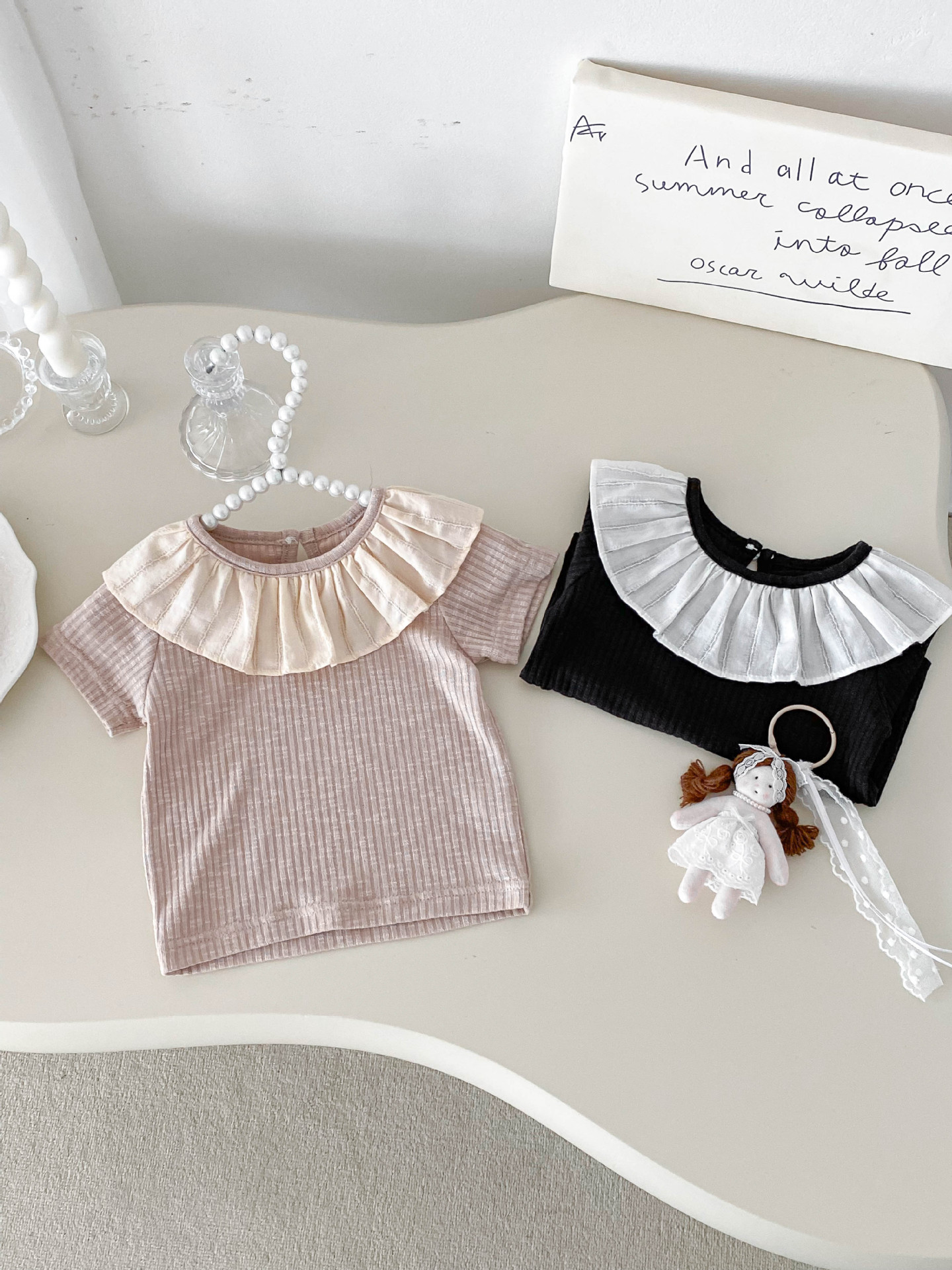 여자 한국 티셔츠 2025 새로운 여름 어린이 레이스 칼라 짧은 소매 여름 아기 서양식 연꽃 잎 칼라 탑
