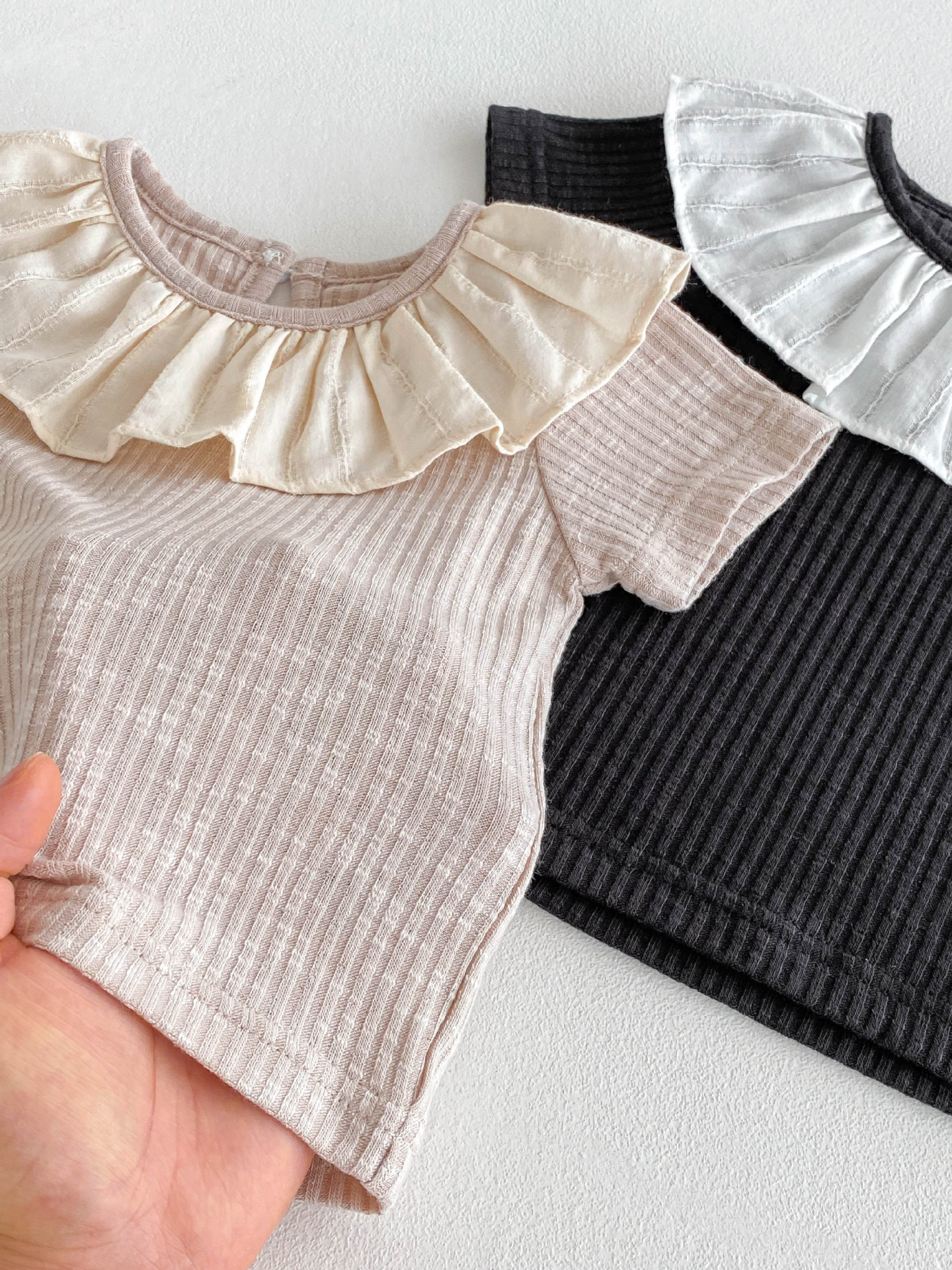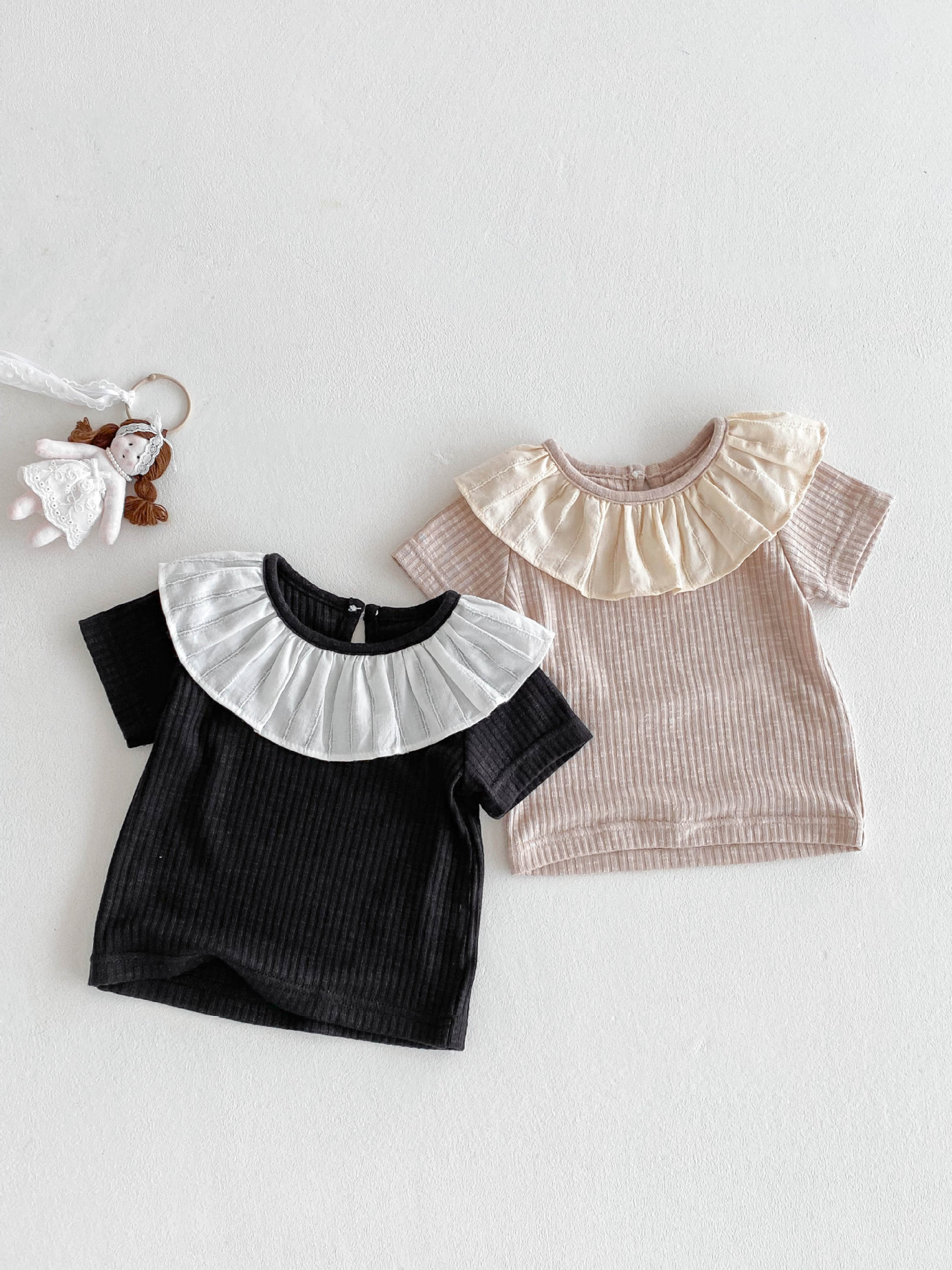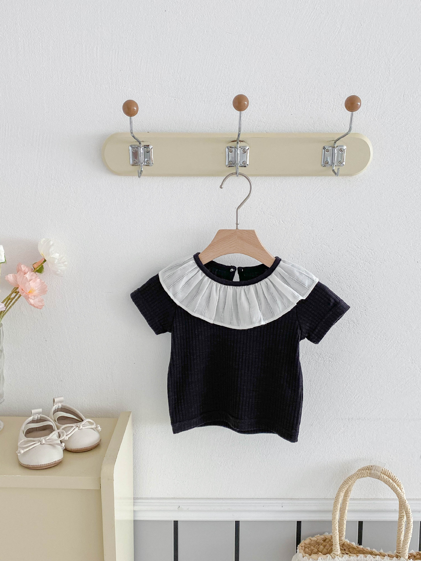 여자 한국 티셔츠 2025 새로운 여름 어린이 레이스 칼라 짧은 소매 여름 아기 서양식 연꽃 잎 칼라 탑