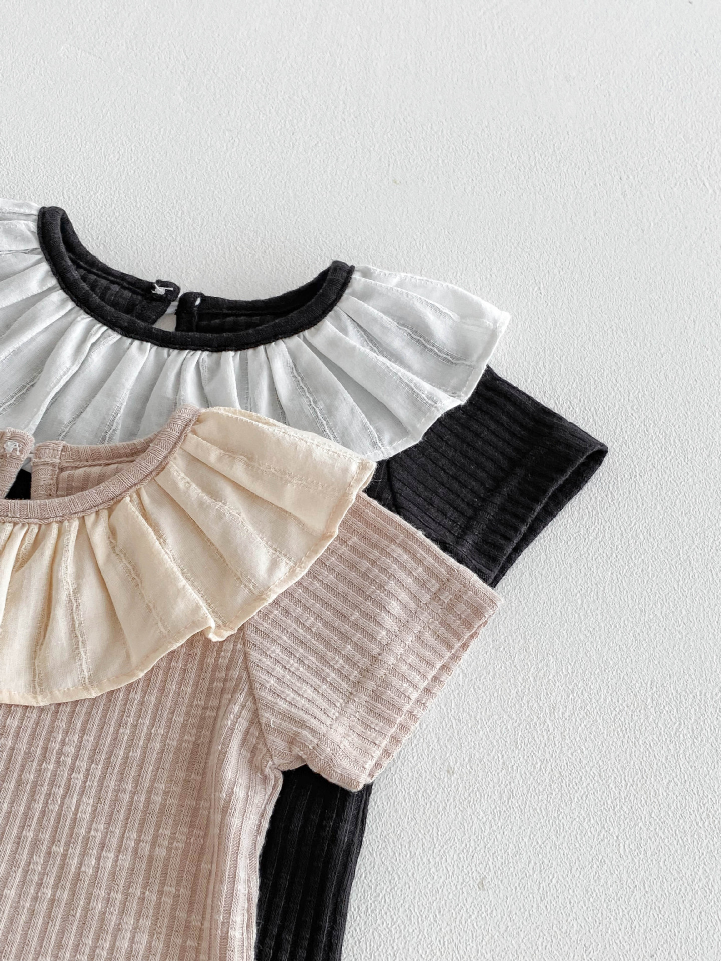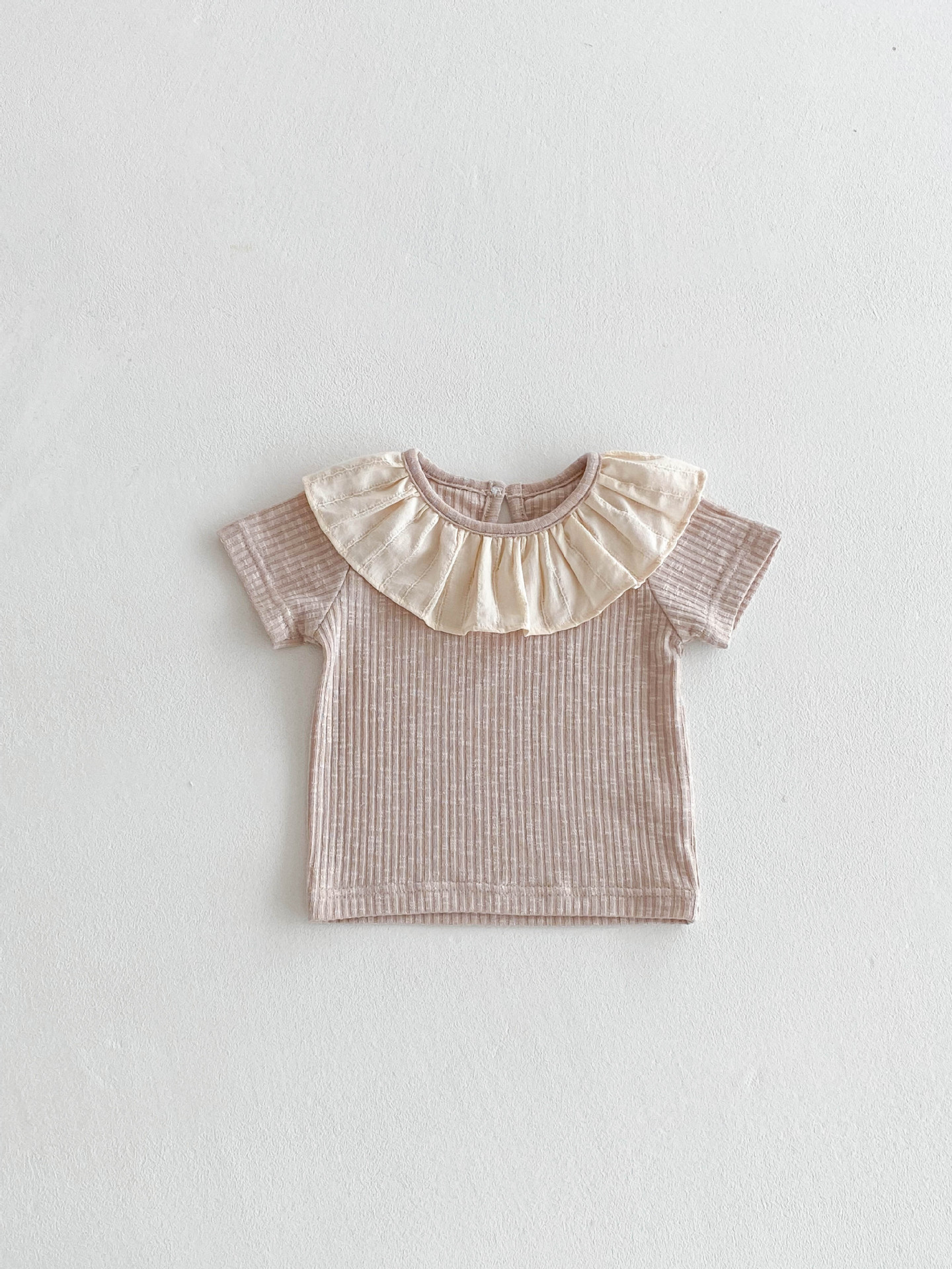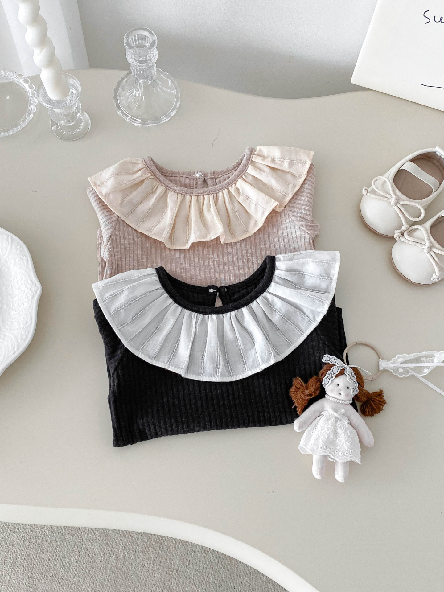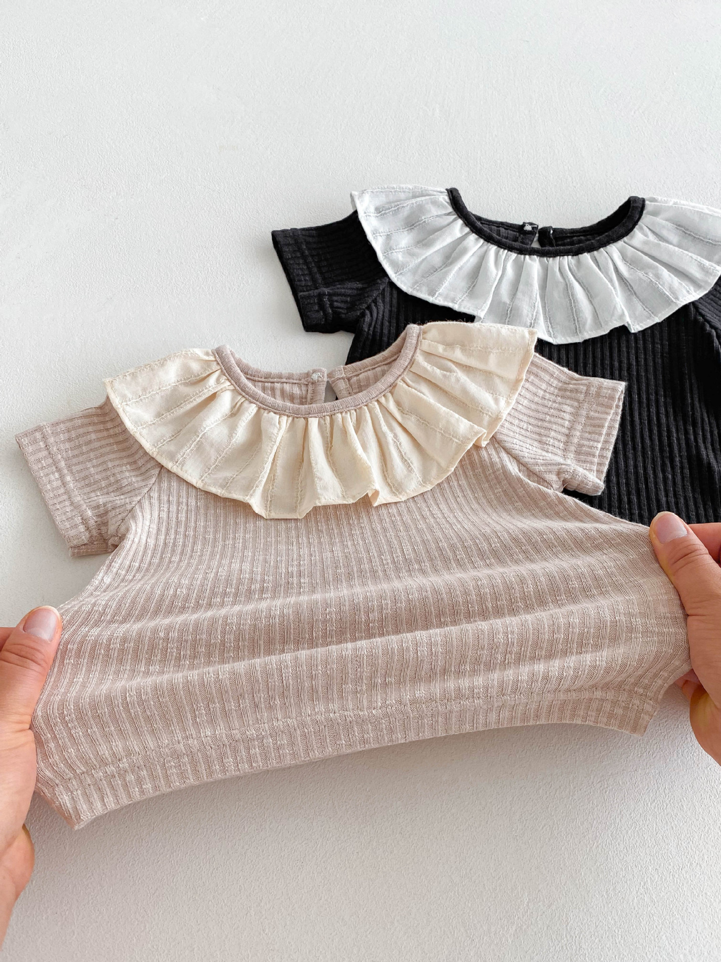 여자 한국 티셔츠 2025 새로운 여름 어린이 레이스 칼라 짧은 소매 여름 아기 서양식 연꽃 잎 칼라 탑