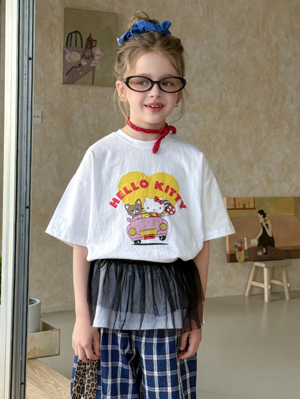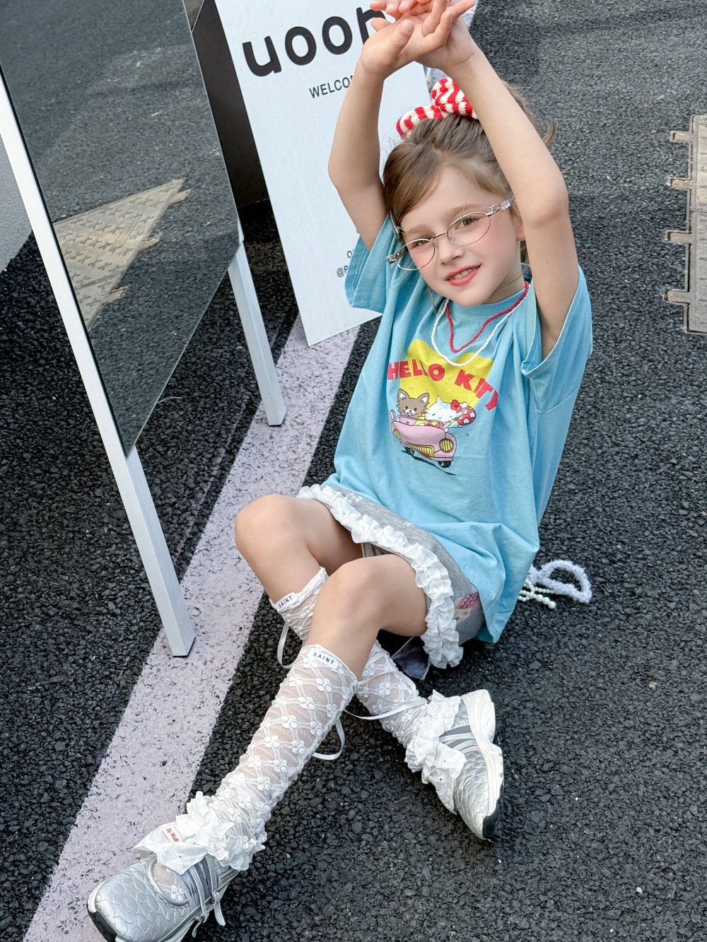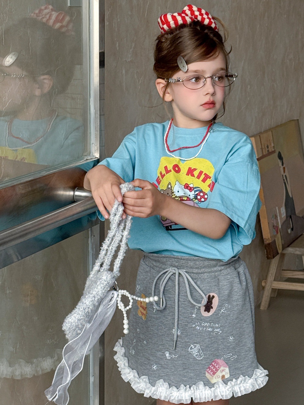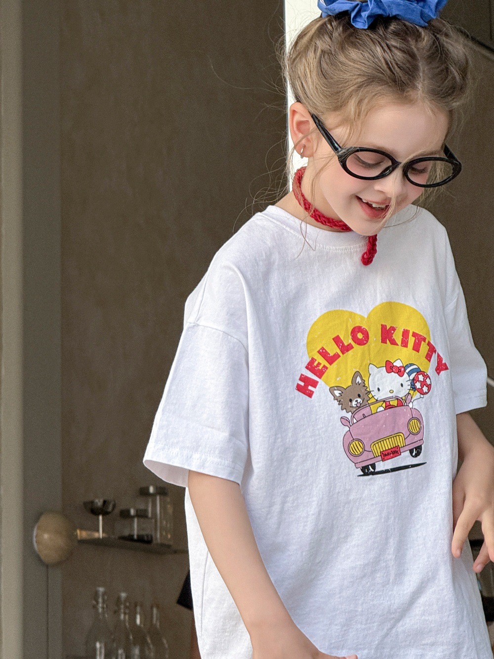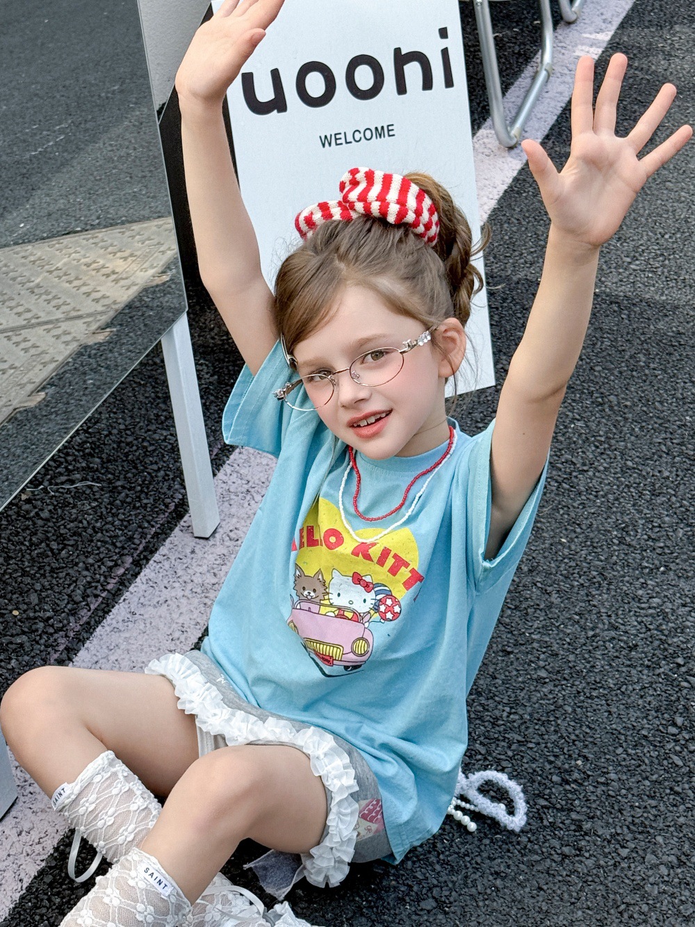 2025 여자 여름 라운드 넥 반팔 어린이 만화 프린트 티셔츠 바닥 셔츠 세련된 중형 및 대형 아동용 반팔 아동복스토어 가기