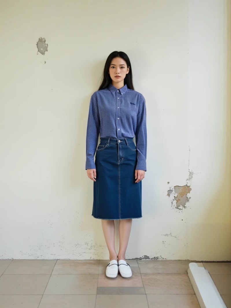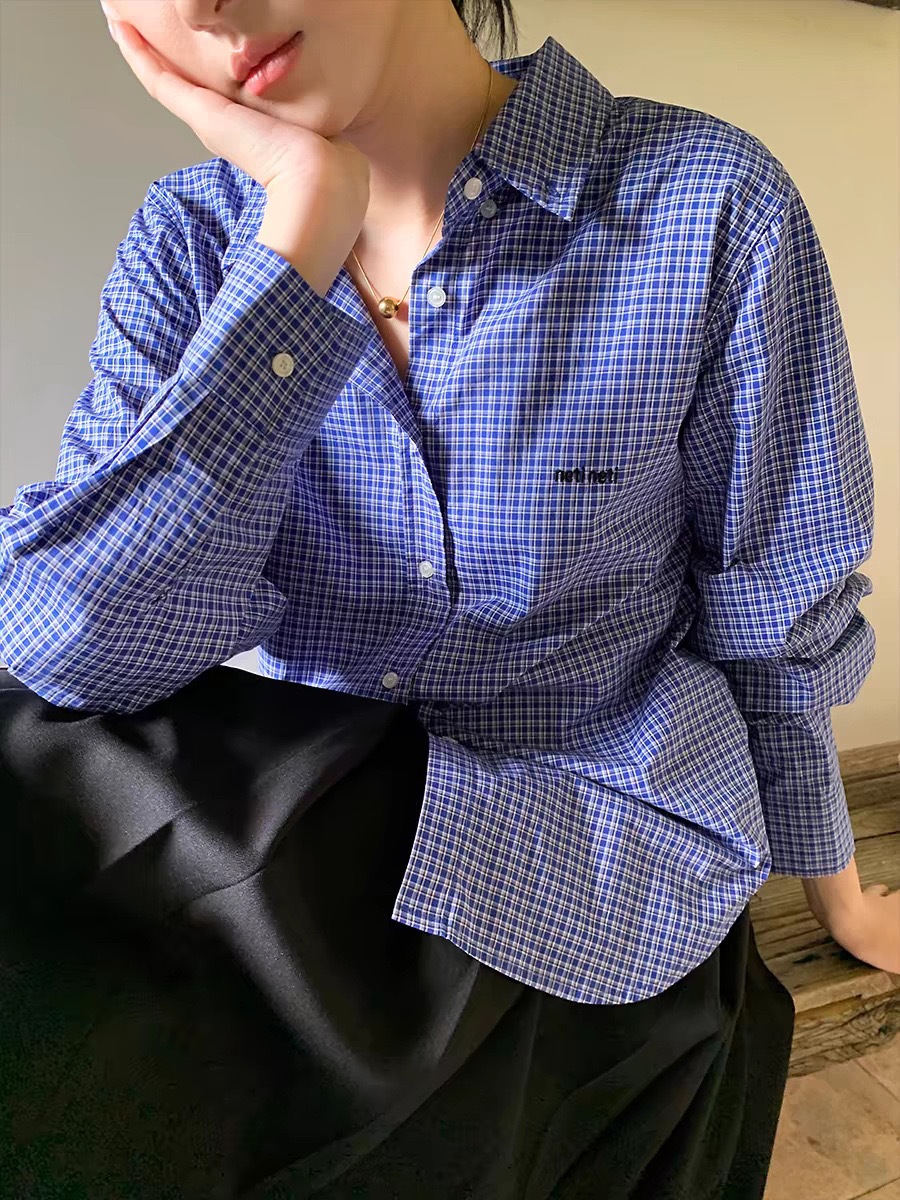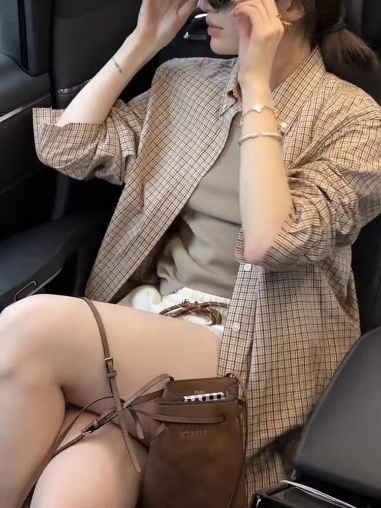 miumiu 여름 가을 아우터 스트라이프 체크 무늬 셔츠 싱글웨어 레이어드 캐주얼 루즈 긴팔 슬리밍 탑 여성용