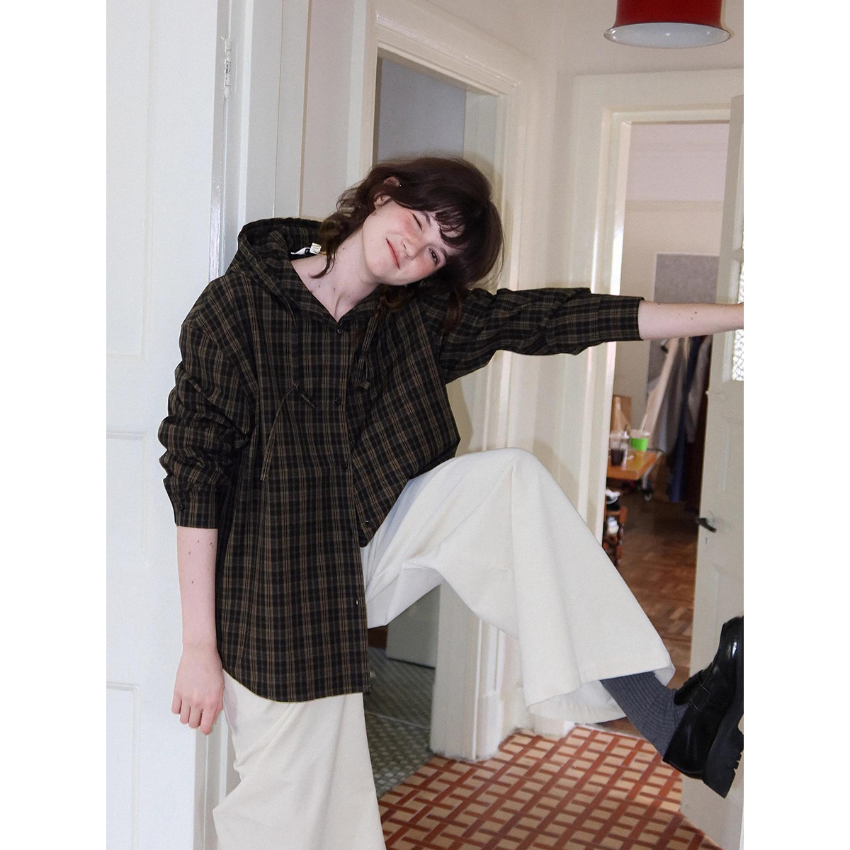 2592 # Letm 레트로 클래식' 여성용 북유럽 가을 경량 후드 체크 무늬 코튼 셔츠 재킷스토어 가기