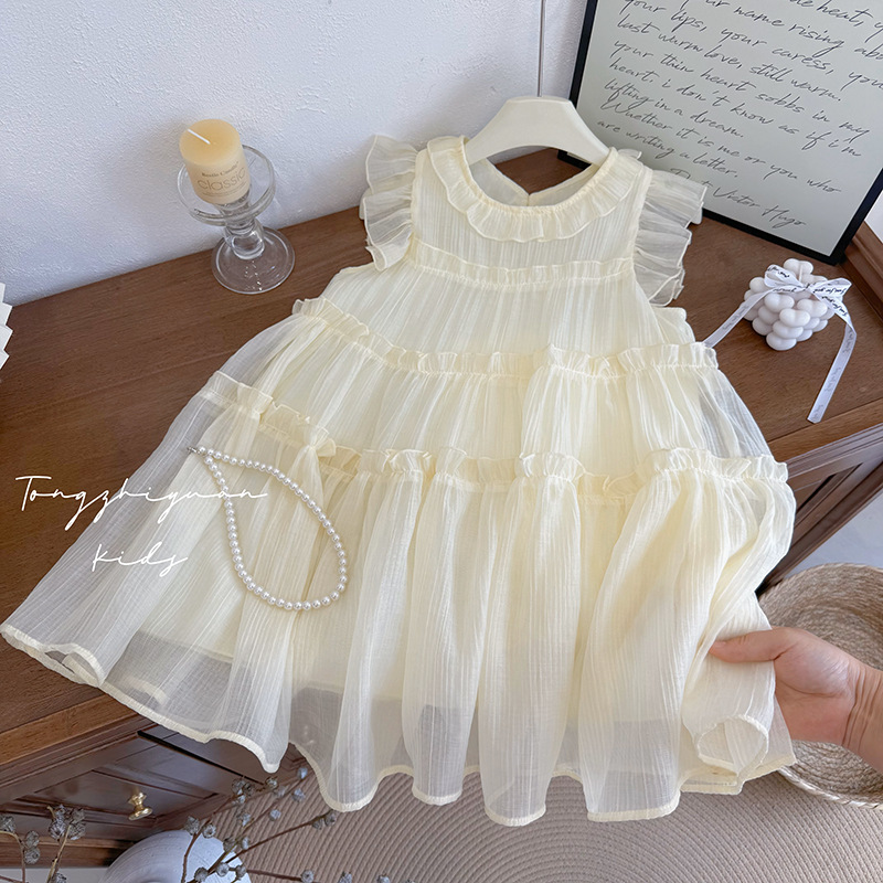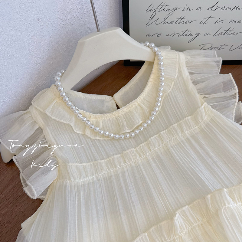 소녀 여름 새로운 베이지 색 작은 비행 소매 원피스 아기 소녀 캐주얼 패션 세련된 품질의 아동복 트렌디 브랜드스토어 가기