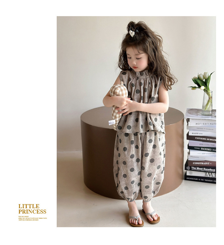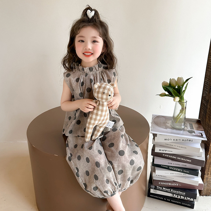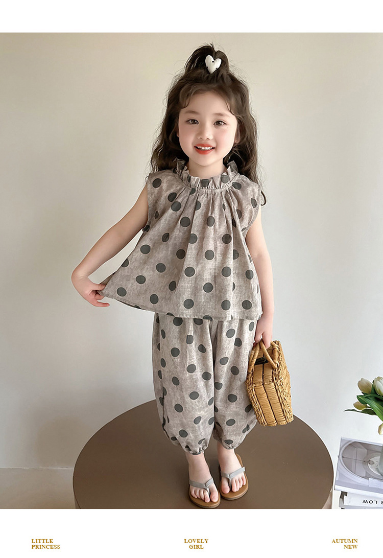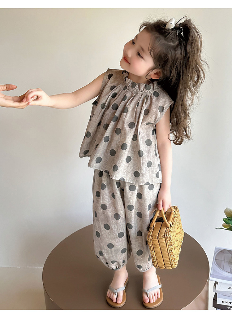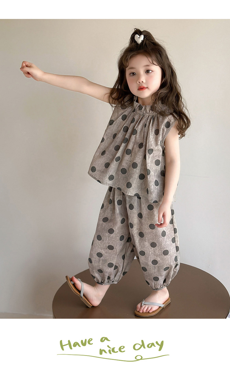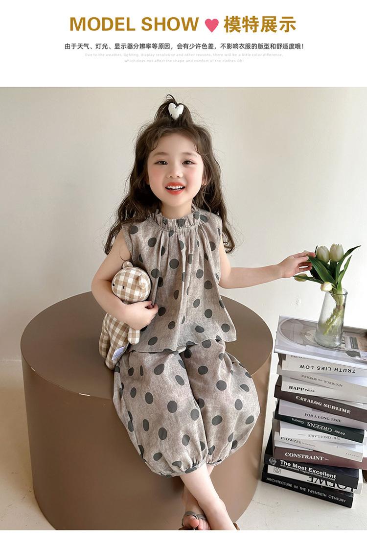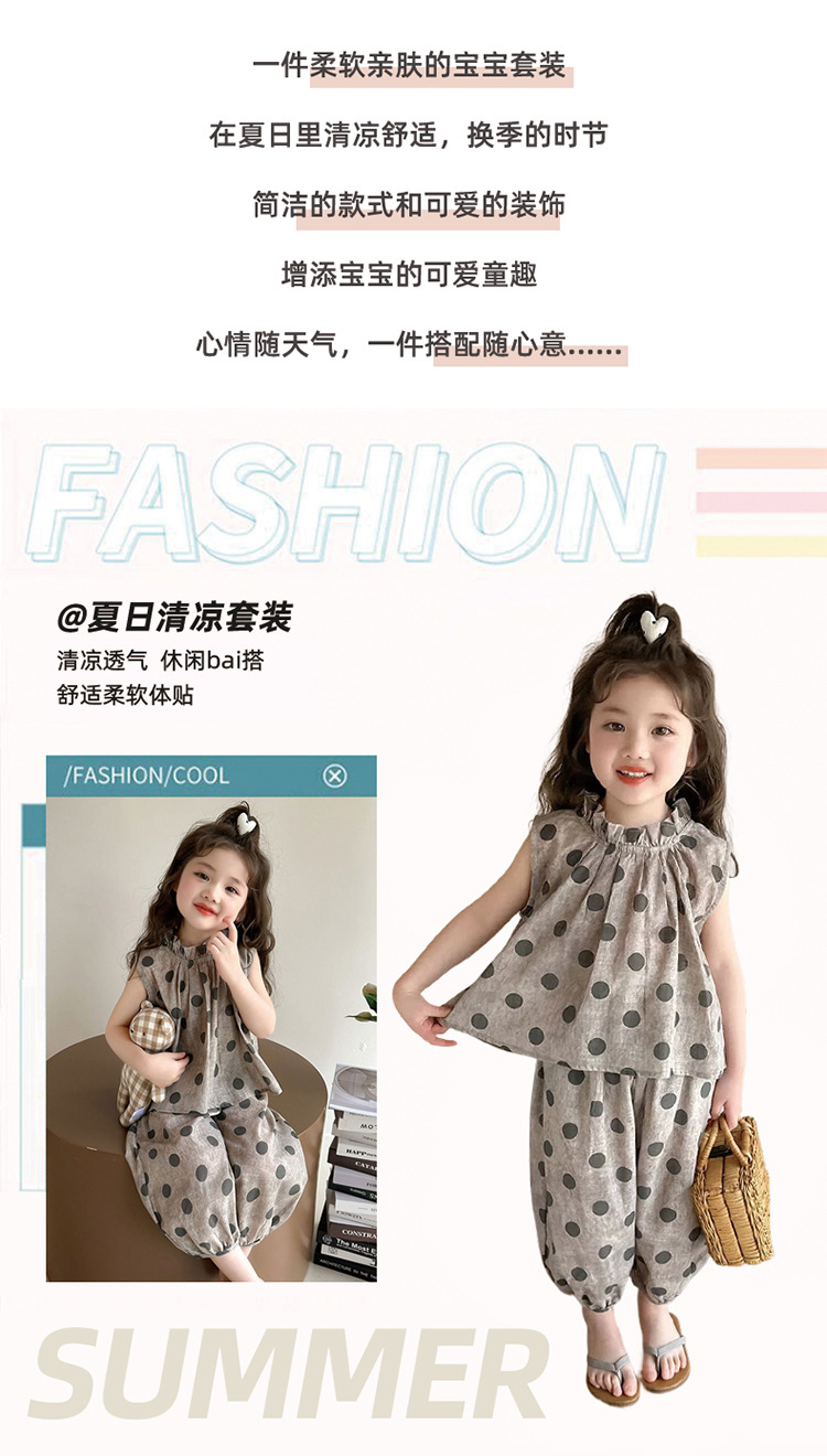 소녀 웨이브 포인트 코튼 앤 리넨 세트 2025 여름 새 패션 소녀 세련된 투피스 세트 중소 어린이 여름 원피스스토어 가기