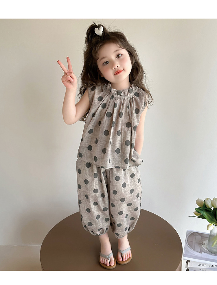소녀 웨이브 포인트 코튼 앤 리넨 세트 2025 여름 새 패션 소녀 세련된 투피스 세트 중소 어린이 여름 원피스