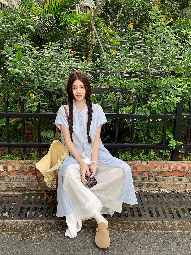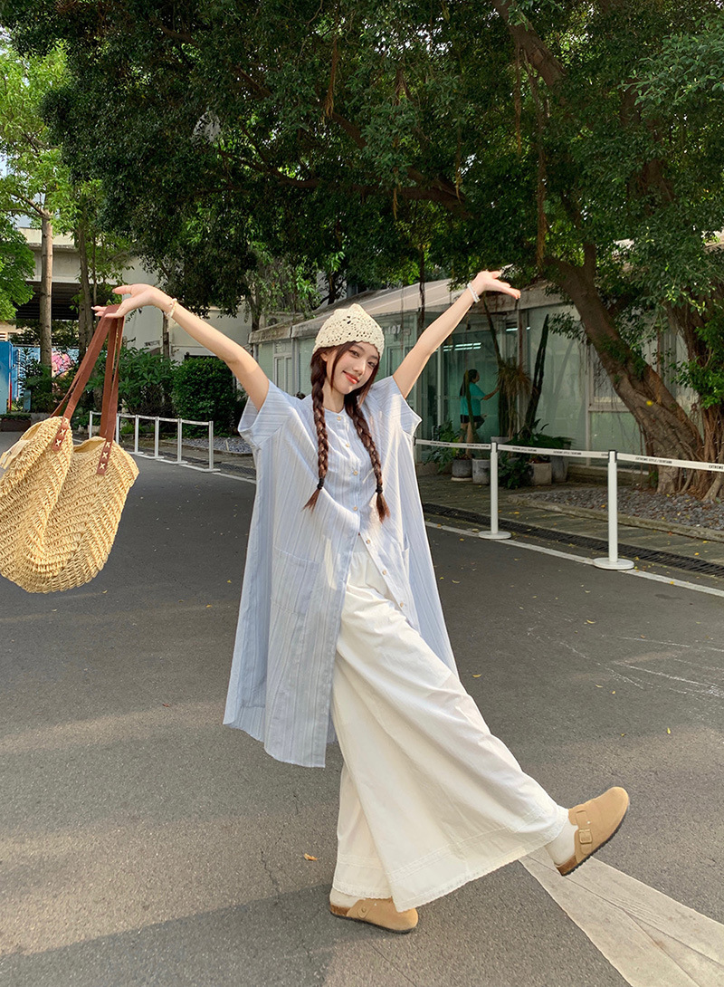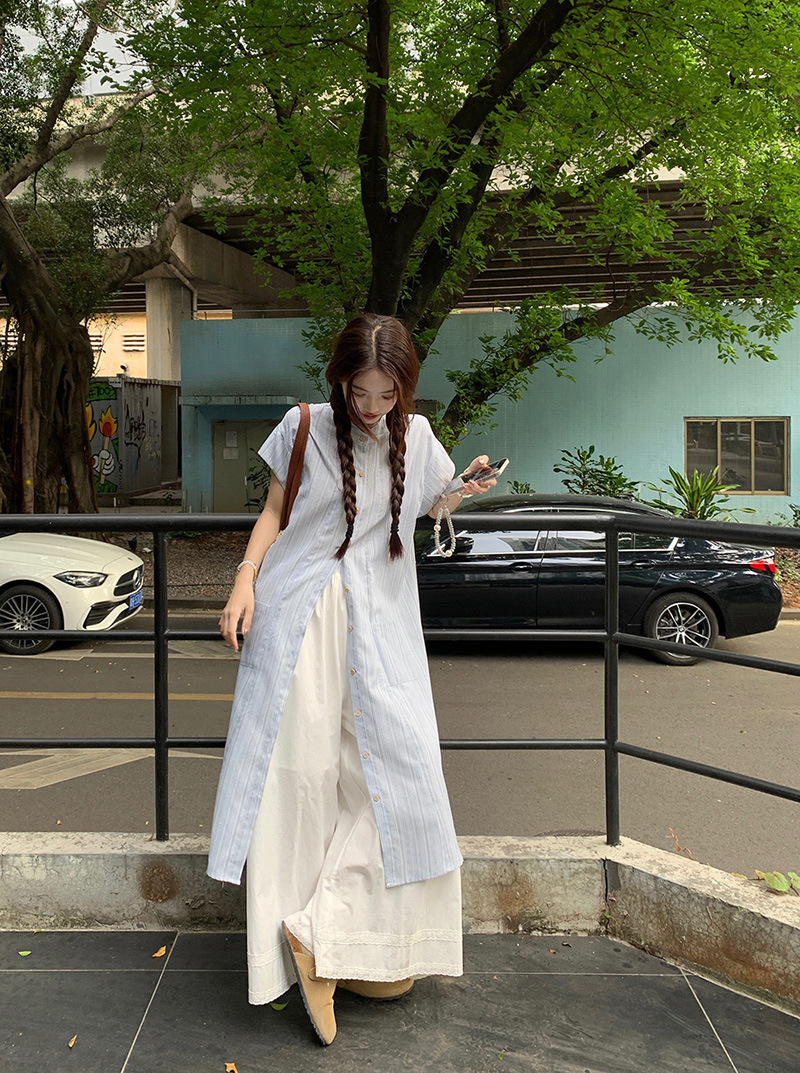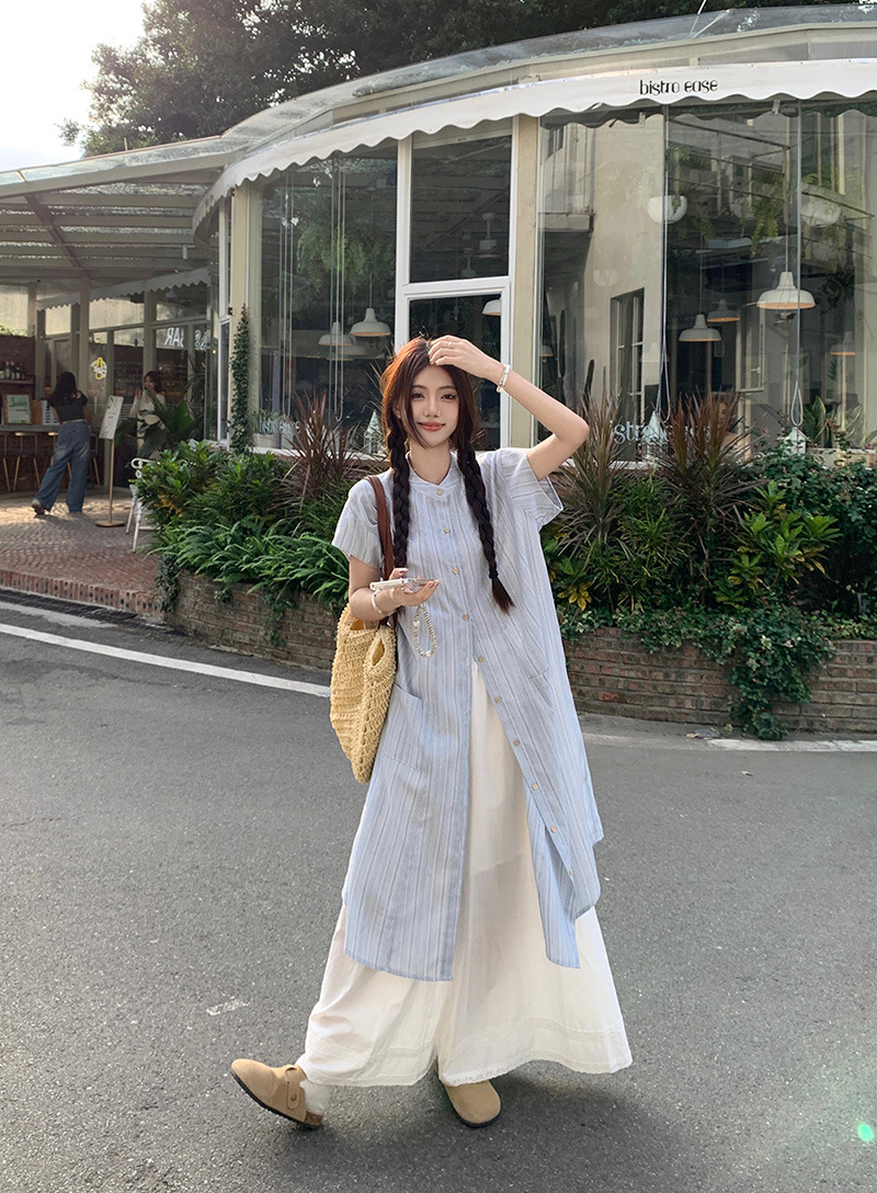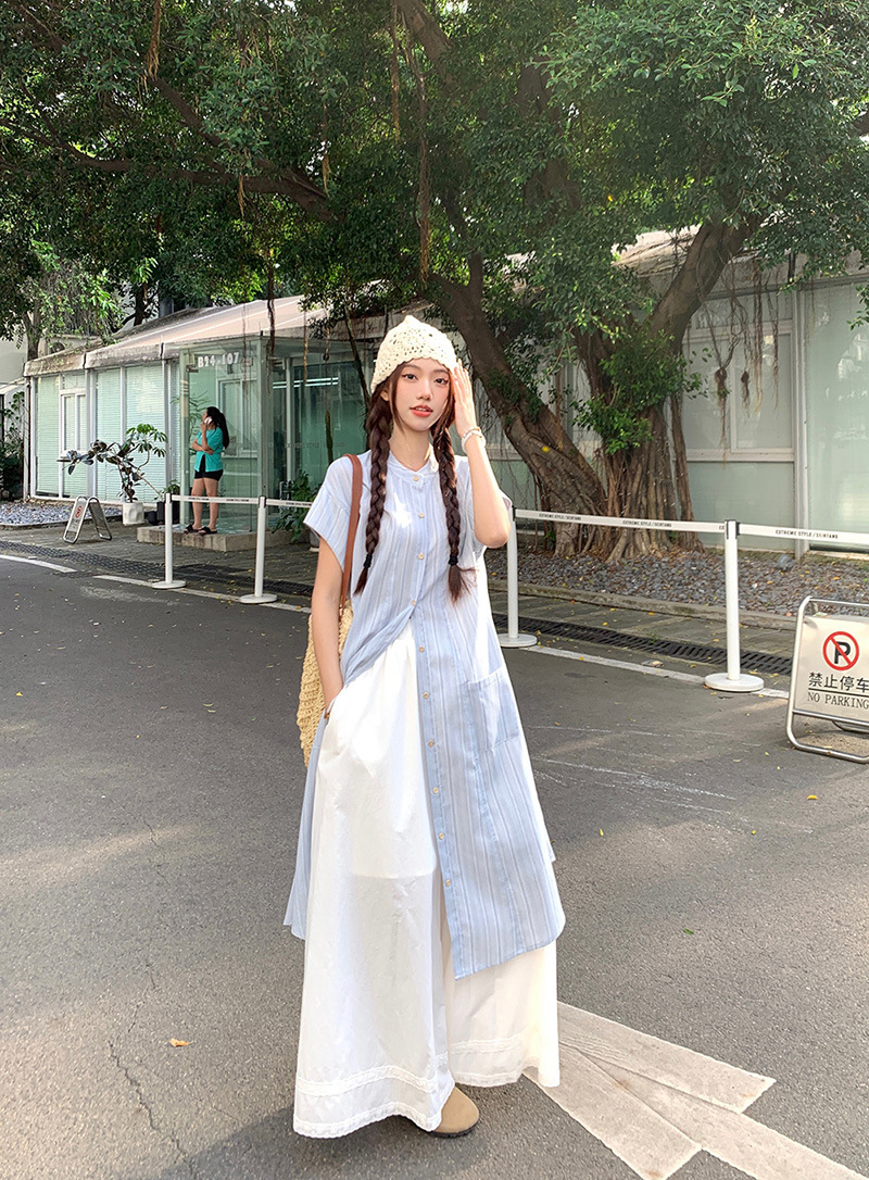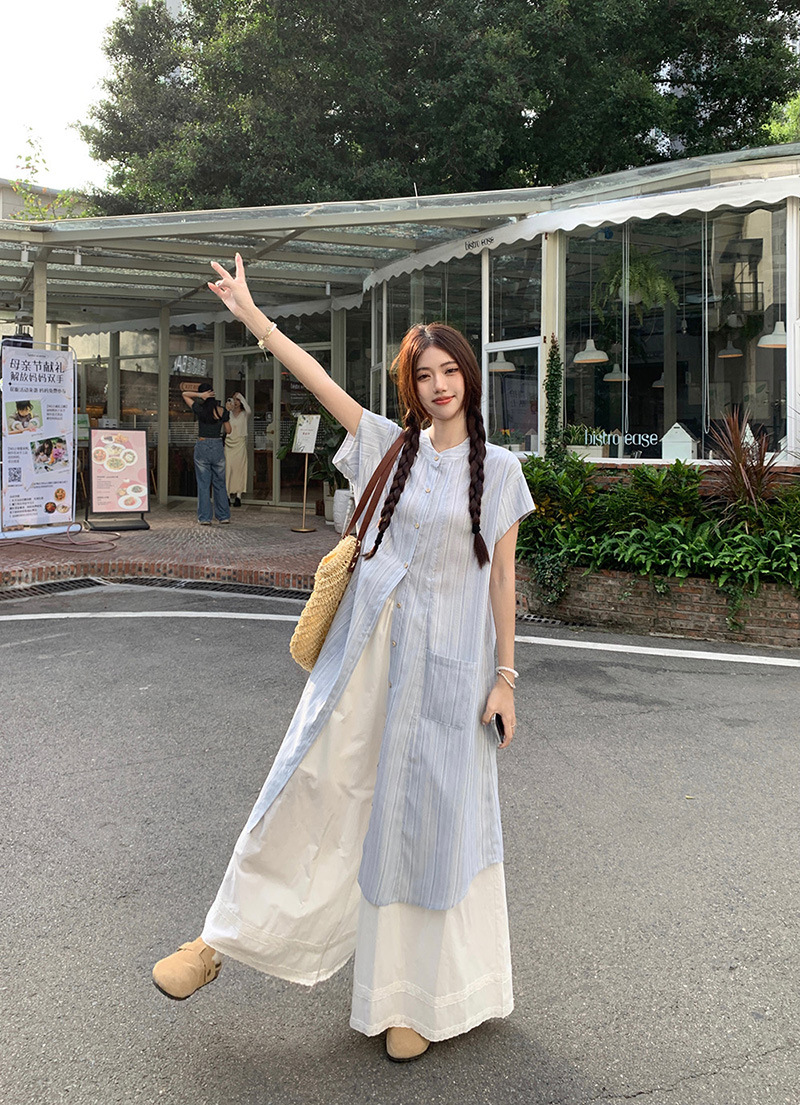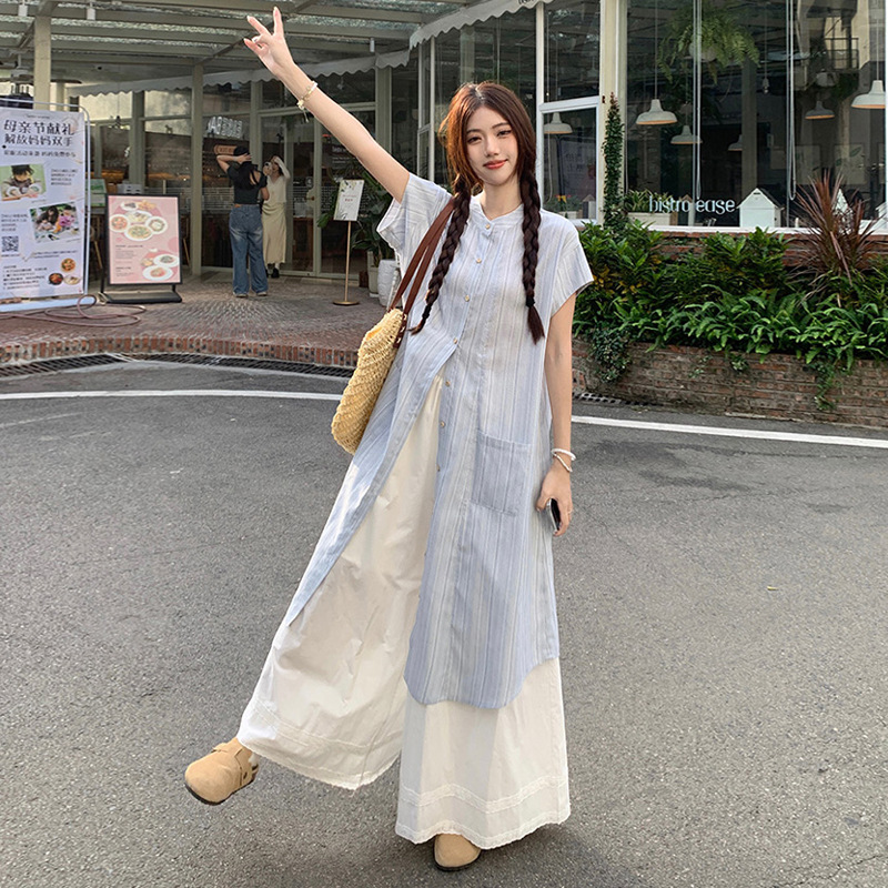 한국 스타일 스트라이프 달콤한 레이어드 세트 여성 여름 2026 신상 셔츠 원피스 와이드 팬츠 스커트 투피스 세트스토어 가기