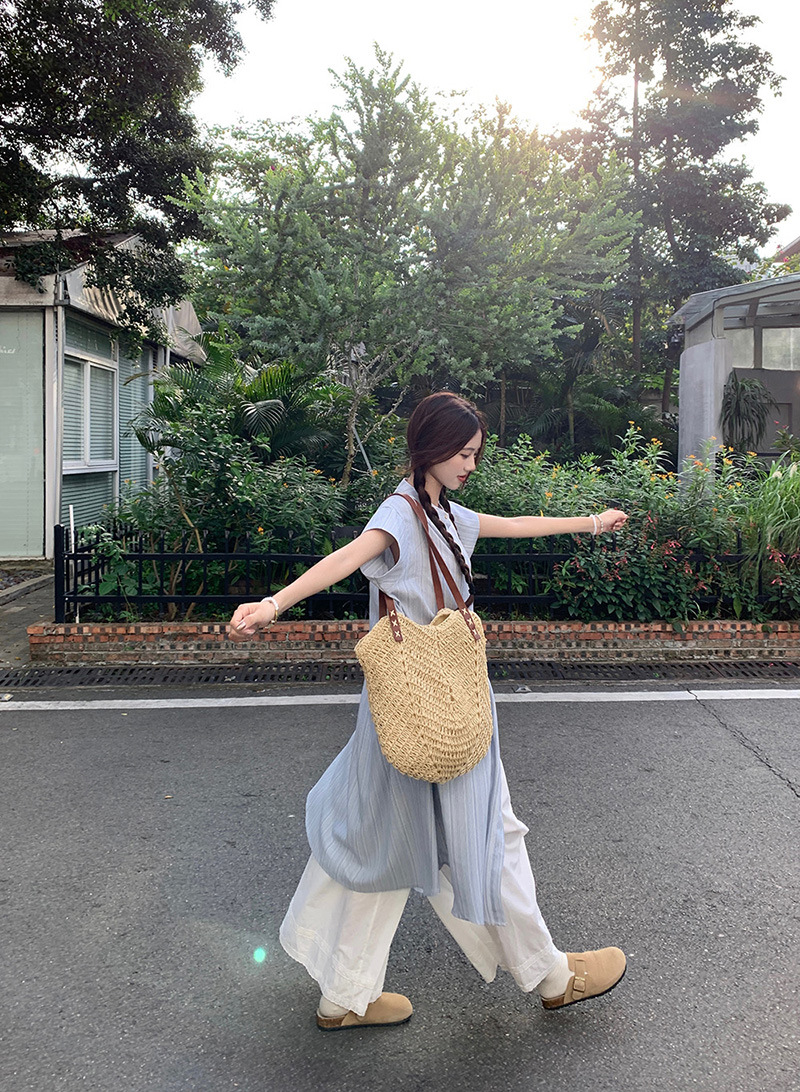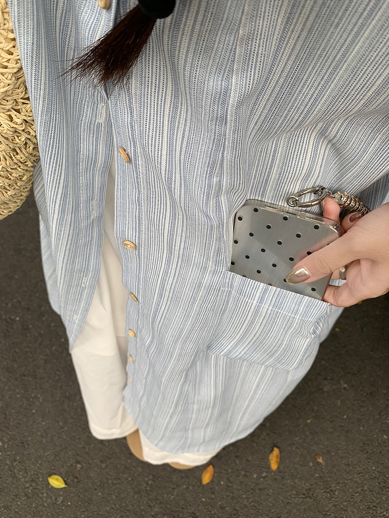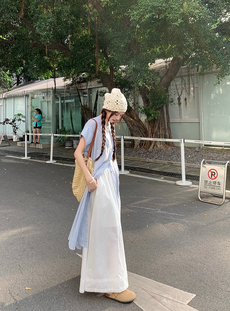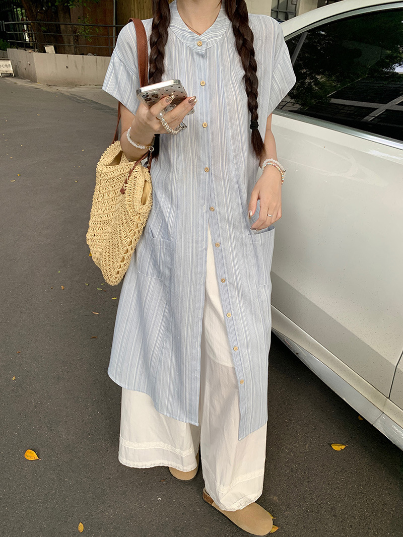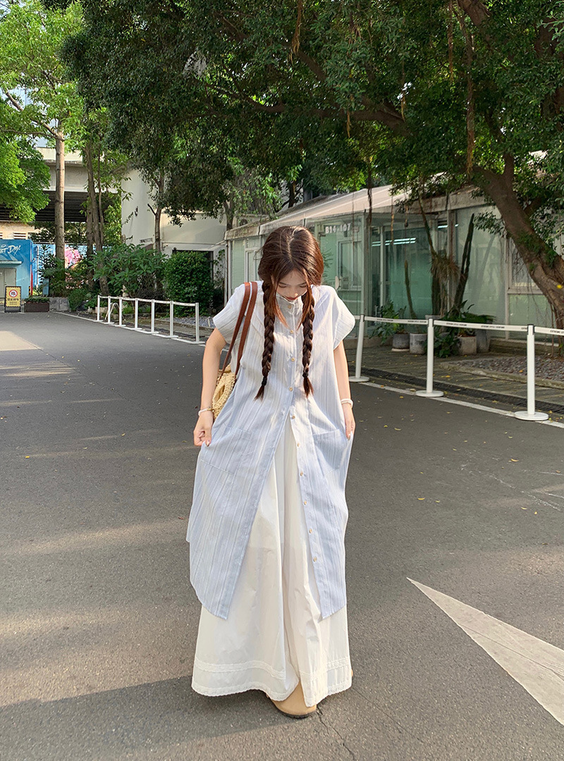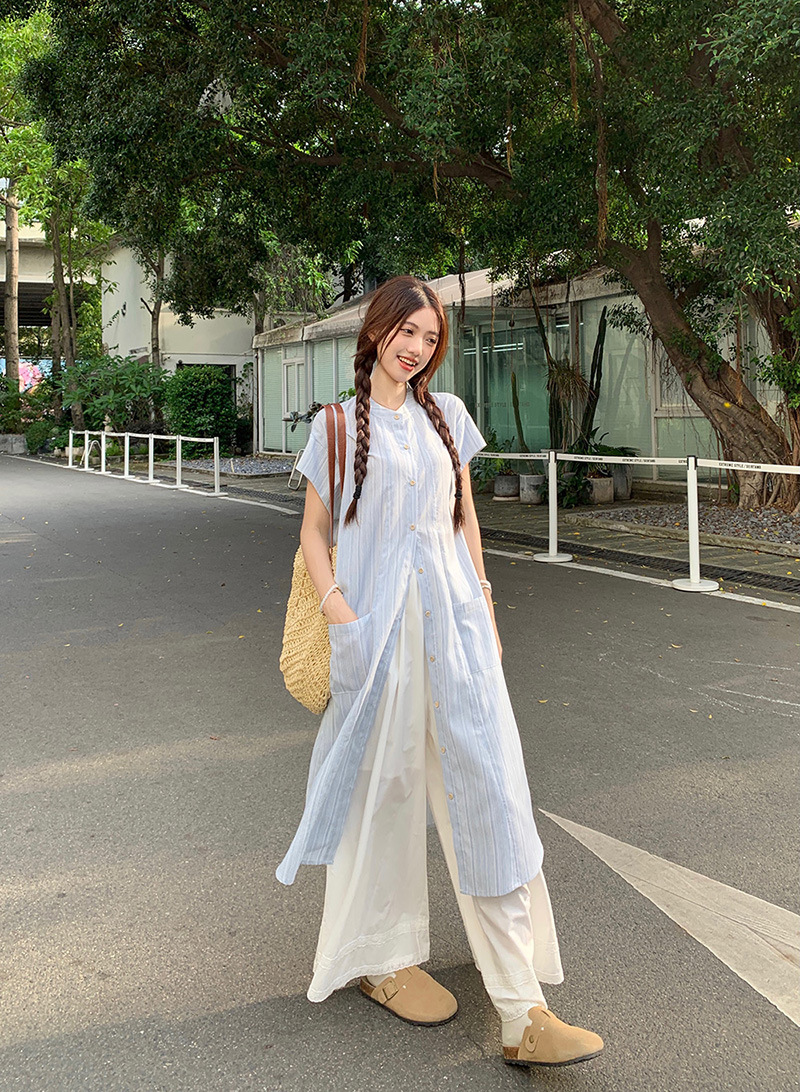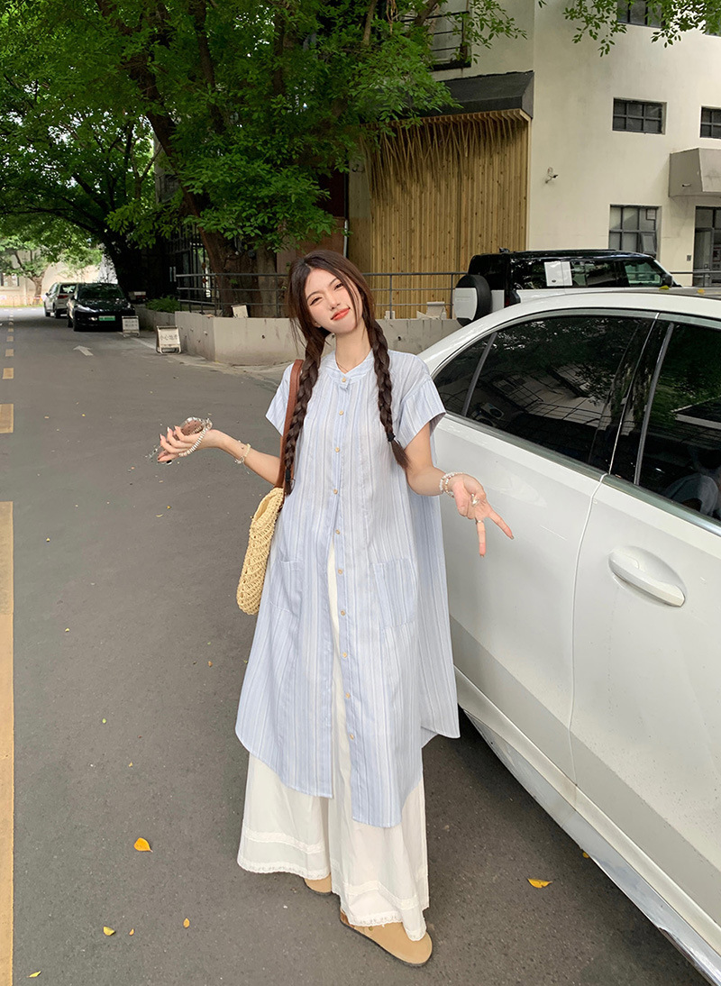 한국 스타일 스트라이프 달콤한 레이어드 세트 여성 여름 2026 신상 셔츠 원피스 와이드 팬츠 스커트 투피스 세트스토어 가기