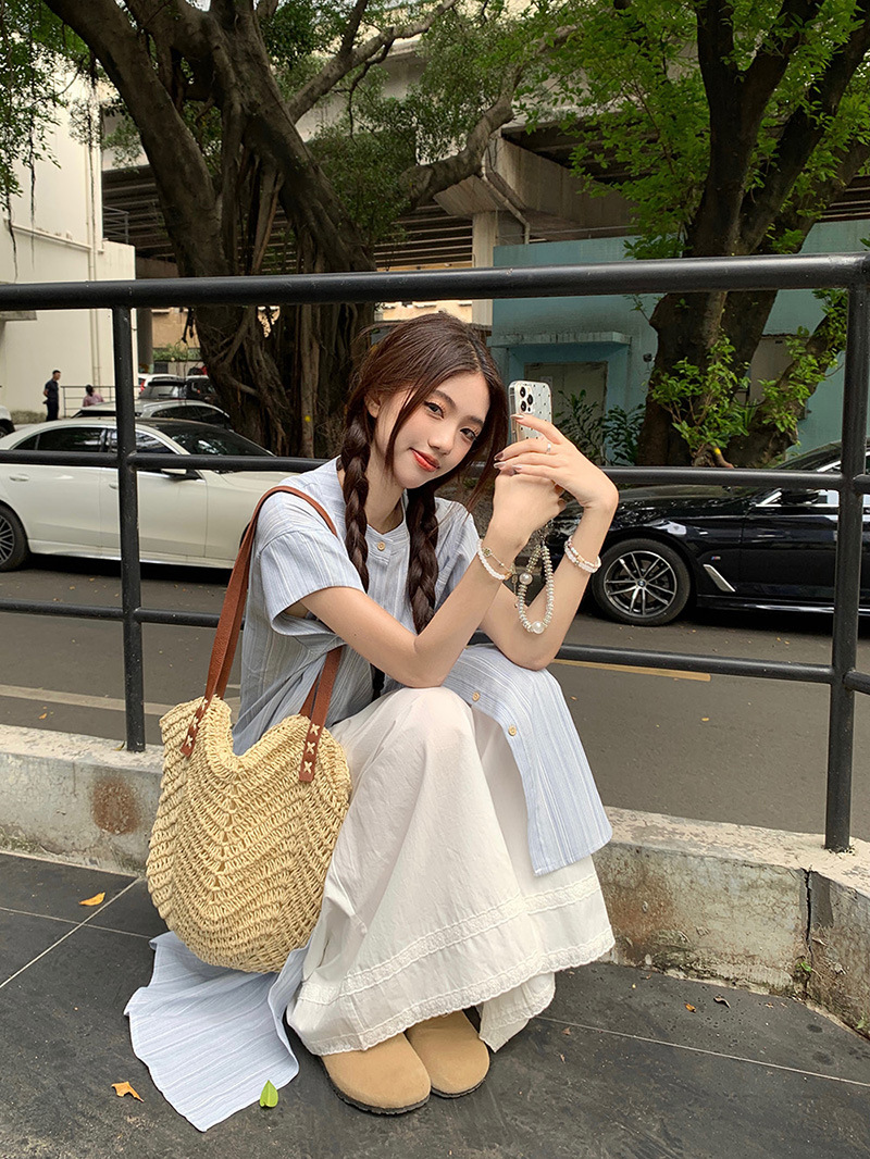 한국 스타일 스트라이프 달콤한 레이어드 세트 여성 여름 2026 신상 셔츠 원피스 와이드 팬츠 스커트 투피스 세트