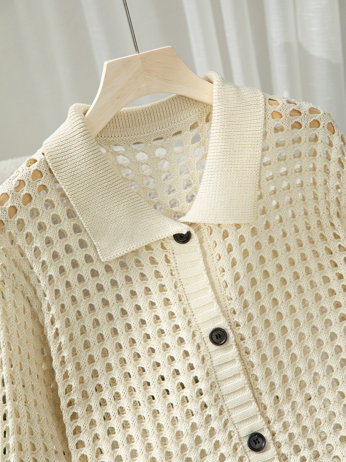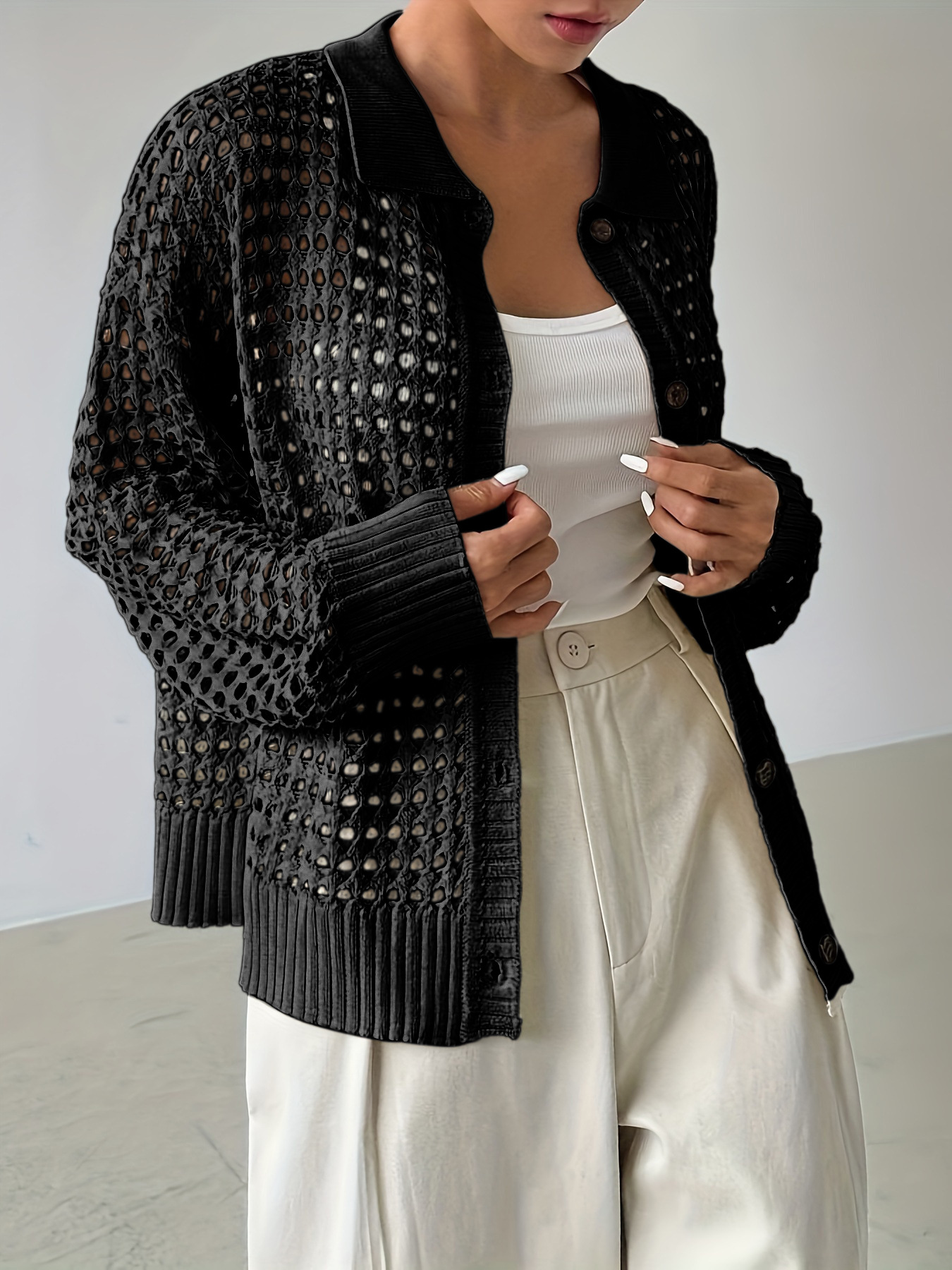 봄 가을 새로운 여성 속이 빈 니트 솔리드 컬러 우아한 휴가 긴 소매 싱글 브레스트 니트 카디건 스웨터 여성