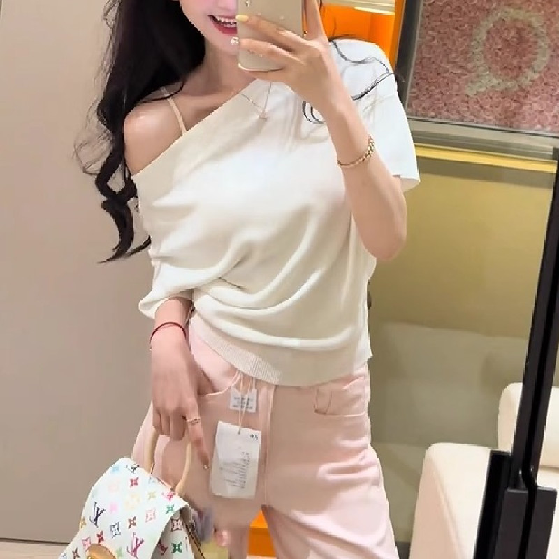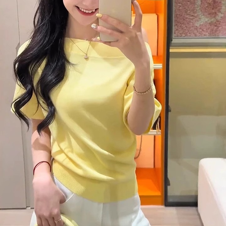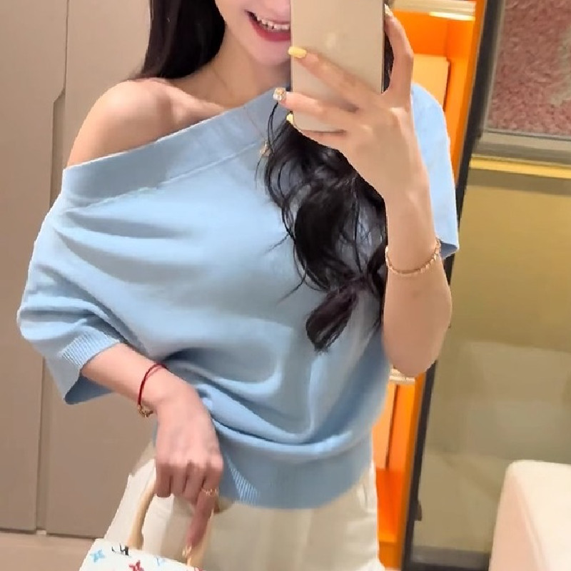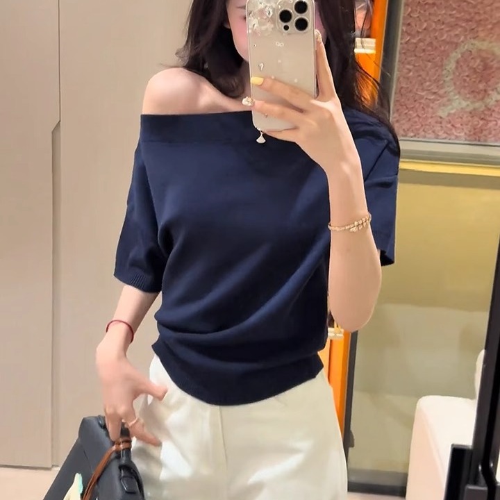 Pure Desire 스타일 원라인 칼라 오프 숄더 반팔 울 스웨터 여성 2025 여름 새로운 디자인 슬림 다용도 탑스토어 가기