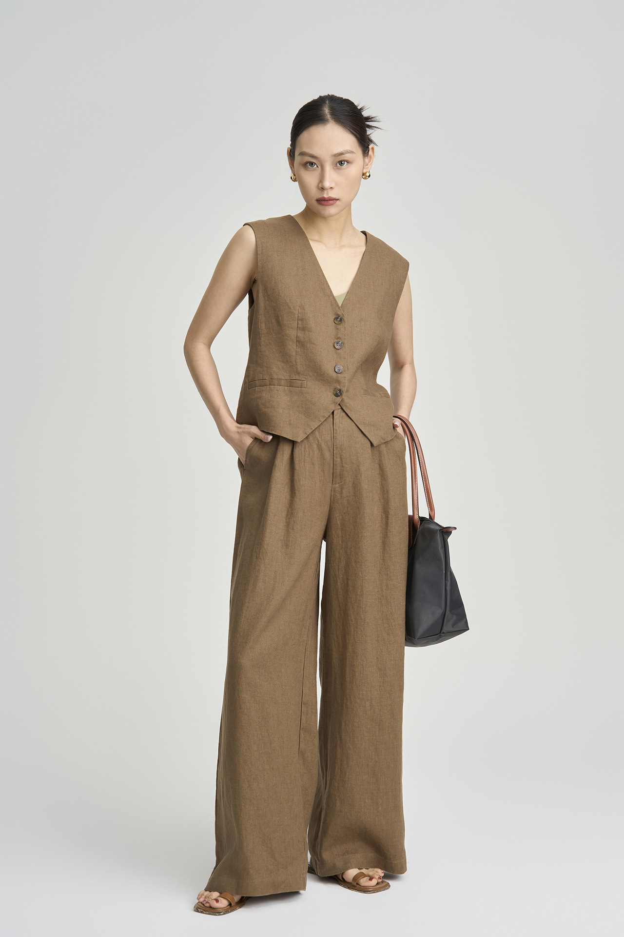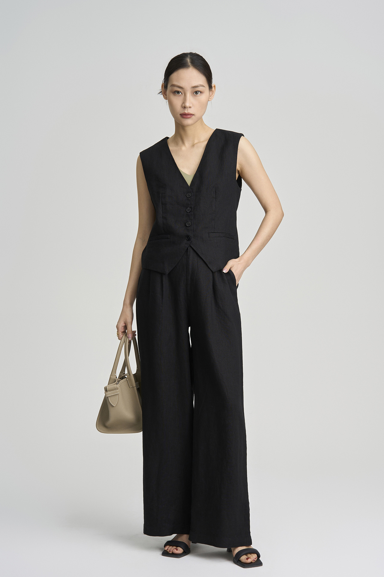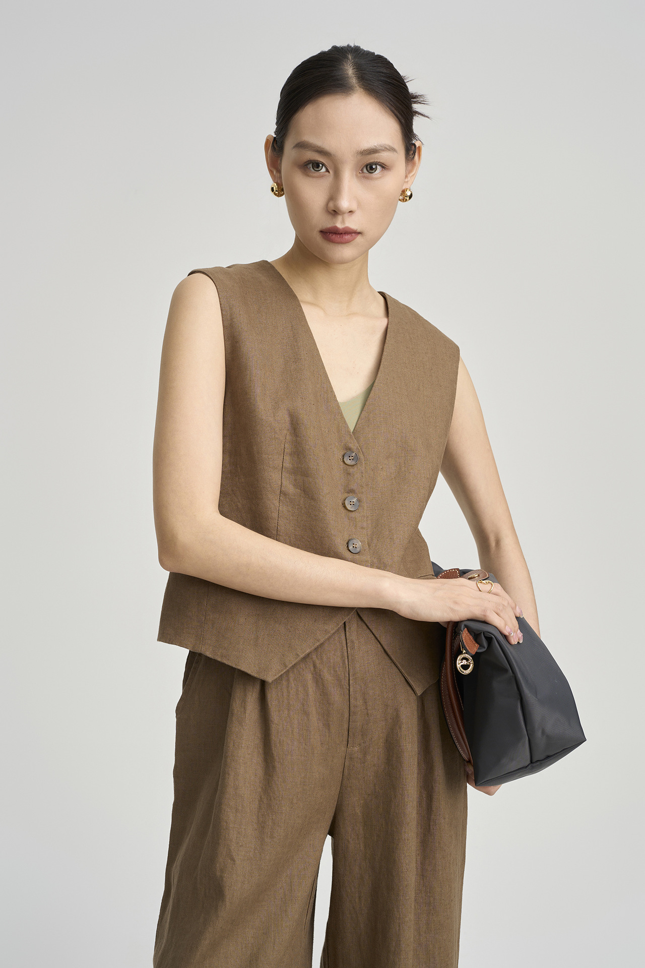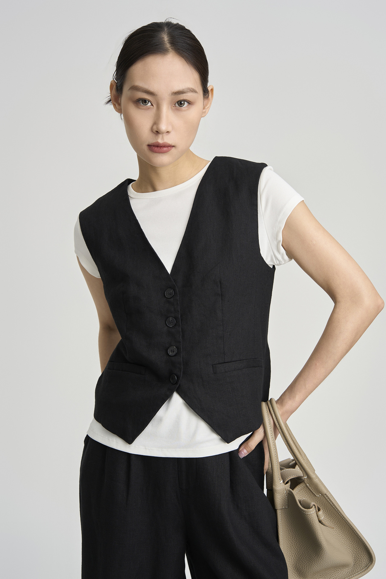 세련된 외부 플레인 리넨 세트 조끼 2025 봄 새로운 올 매치 V 넥 민소매 슬림 핏 탑스토어 가기