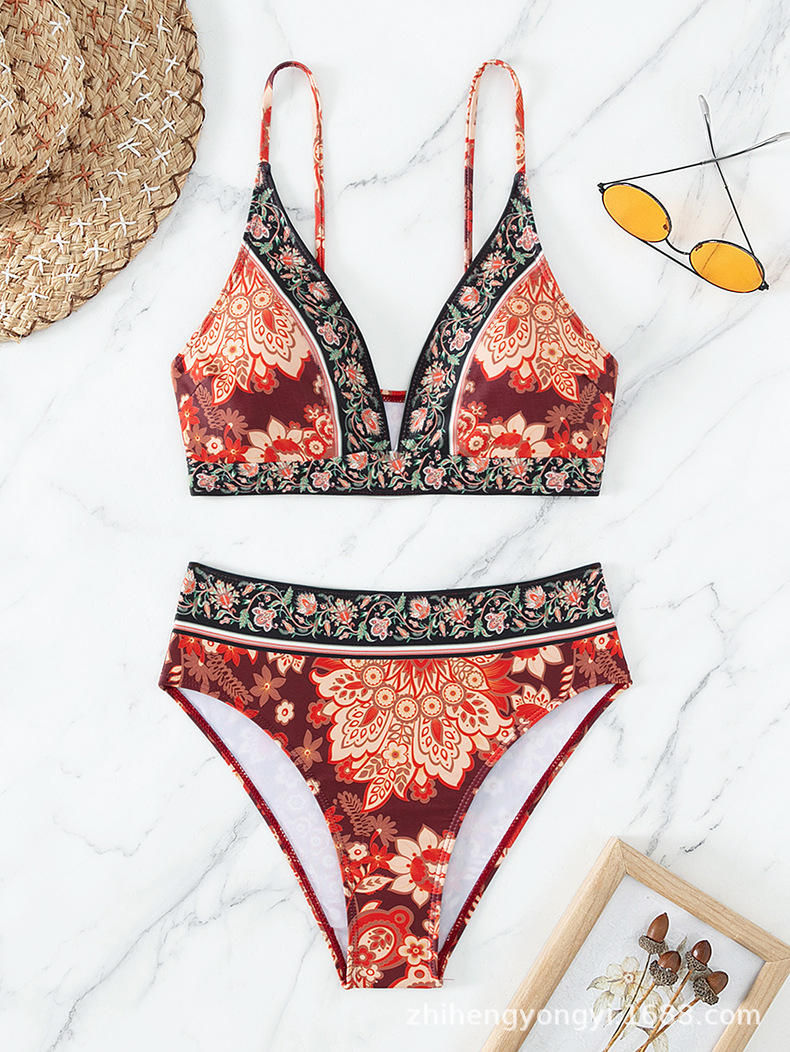 2025 새로운 유럽과 미국의 스플릿 비키니 수영복 하이 웨이스트 프린트 보헤미안 스타일 섹시한 국경 간 대외 무역 수영복