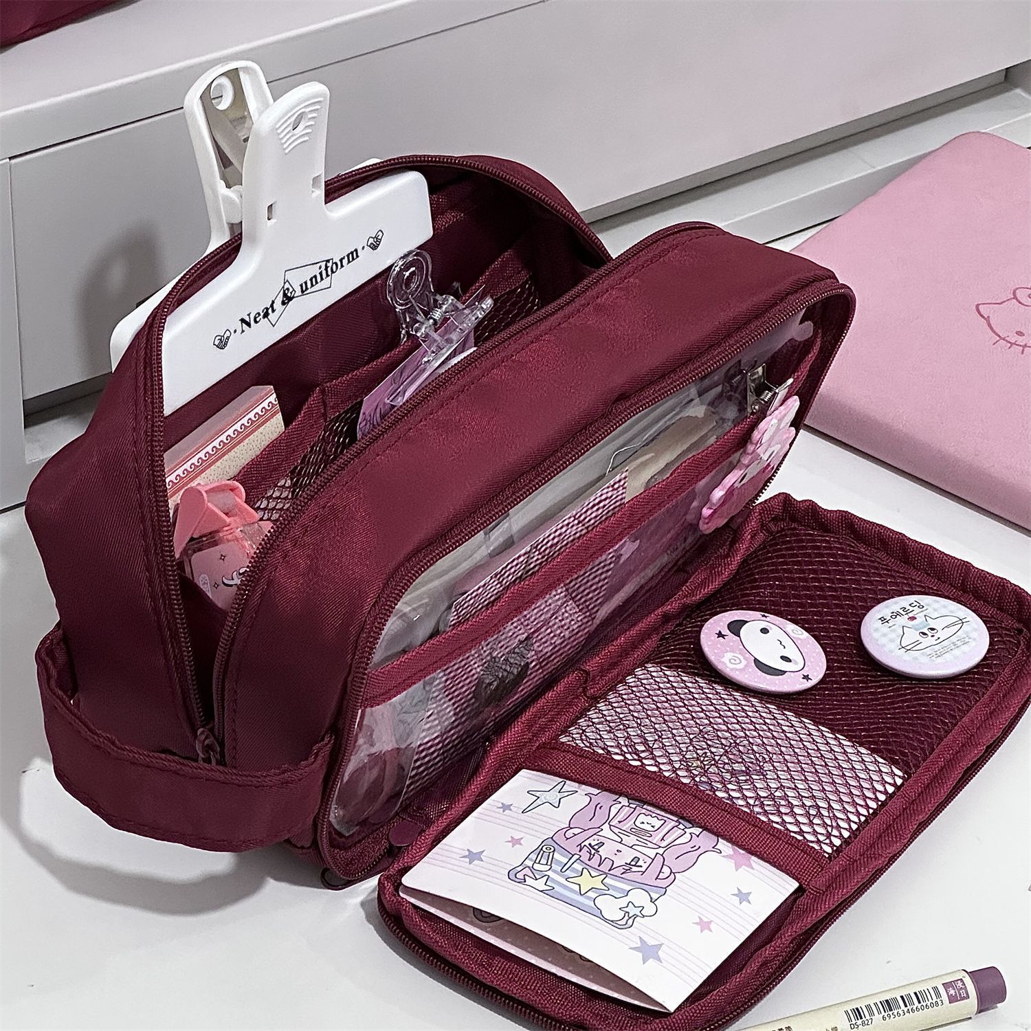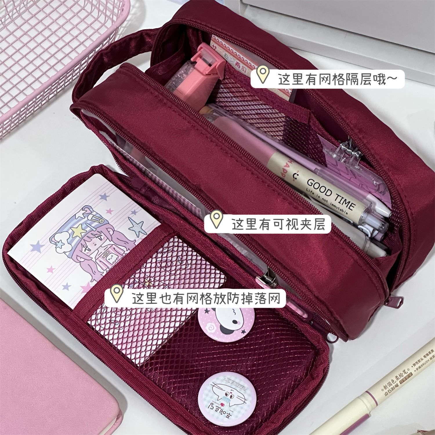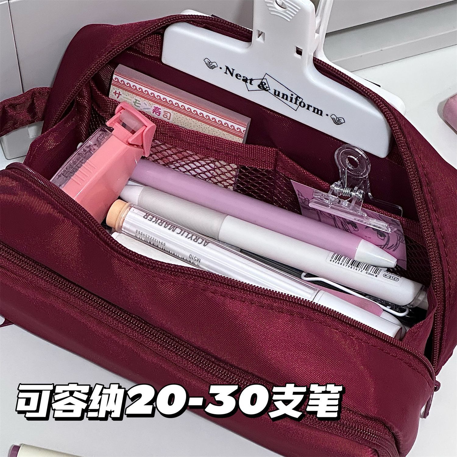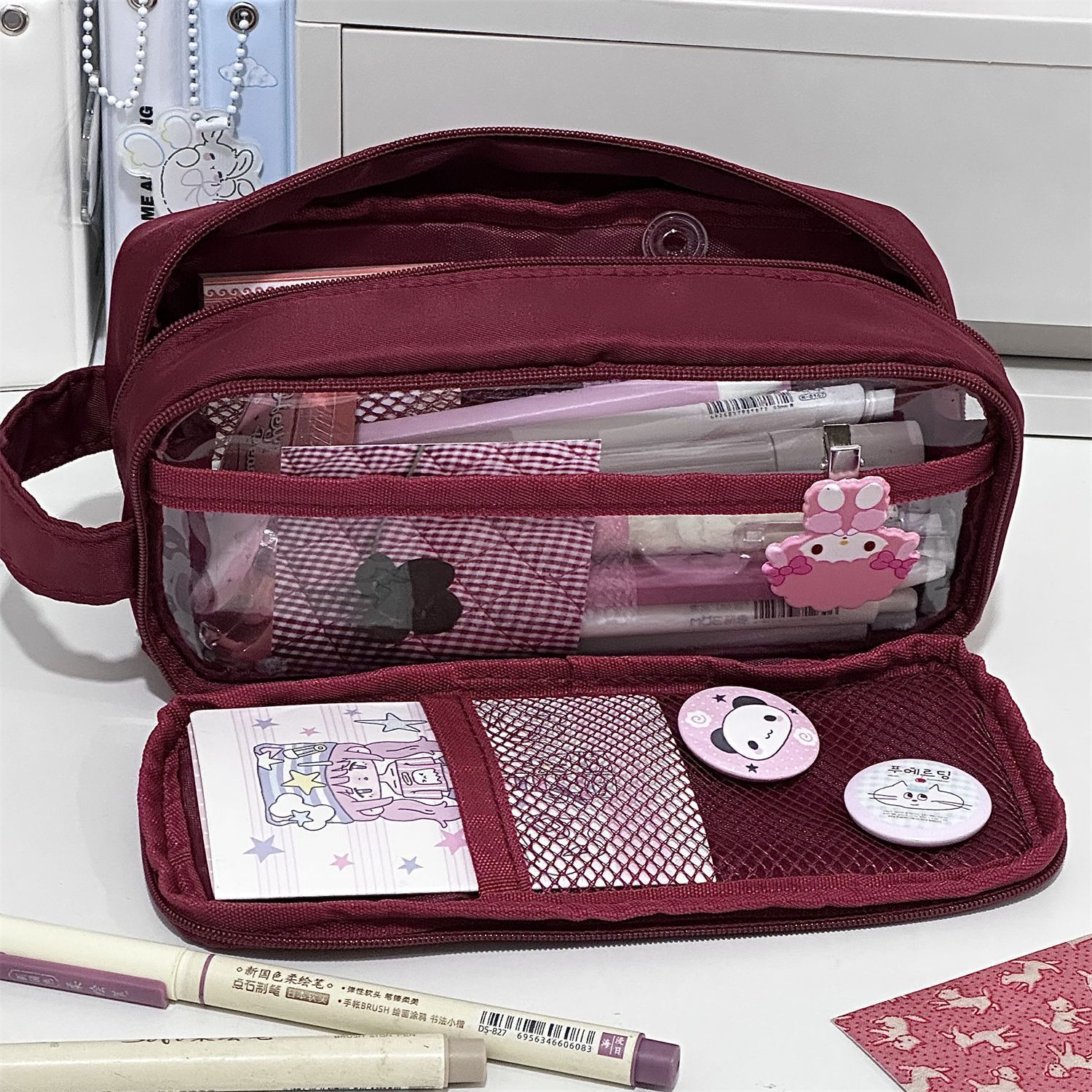 일본어 Xiaohongshu 부르고뉴 더블 지퍼 휴대용 펜 가방 ins 고가치 다기능 대용량 학생 문구 상자스토어 가기