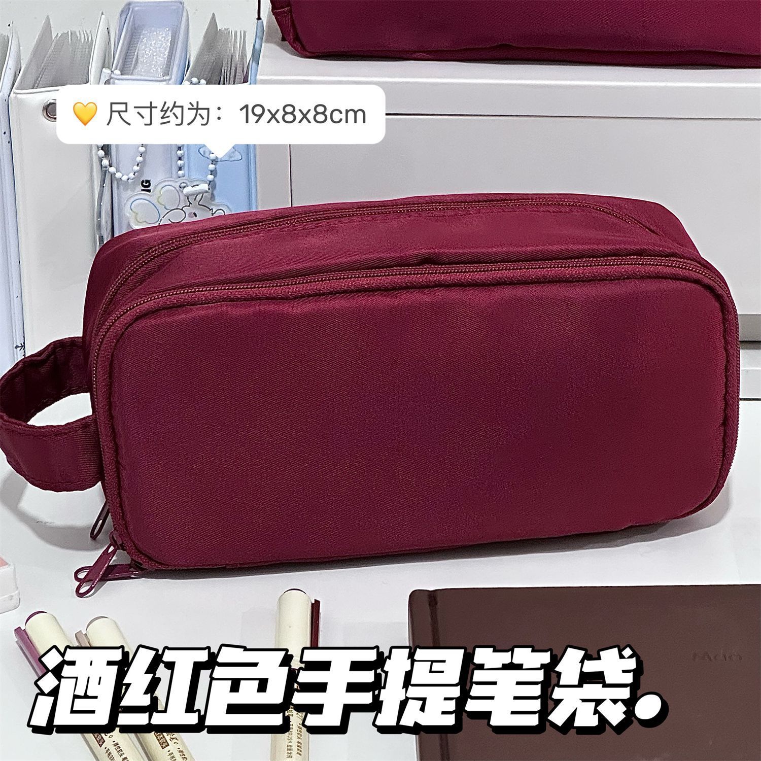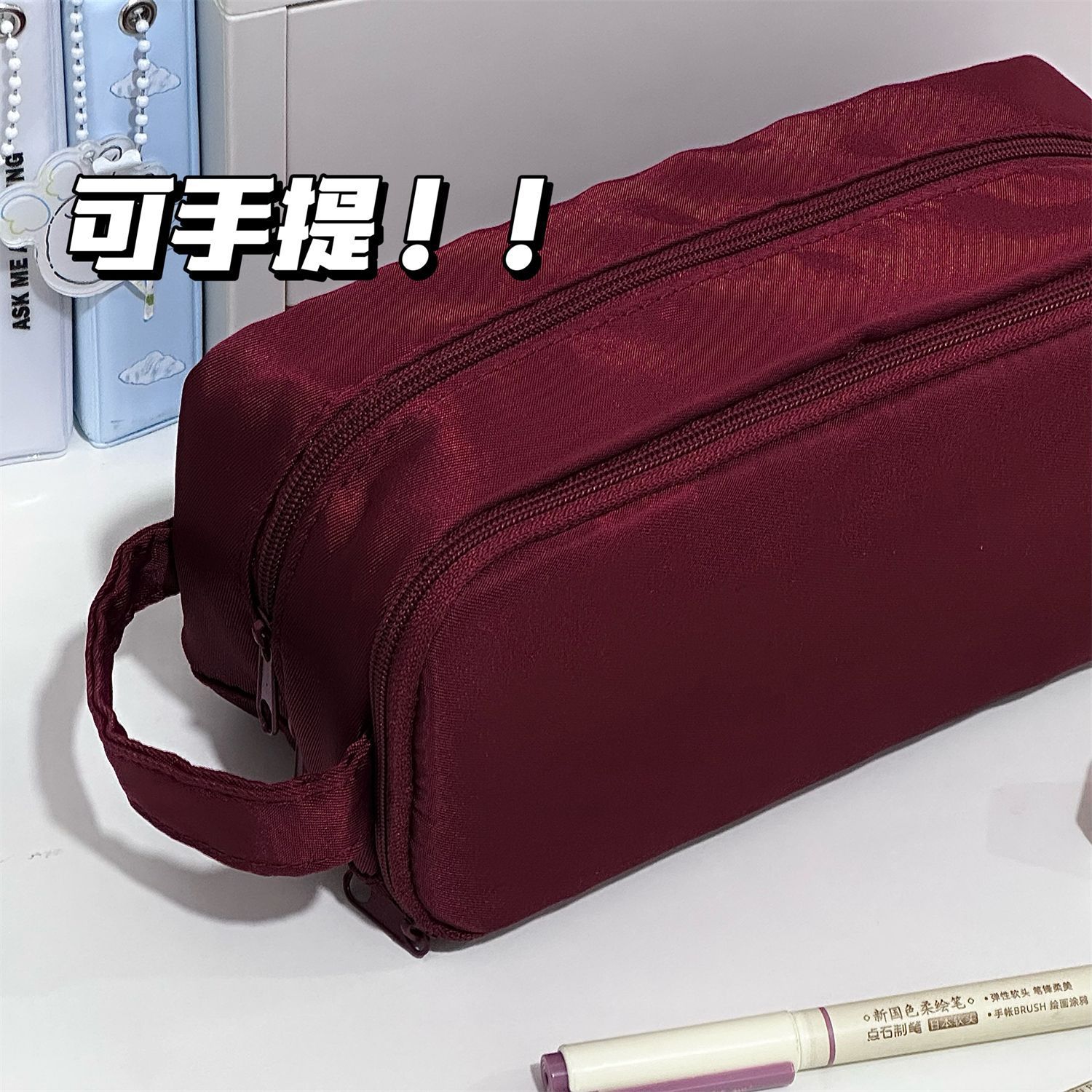 日系小红书酒红双拉链手提笔袋ins高颜值多功能大容量学生文具盒
