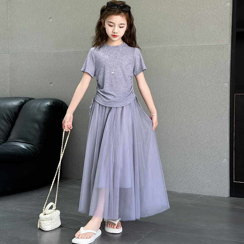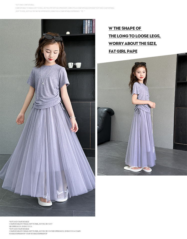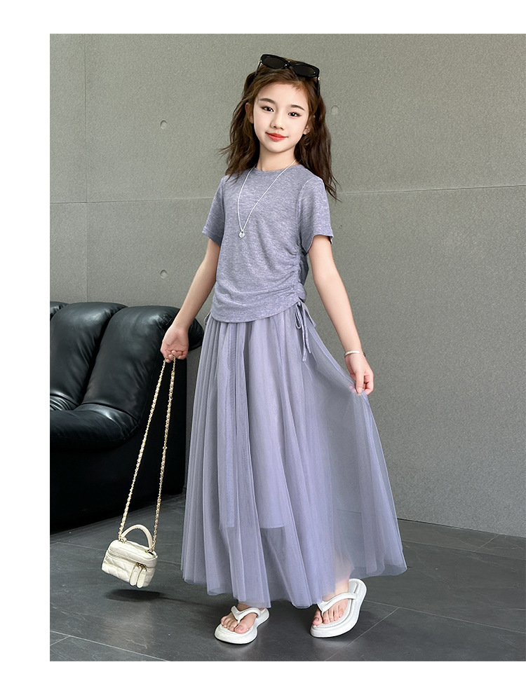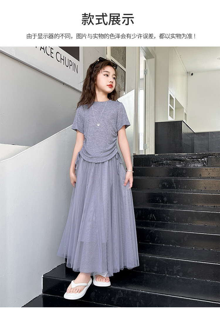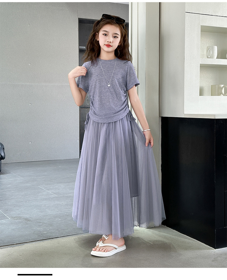 소녀 거즈 스커트 세트 2025 여름 새로운 큰 어린이 한국 스타일 유행 drawstring 짧은 소매 스커트 긴 스커트 투피스 패션