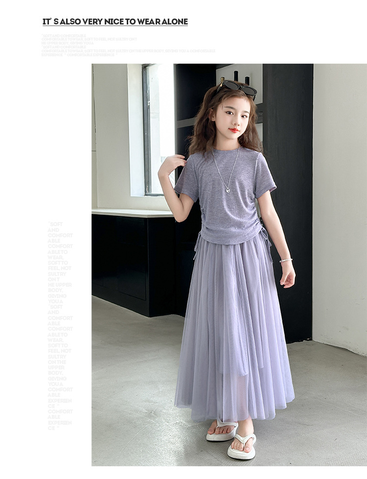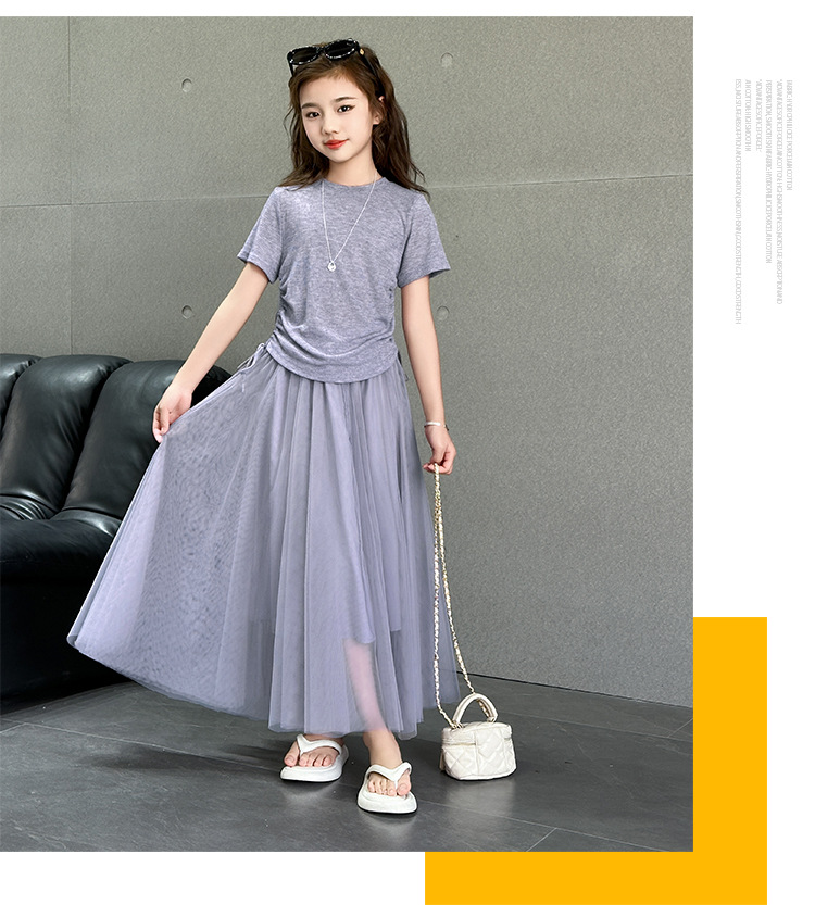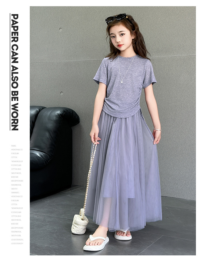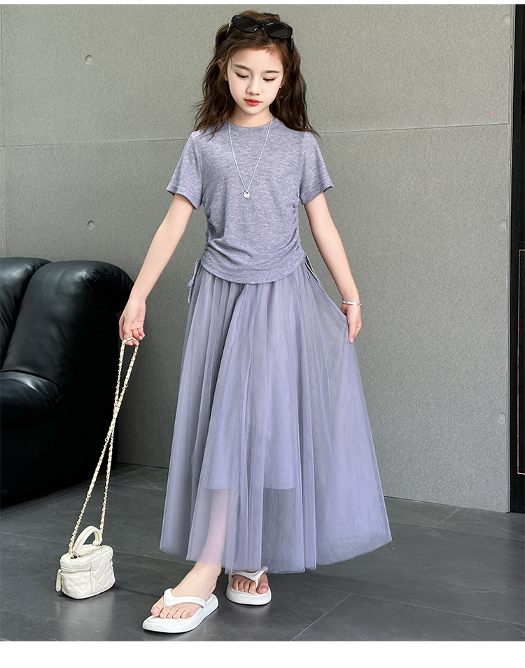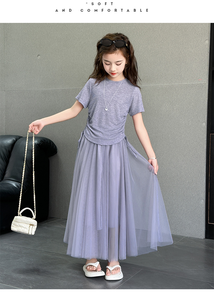 소녀 거즈 스커트 세트 2025 여름 새로운 큰 어린이 한국 스타일 유행 drawstring 짧은 소매 스커트 긴 스커트 투피스 패션