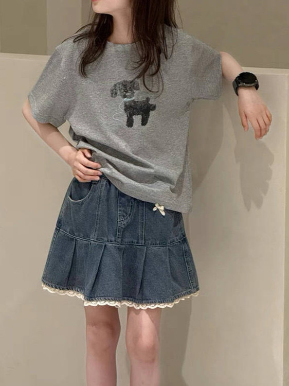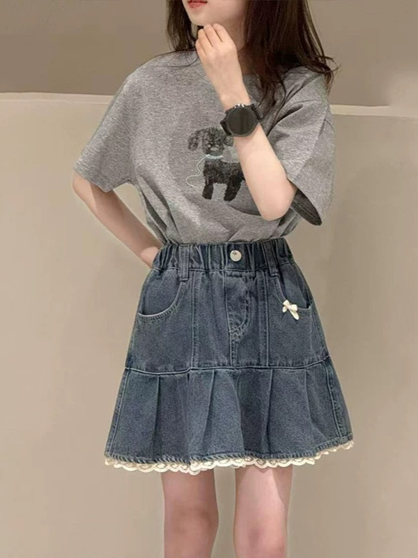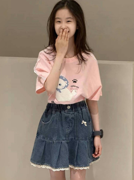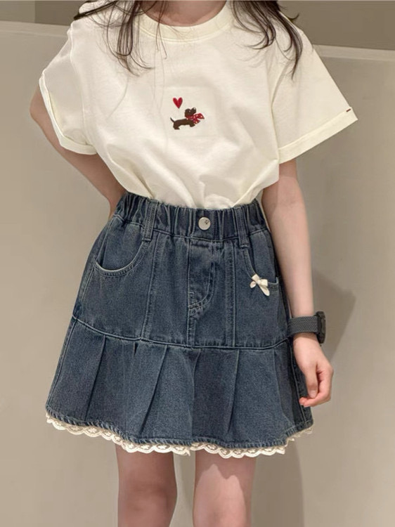 소녀의 데님 스커트 여름 2025 새로운 도착 아기 소녀의 레이스 스커트 스타일 올 매치 스커트스토어 가기