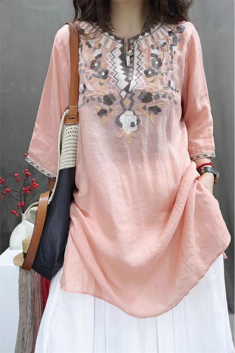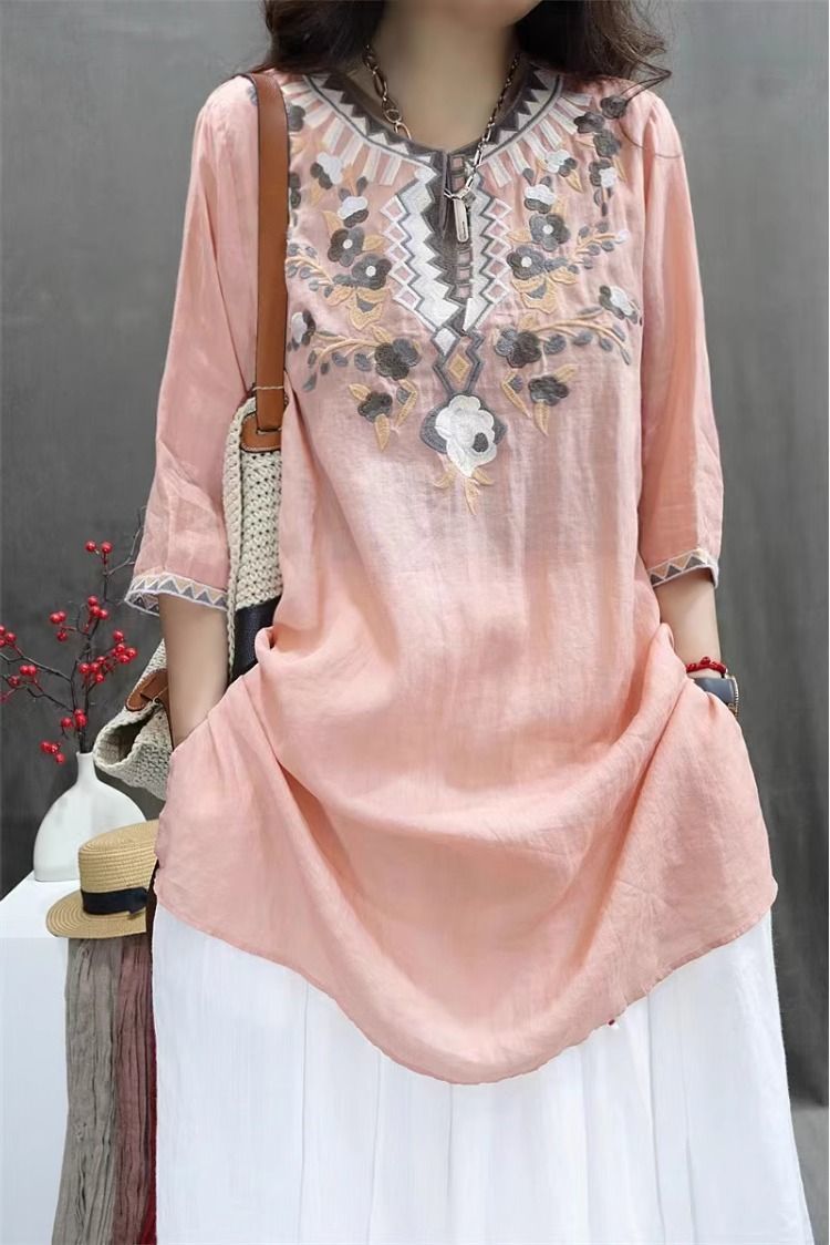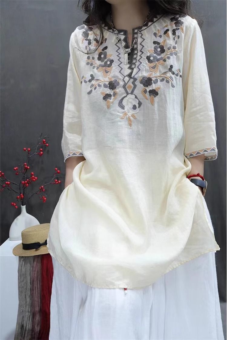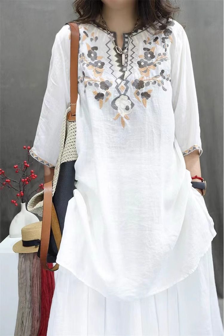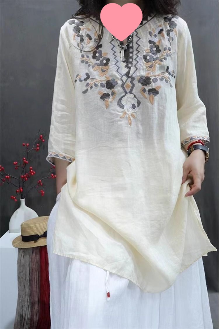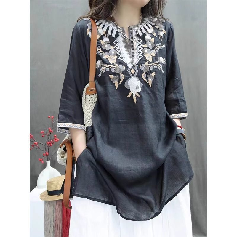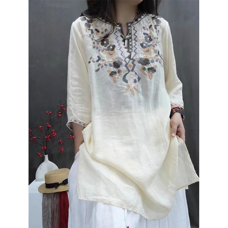 여름 중공업 여성복 복고풍 자수 중간 길이 루즈한 면 및 린넨 스타일 셔츠 캐주얼 예술적 풀오버 탑스토어 가기